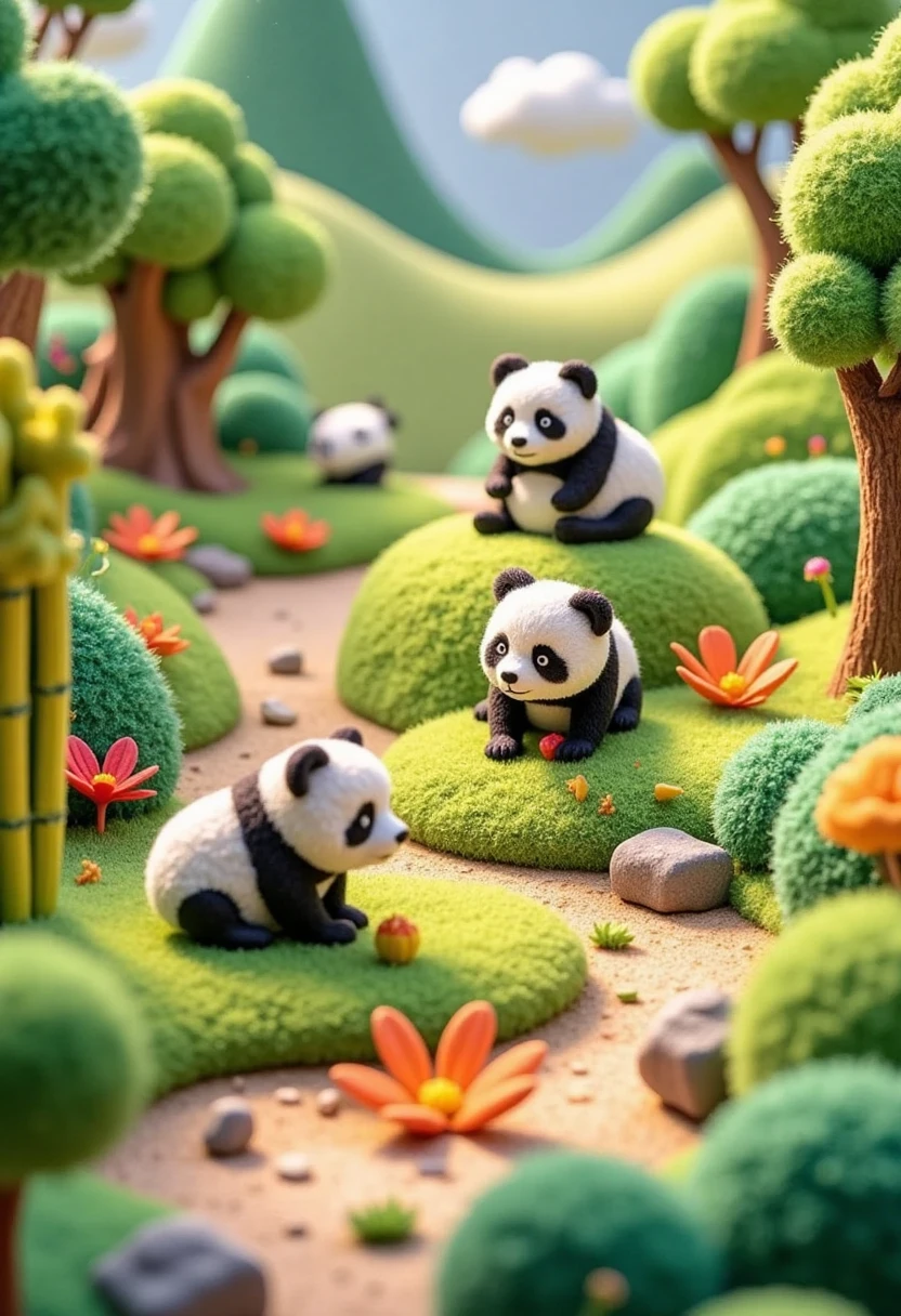 Miniature and vibrant 3D - style illustration of the Giant Panda Habitat, tiny pandas, bamboo forests in 3D, and rolling hill - like cushions.