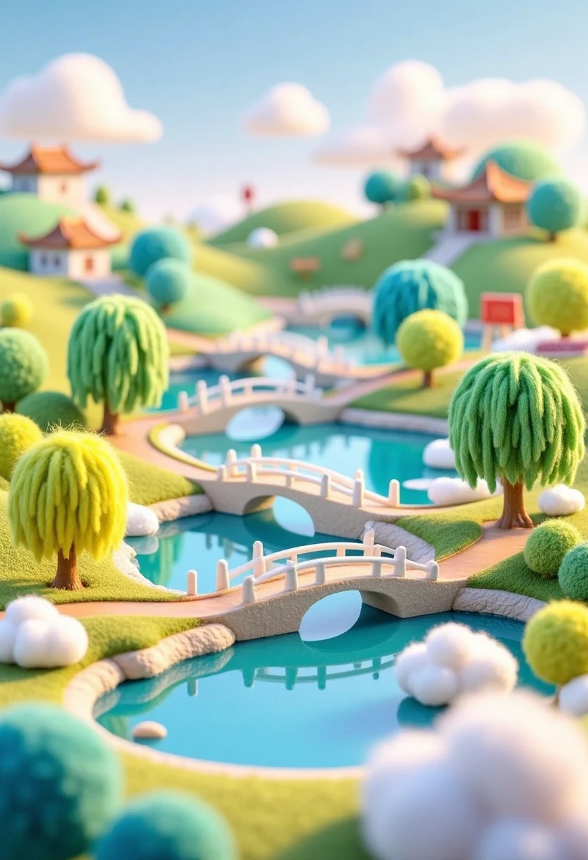 Miniature and vibrant 3D - style illustration of West Lake, small willow trees, slender bridges, and pastel - colored, cloud - shaped mist around.