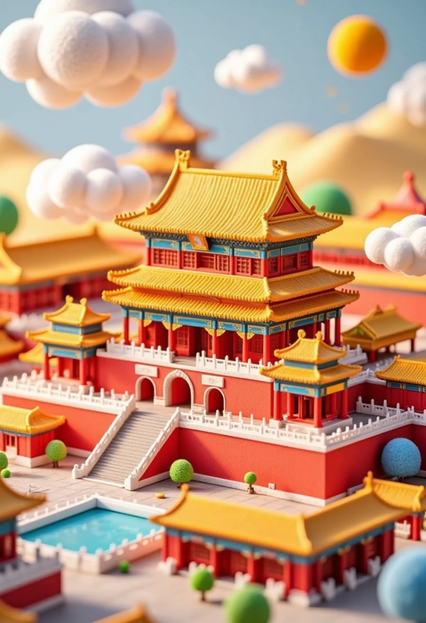 Miniature and vibrant 3D - style illustration of the Forbidden City, with tiny imperial palaces, red walls, and golden roofs, surrounded by cute cloud - like decorations.