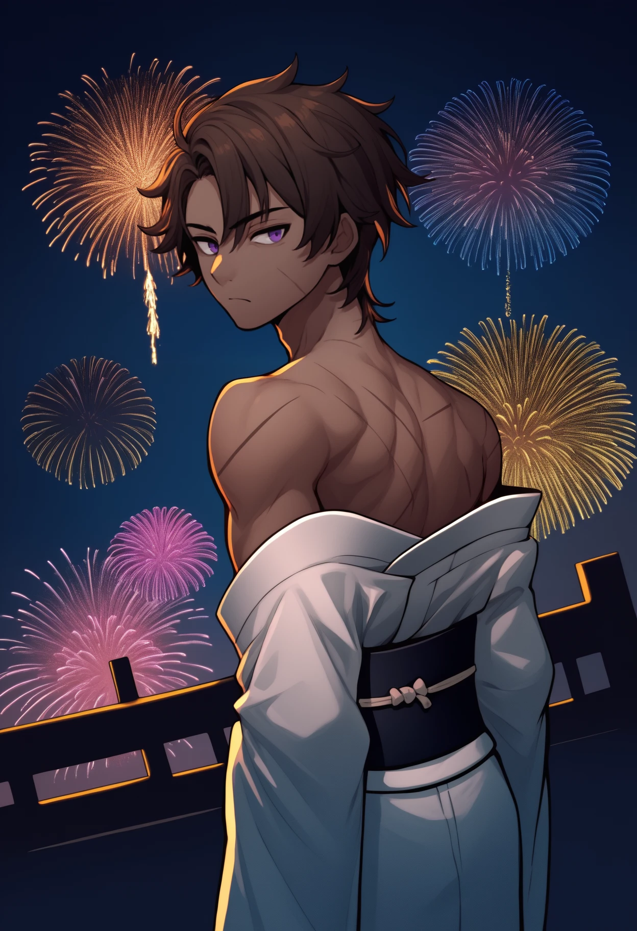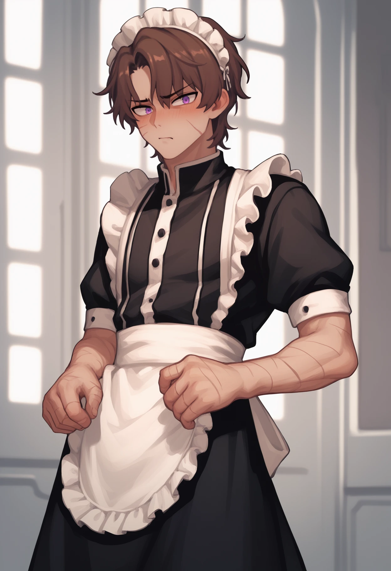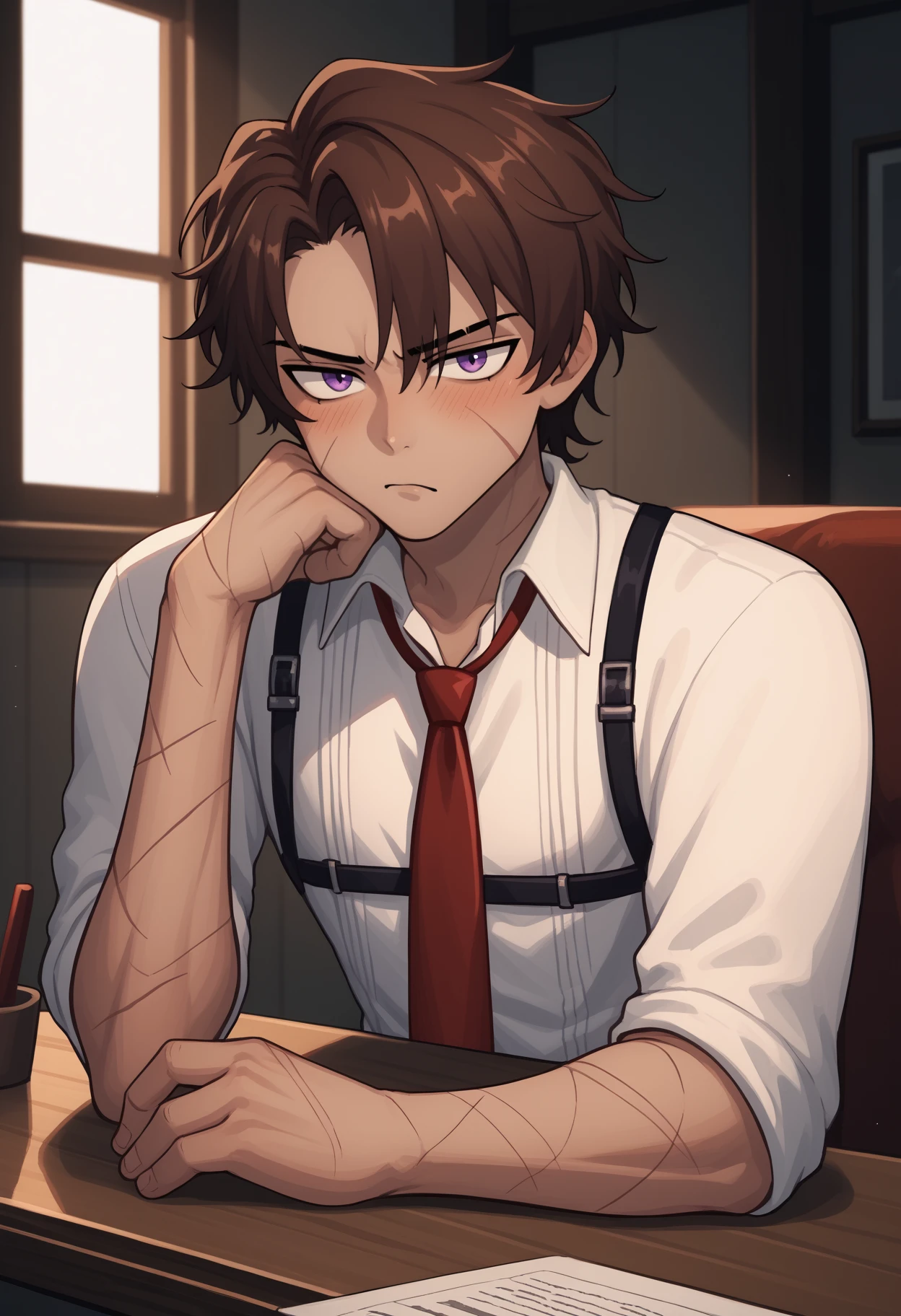 Trigger + Appearance: heathcliff, dark-skinned male, scar on face, scar on cheek, scar on arm, scar on hand, short hair, brown hair, purple eyes