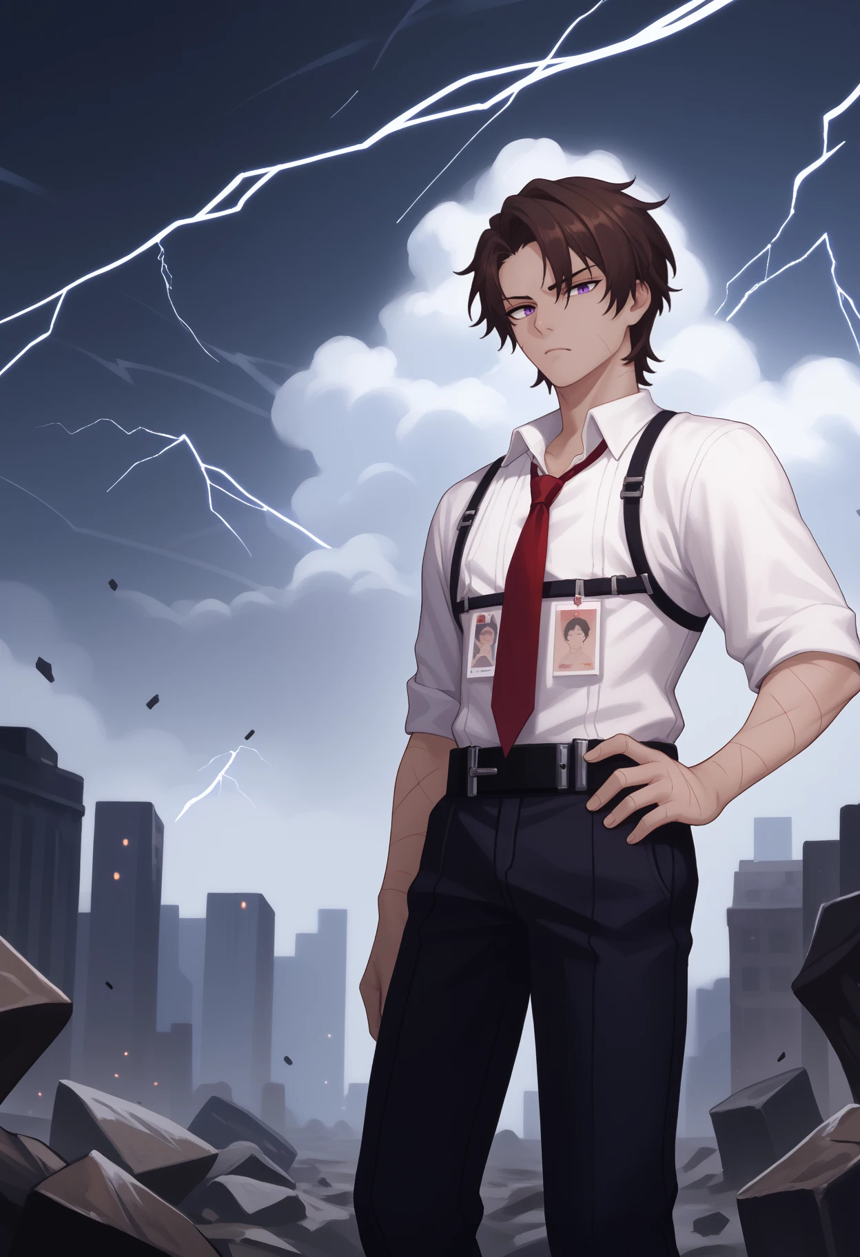 Default Outfit: white shirt, collared shirt, chest harness, red necktie, sleeves rolled up, black pants, black belt