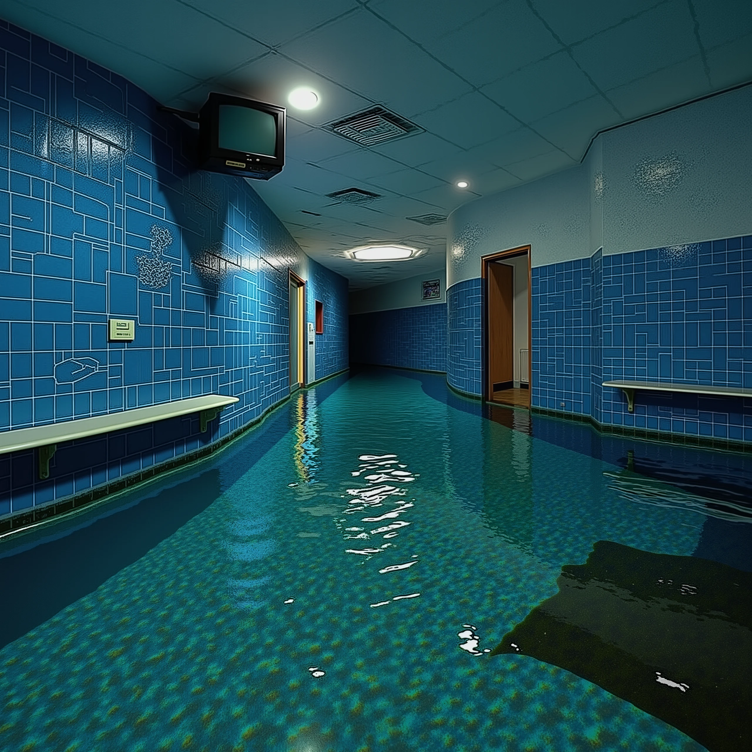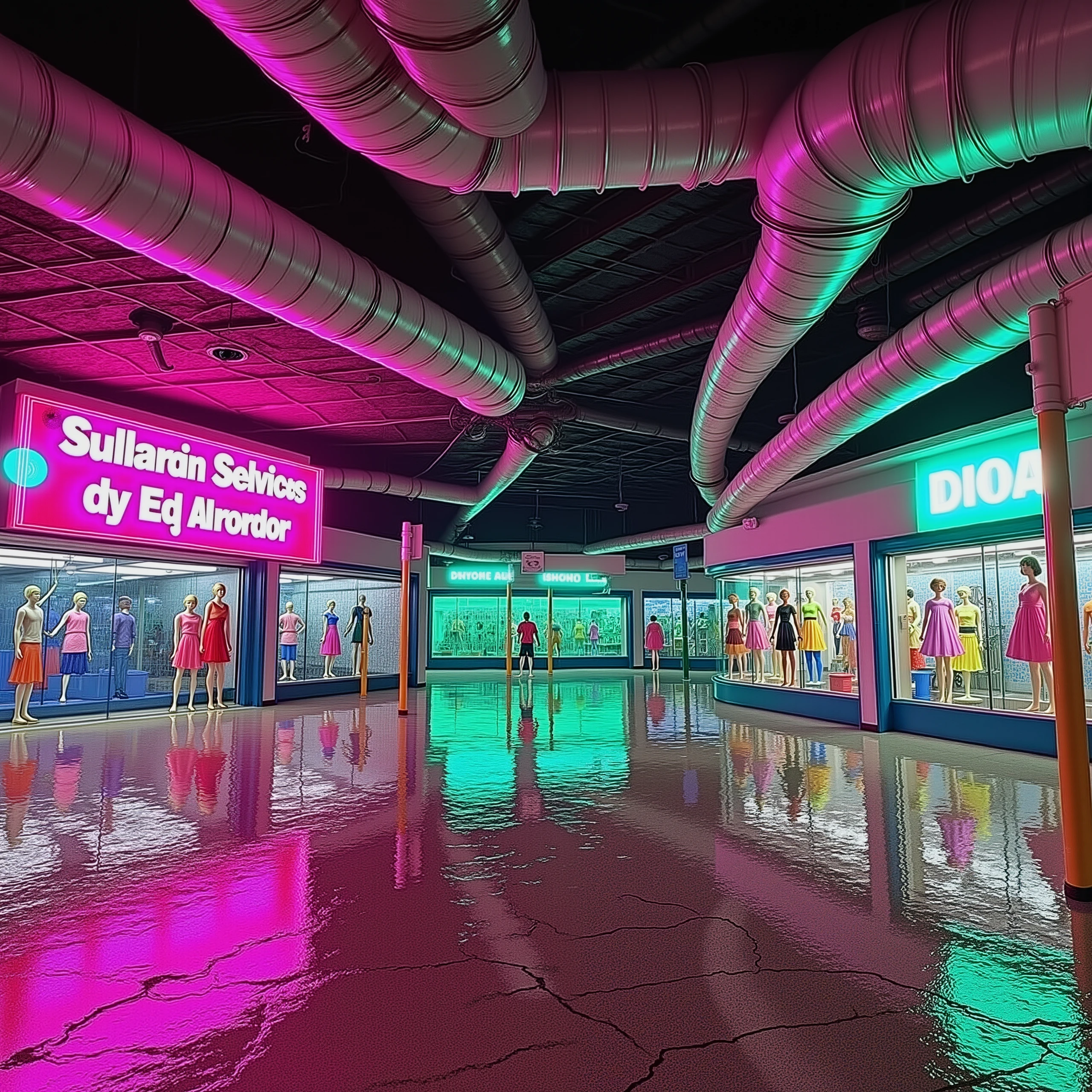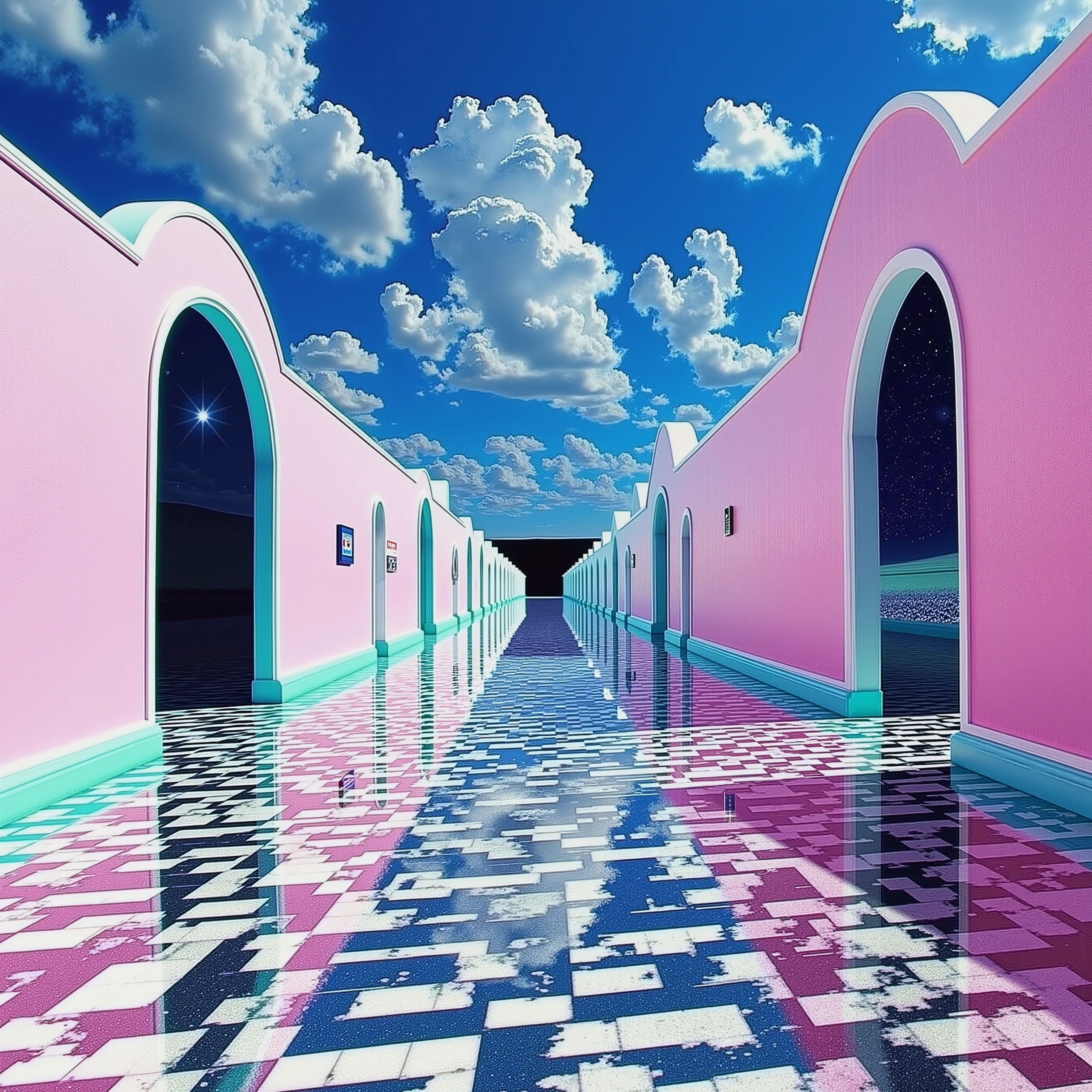• Dreamcore-77, abandoned mall flooded with pink light, glitchy architecture, floating grass and flowers, VHS distortion, liminal space aesthetics, pastel sky, dreamcore lighting, digital haze
