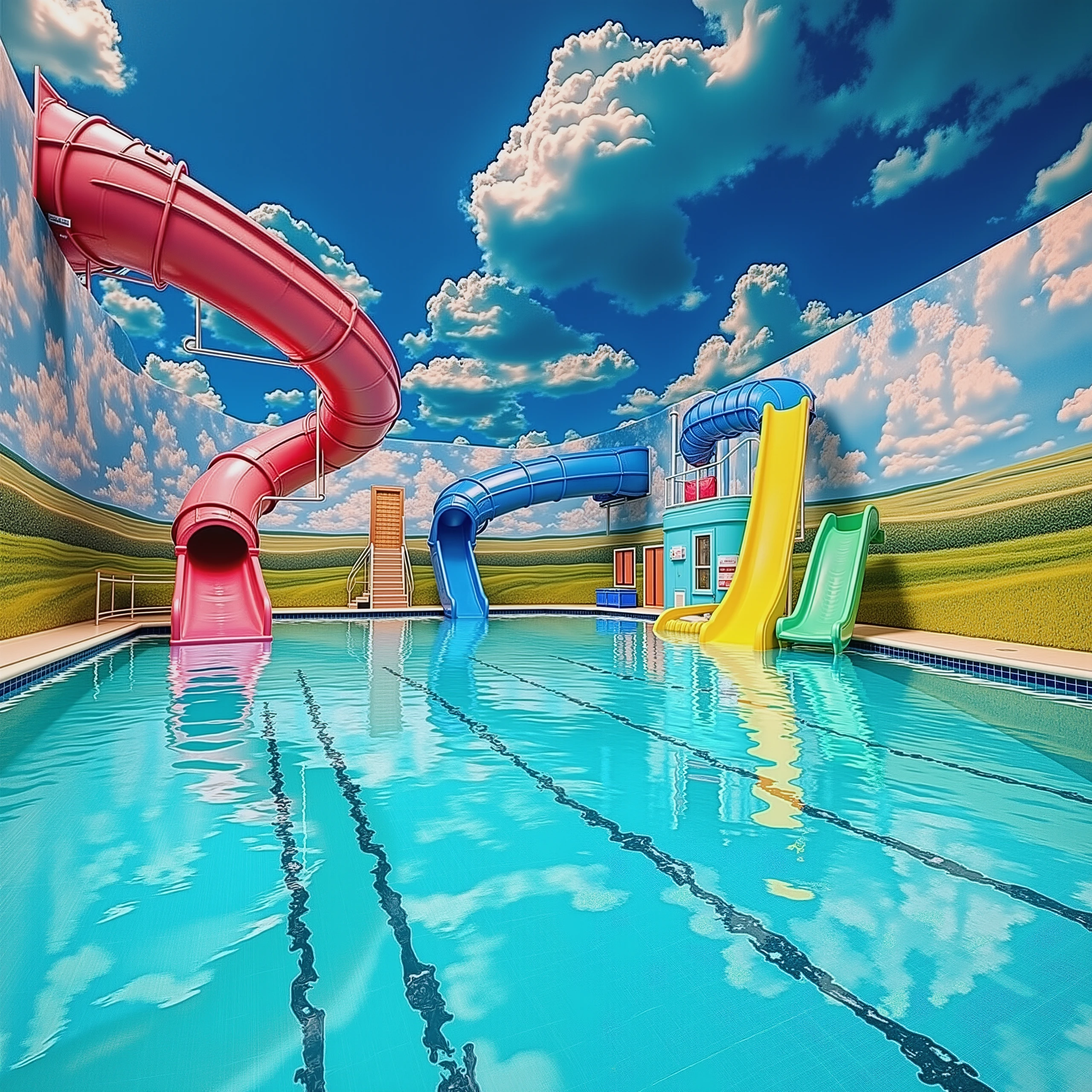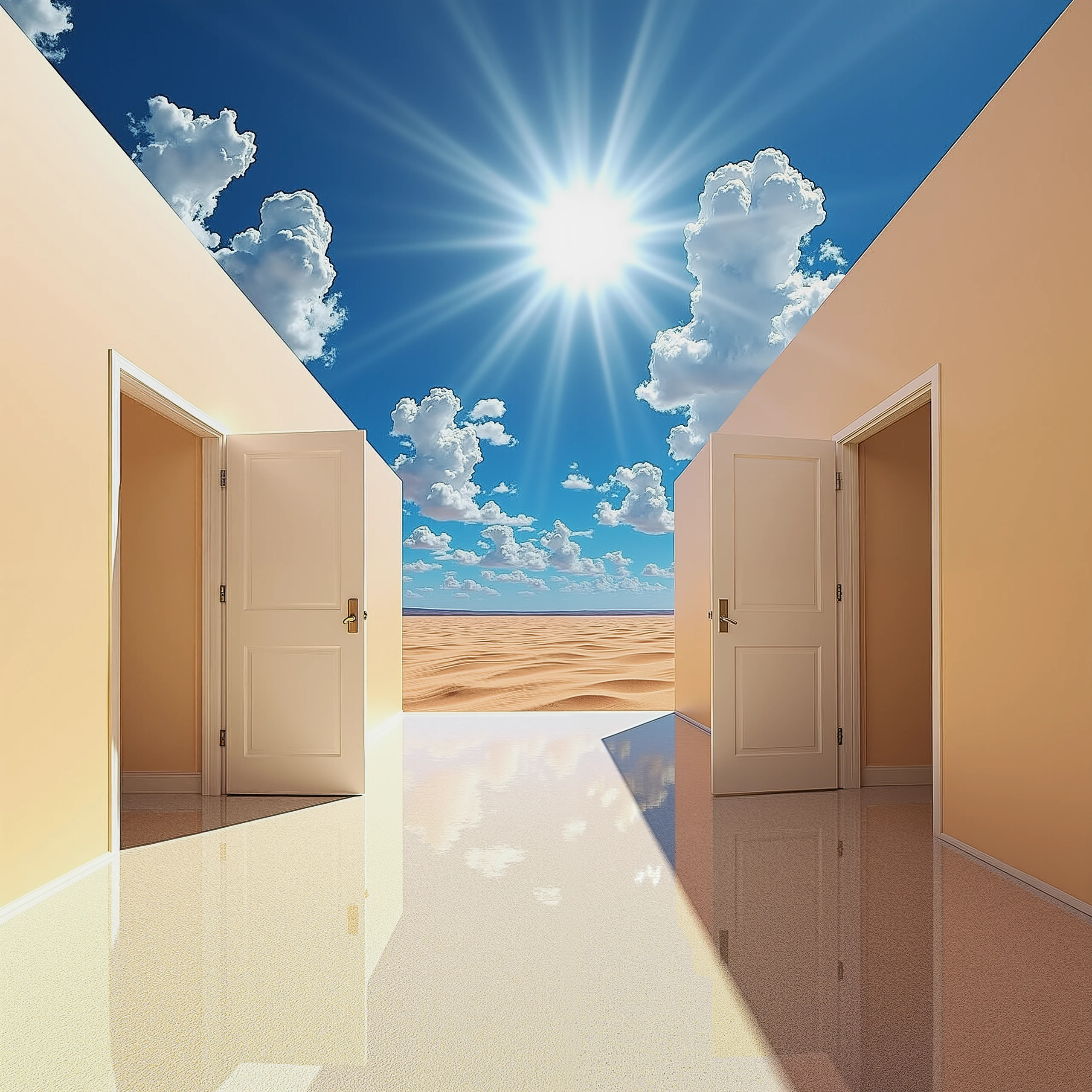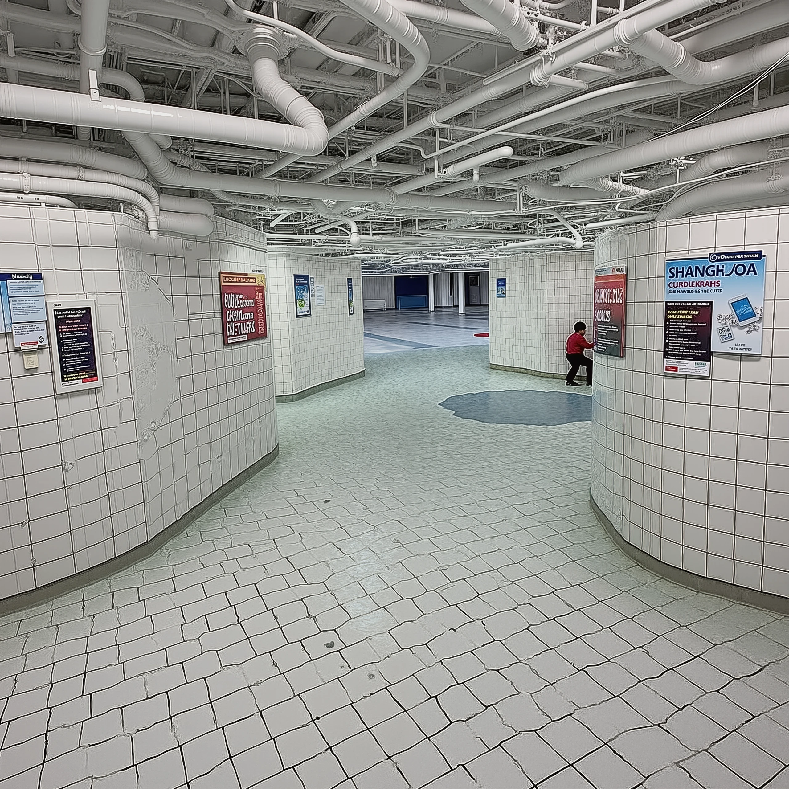 • Dreamcore-77, abandoned mall flooded with pink light, glitchy architecture, floating grass and flowers, VHS distortion, liminal space aesthetics, pastel sky, dreamcore lighting, digital haze