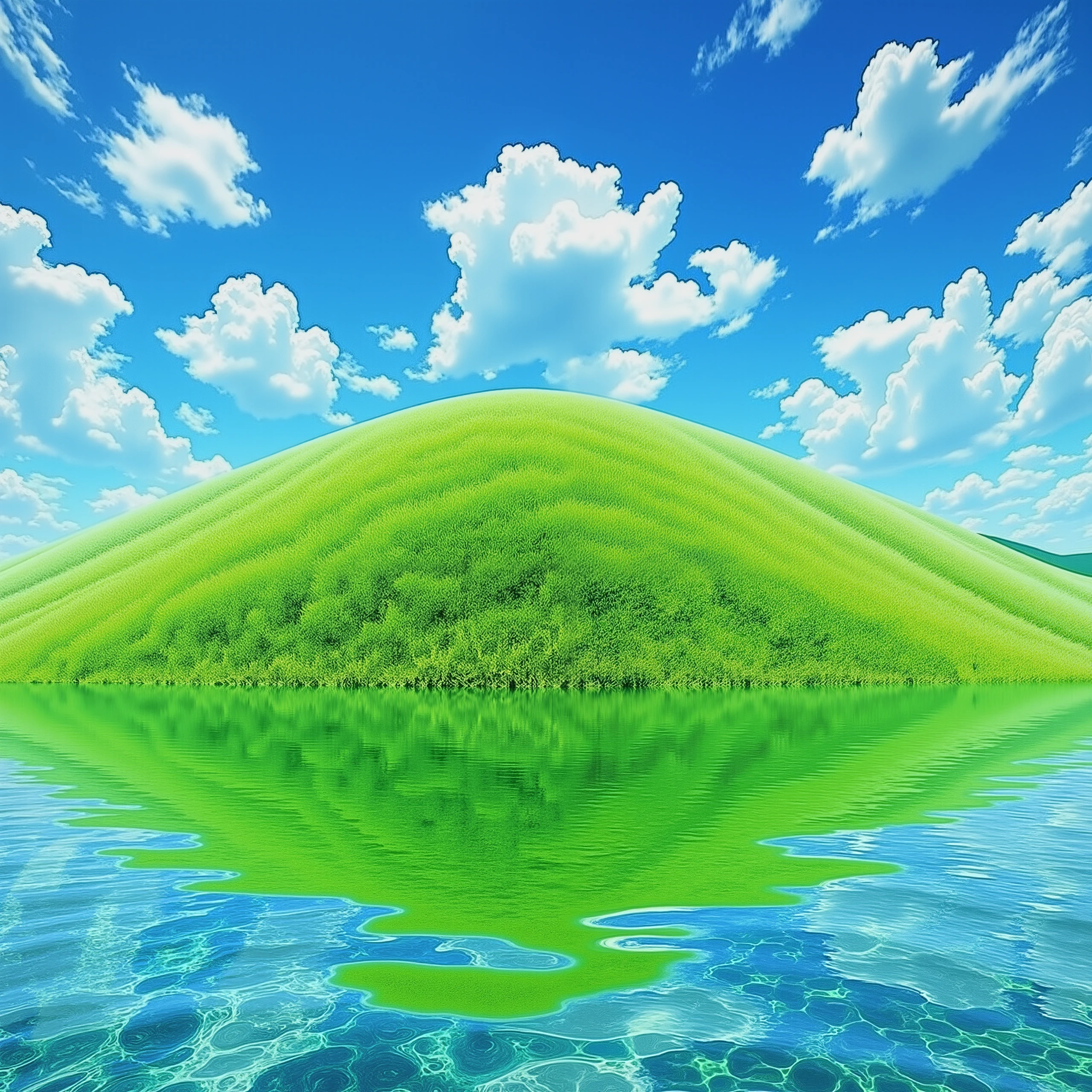 • Dreamcore-77, soft mountains emerging from a glowing ocean, sunburst clouds above, hyper-real textures, nature and technology fusion, dreamy color palette, reflective water surface