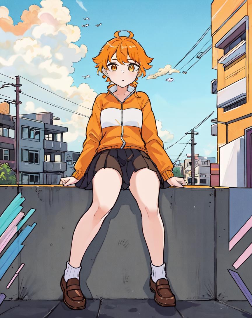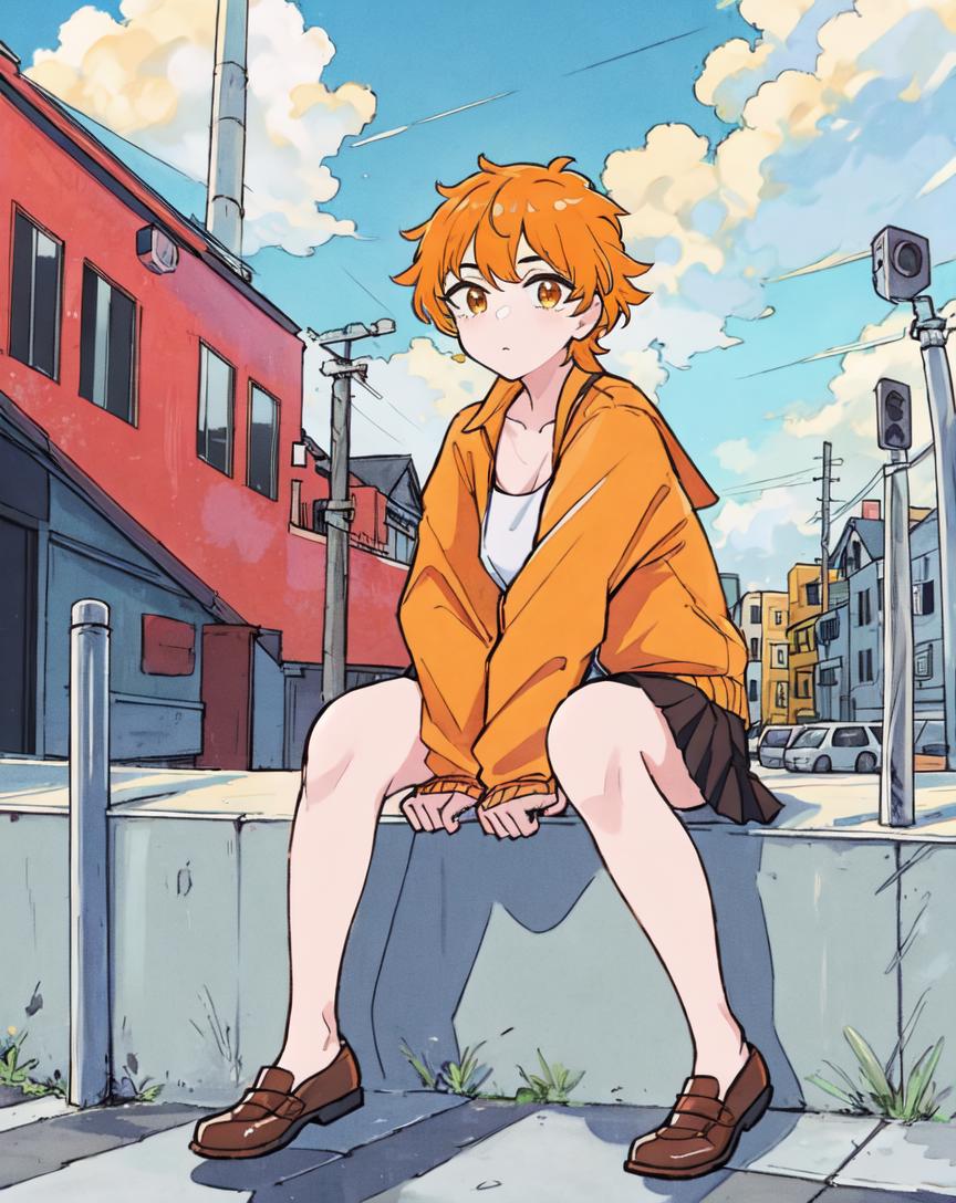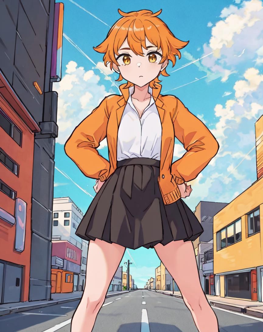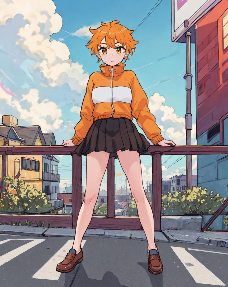 Recommended prompts if you want to more close to original character: 1girl, (((solo))), chita_(yancha gal), small breast, orange jacket, black skirt, school shoes, orange hair, long legs, (((large legs))), adult character