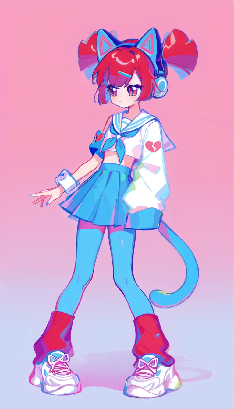 BuroJKOutfit, blue print armband, single white wrist cuff, blue cat ear headphones,midriff, single bare arm,single sleeve past fingers, white sailor shirt, white sailor collar, single wide sleeve, blue neckerchief, blue pleated skirt, miniskirt, red loose socks, sneakers, navelFor new style: blue cat tail