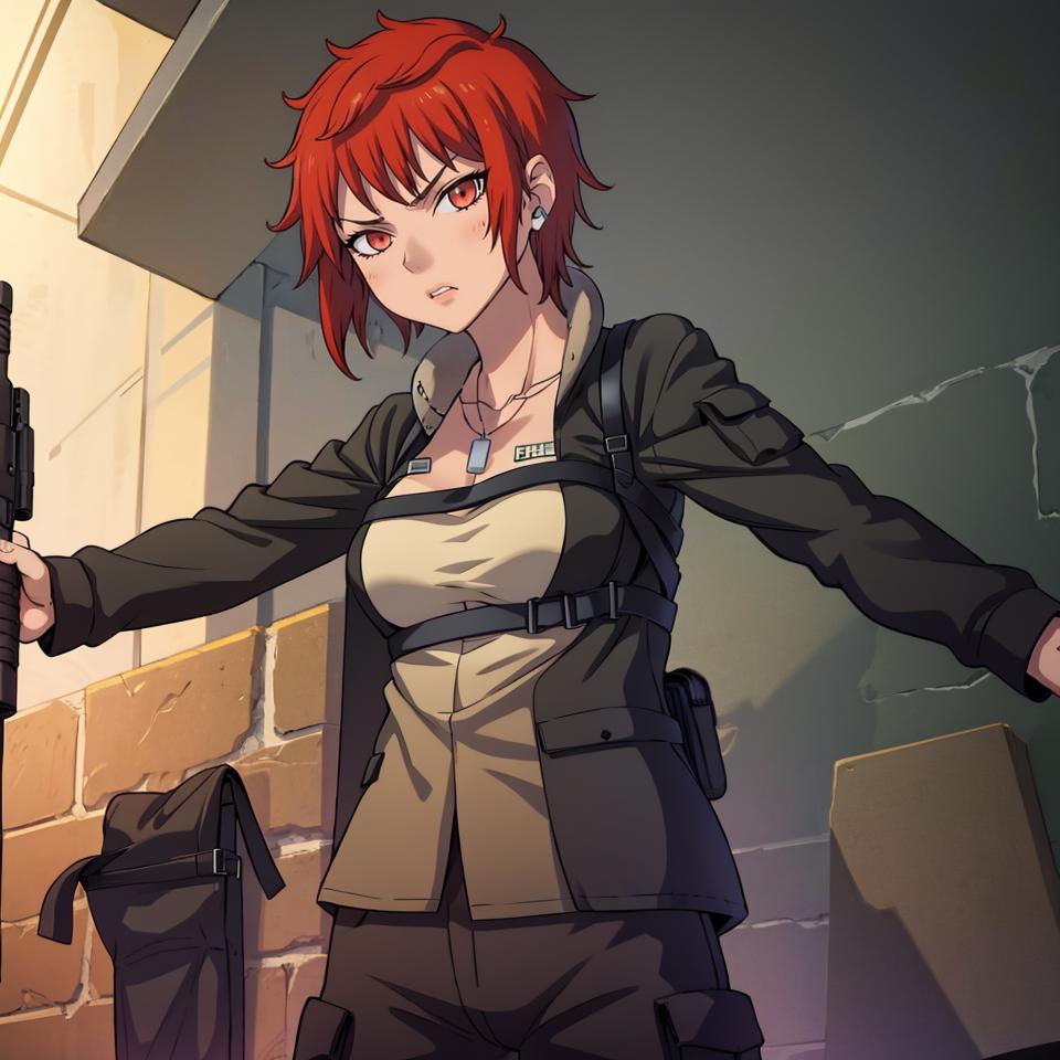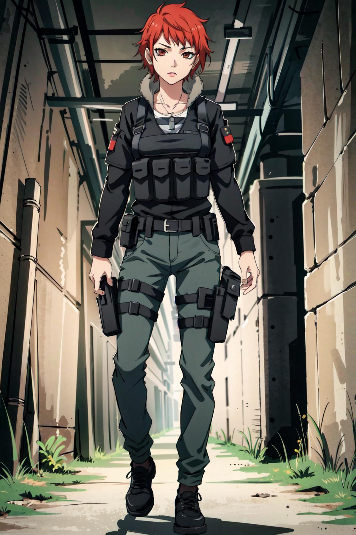 For her normal outfit it's "military uniform, black jacket, dog tags, pants"