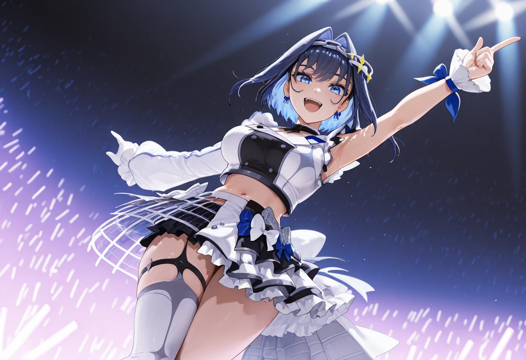 kroniidol, short hair, hair intakes, chain, bow, idol clothes, skirt, single thighhighs, wrist cuffs, midriff, navel, Hololive Summer 2023: