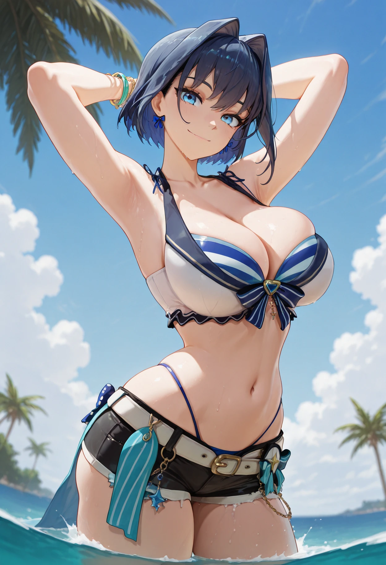 kroniiswim, short hair, hair intakes, swimsuit, black shorts, navel, collarbone, I use prefectiousXLNSFW_v10 for all my images and sometimes style lora. Enjoy!