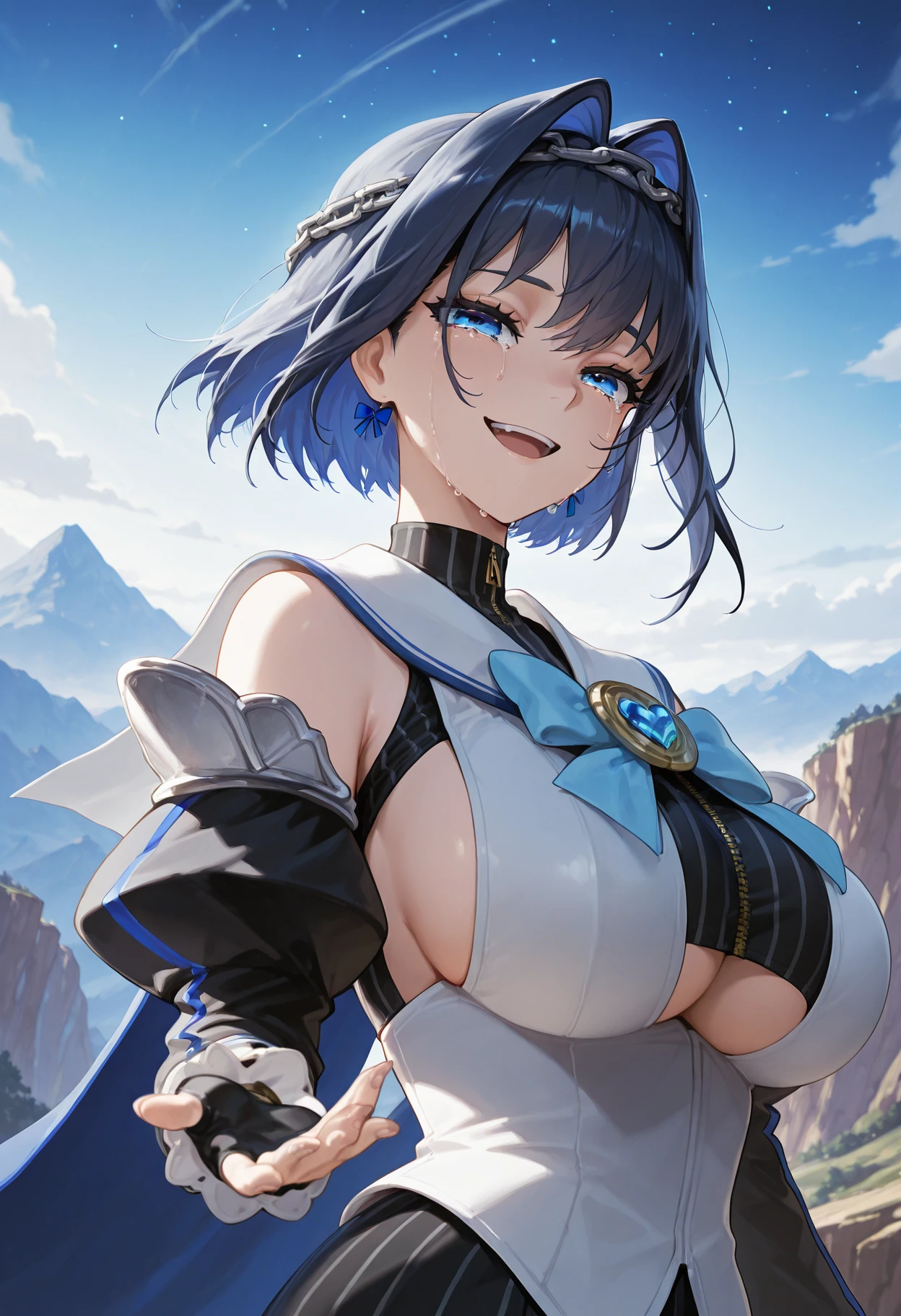 kroniidef, short hair, hair intakes, blue bow, detached sleeves, chain, black gloves, underboob cutout, sailor collar, striped crop top, clothing cutout, white vest, black skirt, blue cape,
