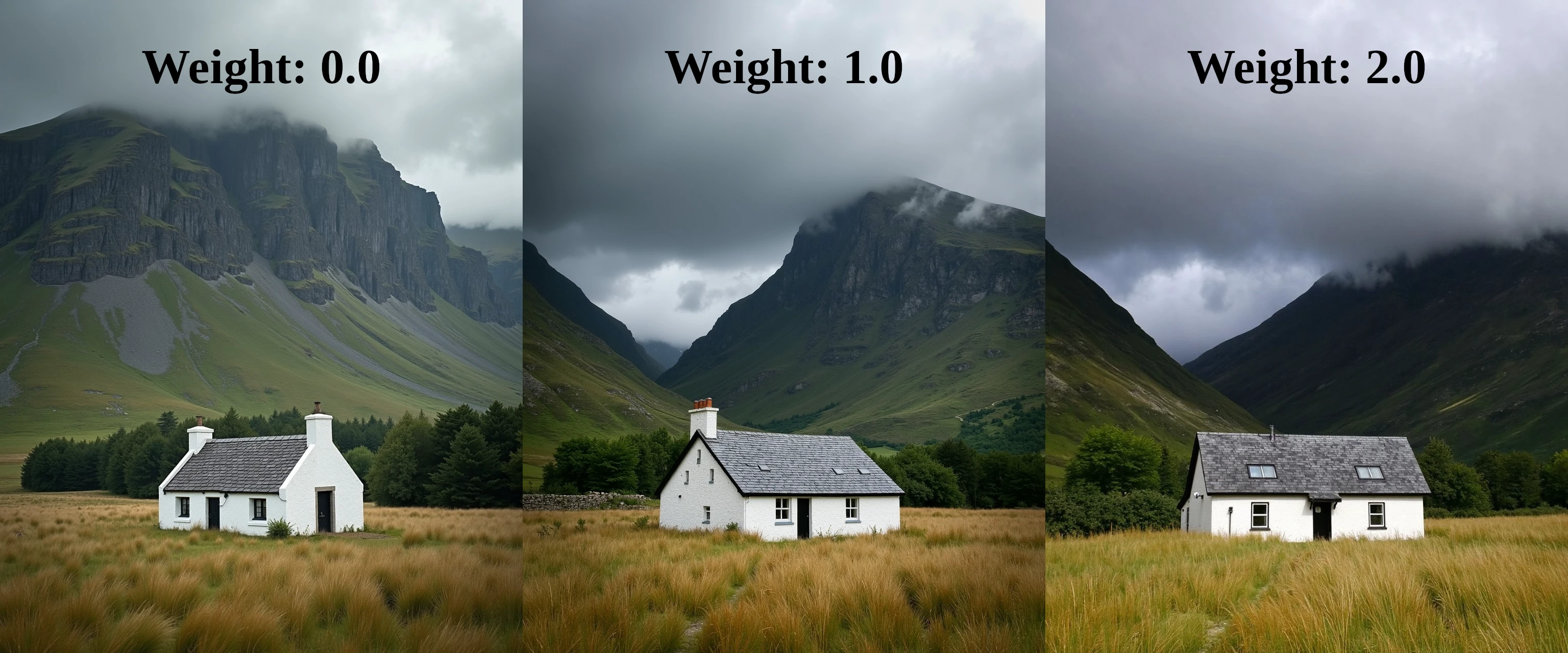 ultrasharp photograph, white and green, central focus. this photograph captures a serene, rural landscape dominated by a quaint, white, single-story cottage nestled in a vast, open field. the cottage, centrally positioned, features a steep, dark grey slate roof with several small, square windows and a black door. the structure appears rustic and charming, with a chimney extending from the roof's right side. the field surrounding the cottage is a lush, golden-brown grassland, slightly overgrown and wild, with tall, swaying grasses that seem to gently sway, hinting at a light breeze. the background is dominated by a majestic, rugged mountain range with steep, rocky slopes that transition into a verdant, green plateau at the top. the mountain's texture is rough, with exposed rock and patches of green vegetation, indicating a high altitude and possibly a remote, isolated location. the sky above is a dramatic, moody backdrop, filled with a mix of dark, stormy clouds and lighter, wispy cirrus clouds, suggesting an impending change in weather. the trees, sparse but dense, are a dark, rich green, adding depth to the scene and framing the cottage. the overall mood is tranquil yet slightly foreboding, evoking a sense of isolation and natural beauty. the photograph captures the essence of rural, highland scenery in a raw, untouched state.