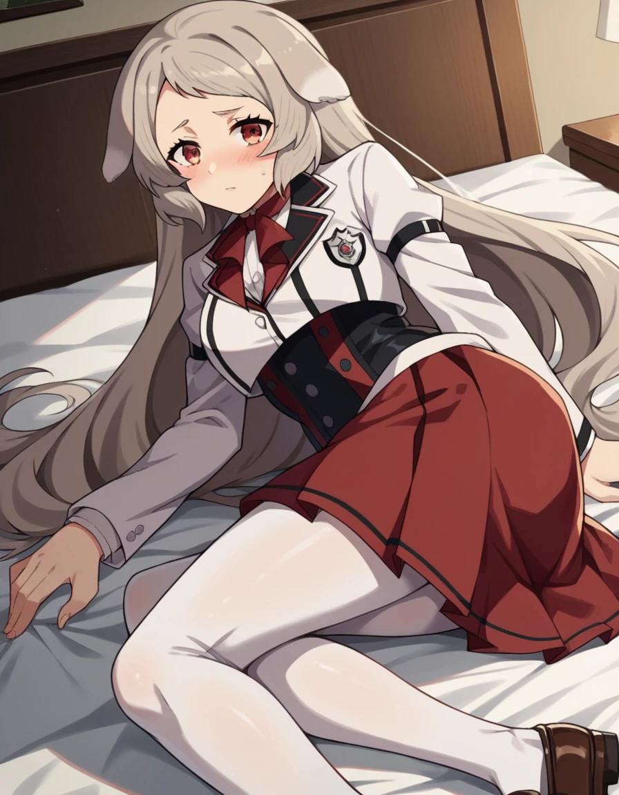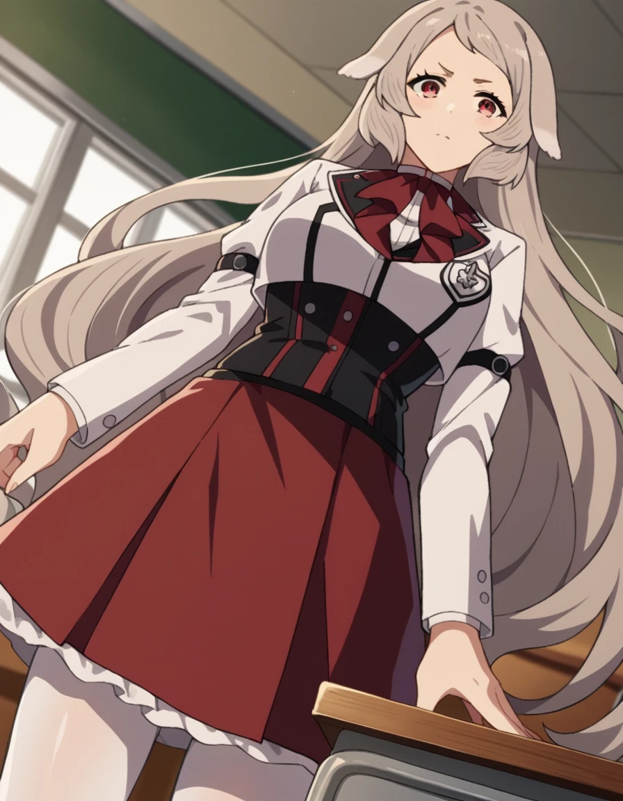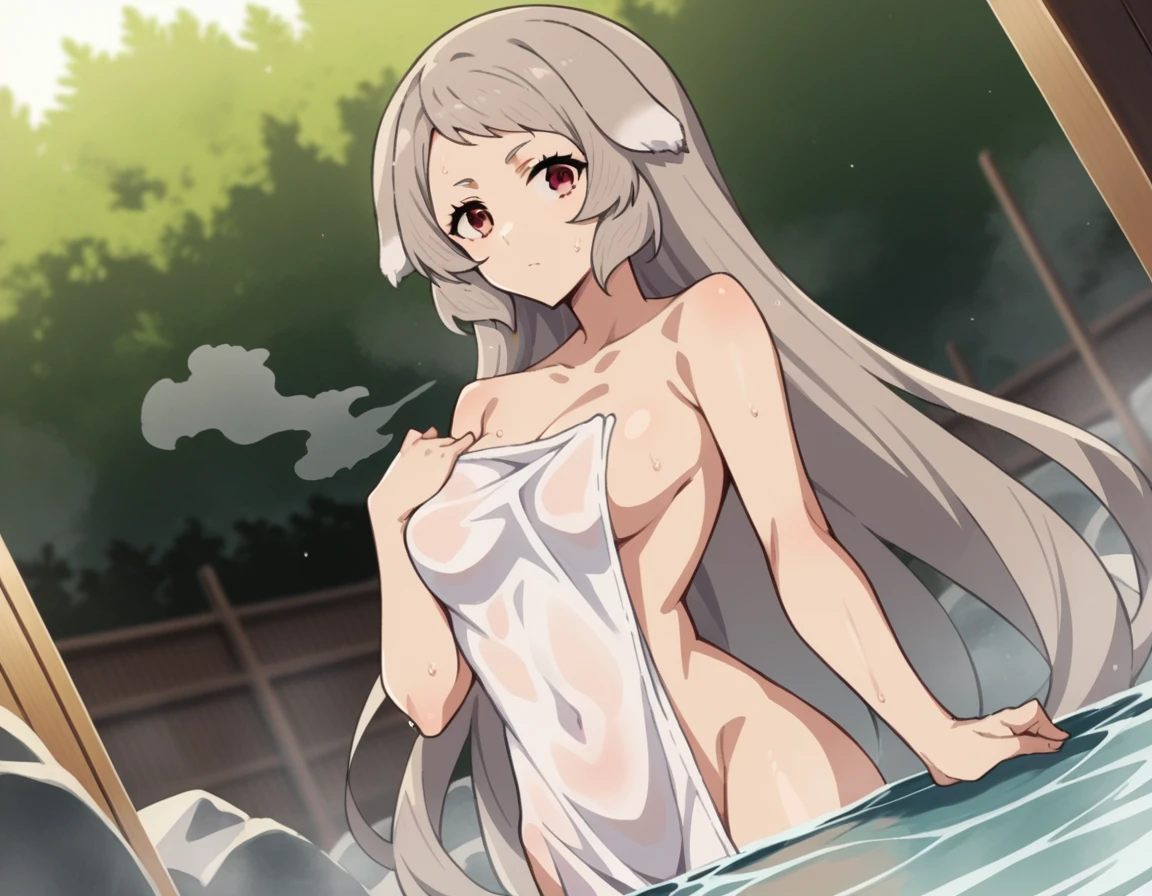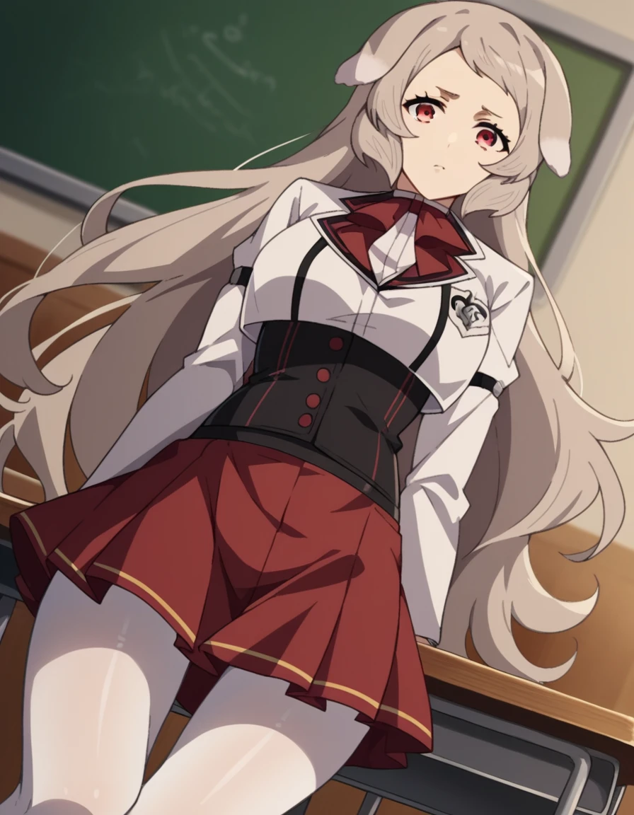 pursena adoldia, long hair, red eyes, animal ears, very long hair, grey hair,