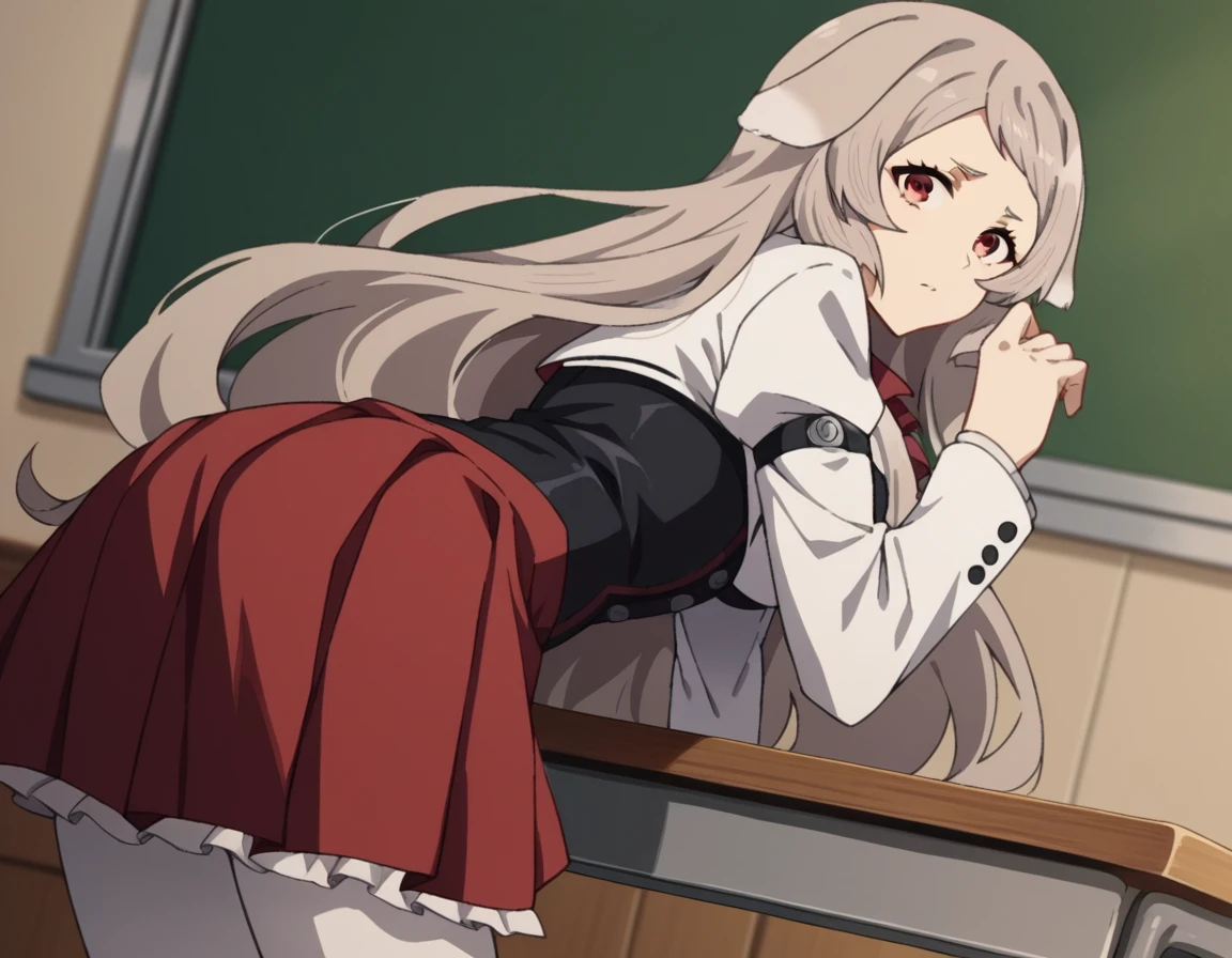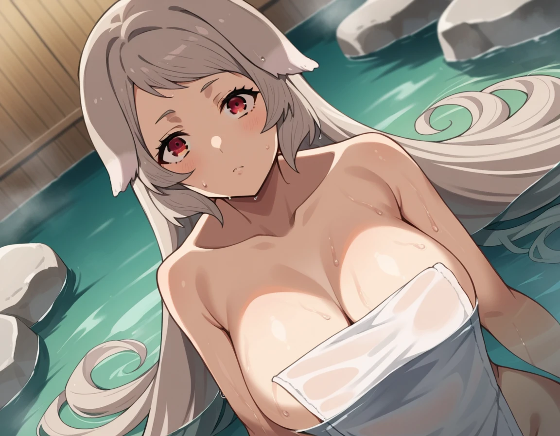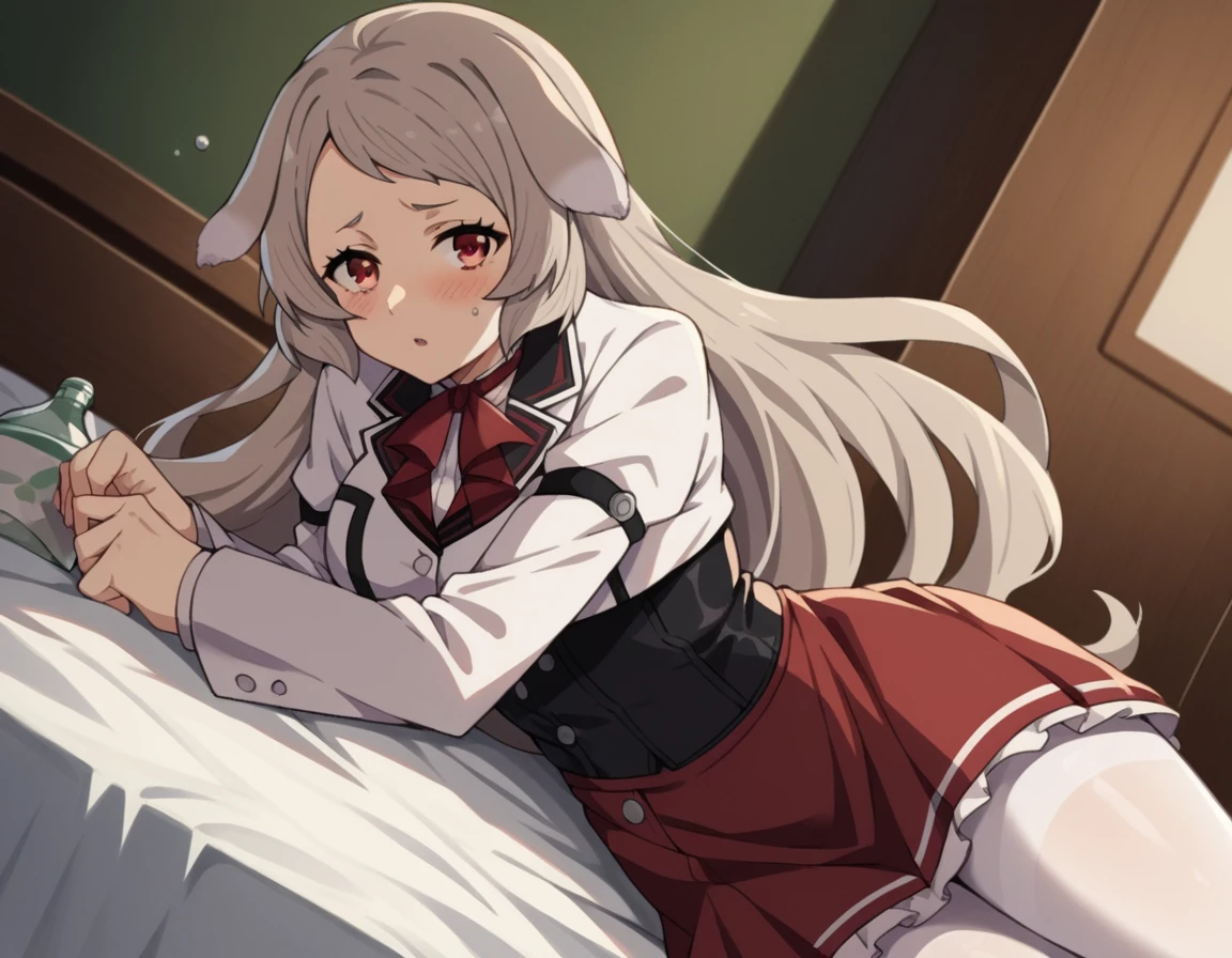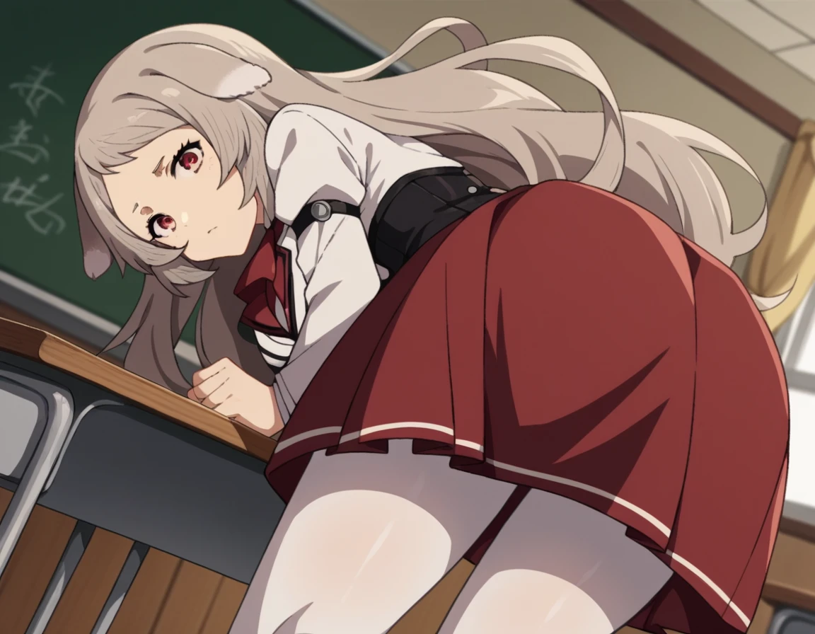 pursena adoldia, long hair, red eyes, animal ears, very long hair, grey hair,