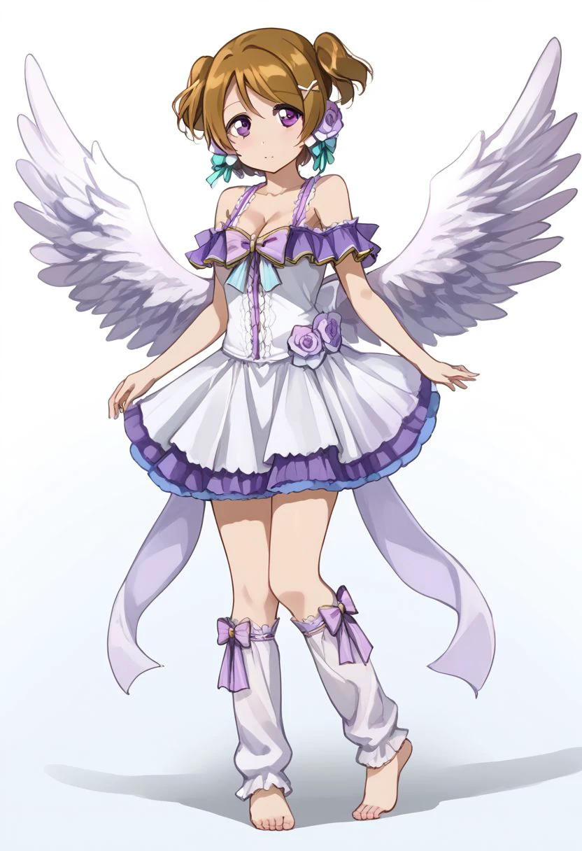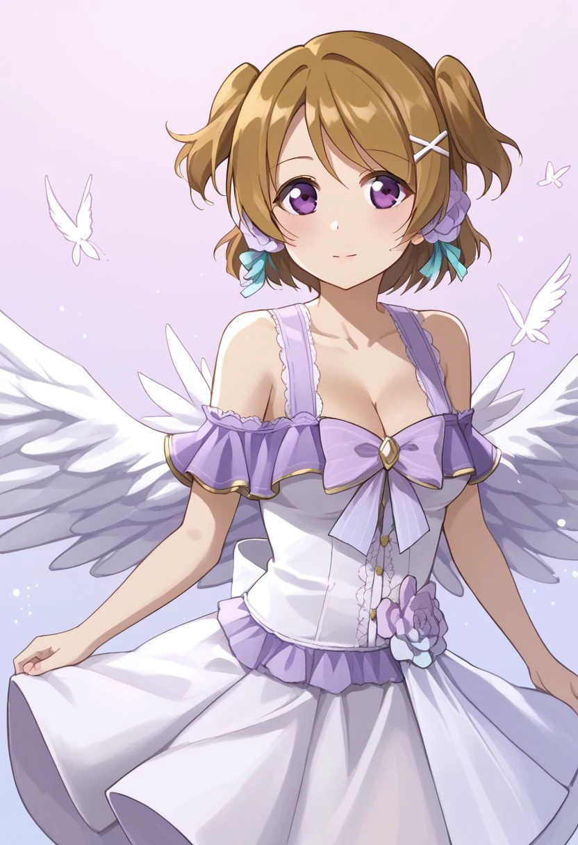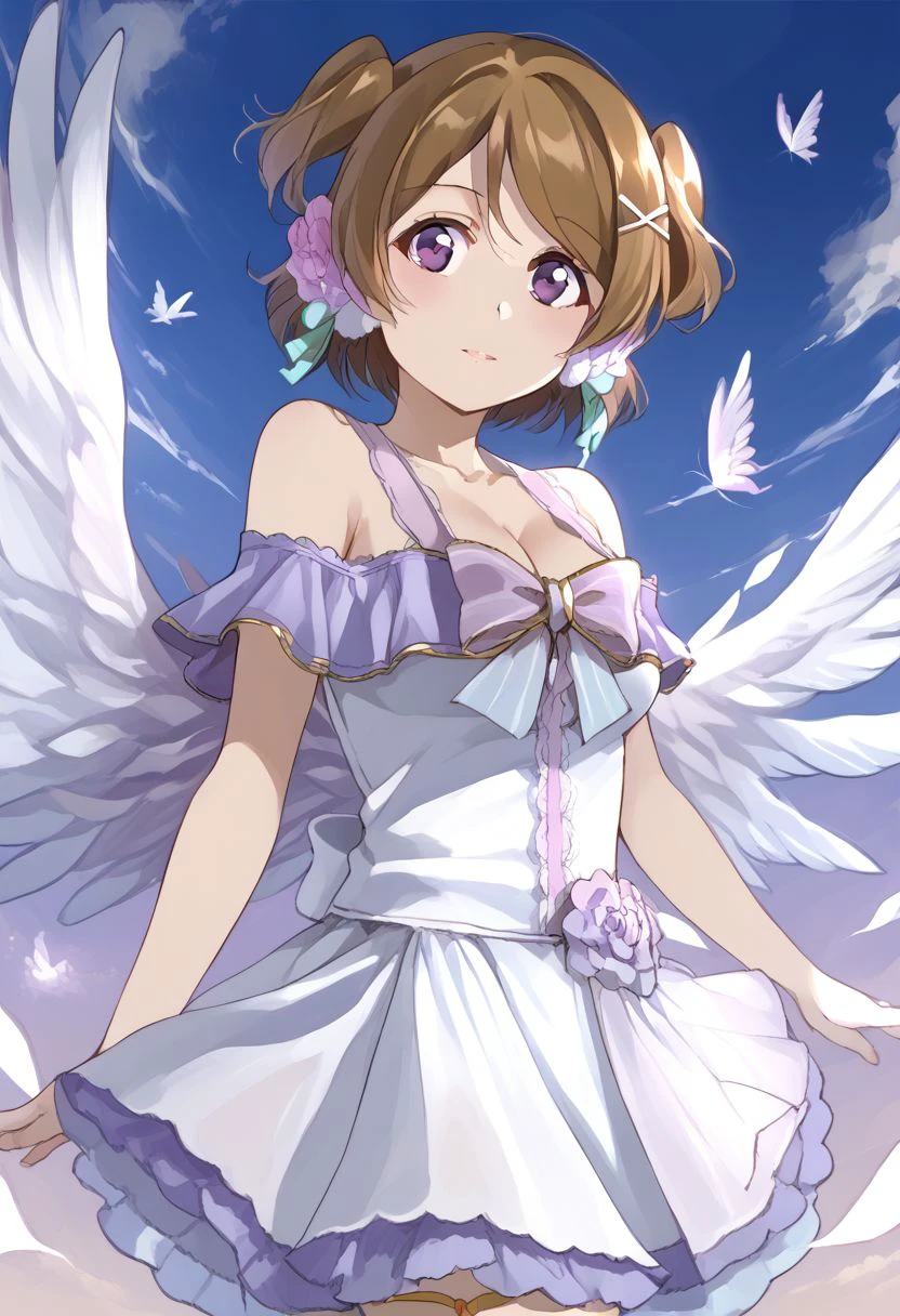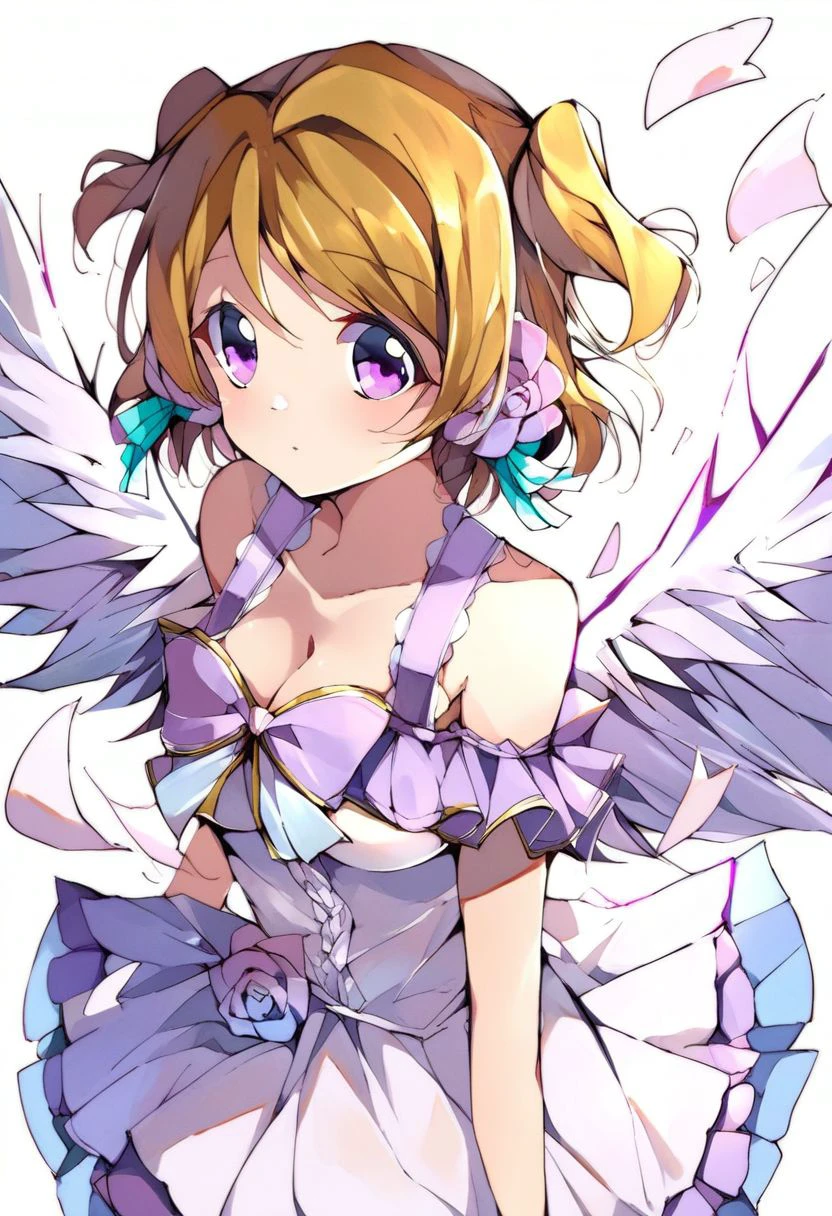 short hair, brown hair, two side up, purple eyes, white dress, bare shoulders, cleavage, angel wings, flower, ribbon, bow