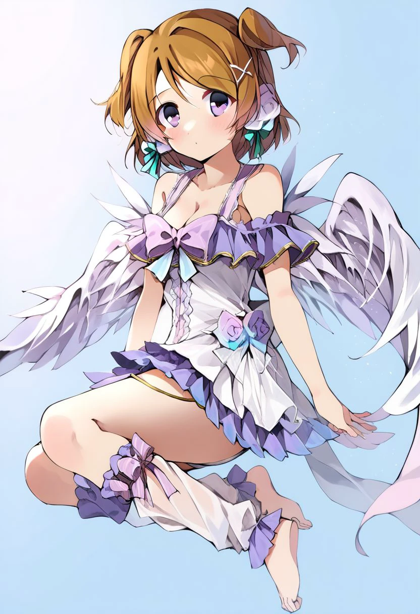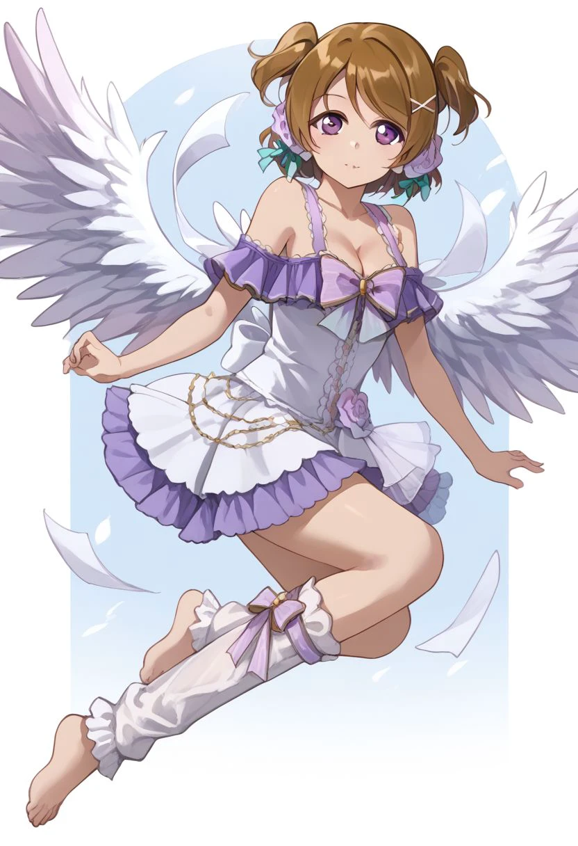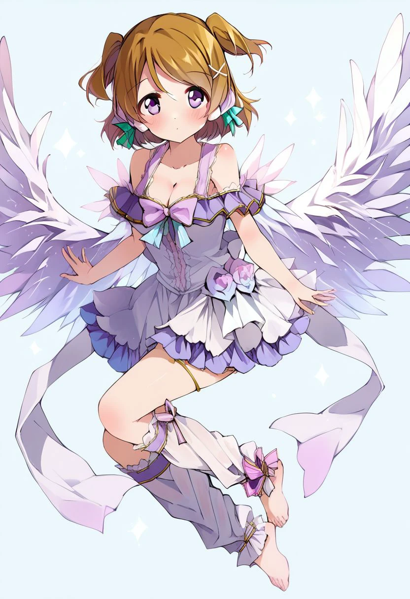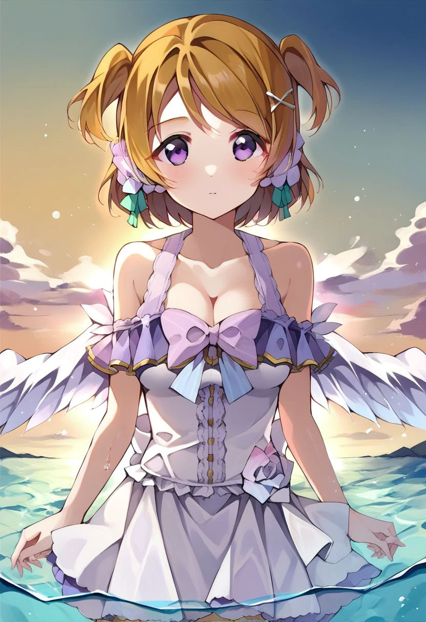 short hair, brown hair, two side up, purple eyes, white dress, bare shoulders, cleavage, angel wings, flower, ribbon, bow