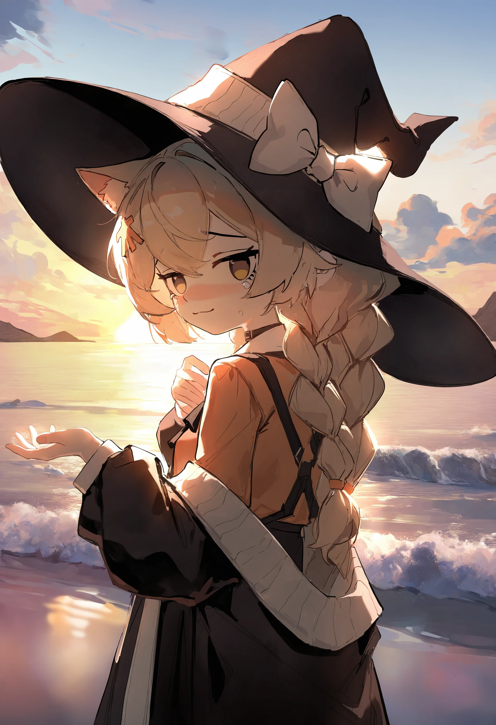 benzimofashi,1girl,braid,witch hat,blonde hair,cat ears,bow,hair ornament,off shoulder,twin braids,yellow eyes,brown eyes,orange shirt,black jacket,open jacket,bowtie,sleeves past,white ribbon on hat,white bow,如果你喜欢我的lora,欢迎来我的爱发电支持我,也可以定制角色/画风lora(爱发电推送机制有问题,如果没有回复请在c站私信)。闲鱼同名Wenaka_,多平台同名