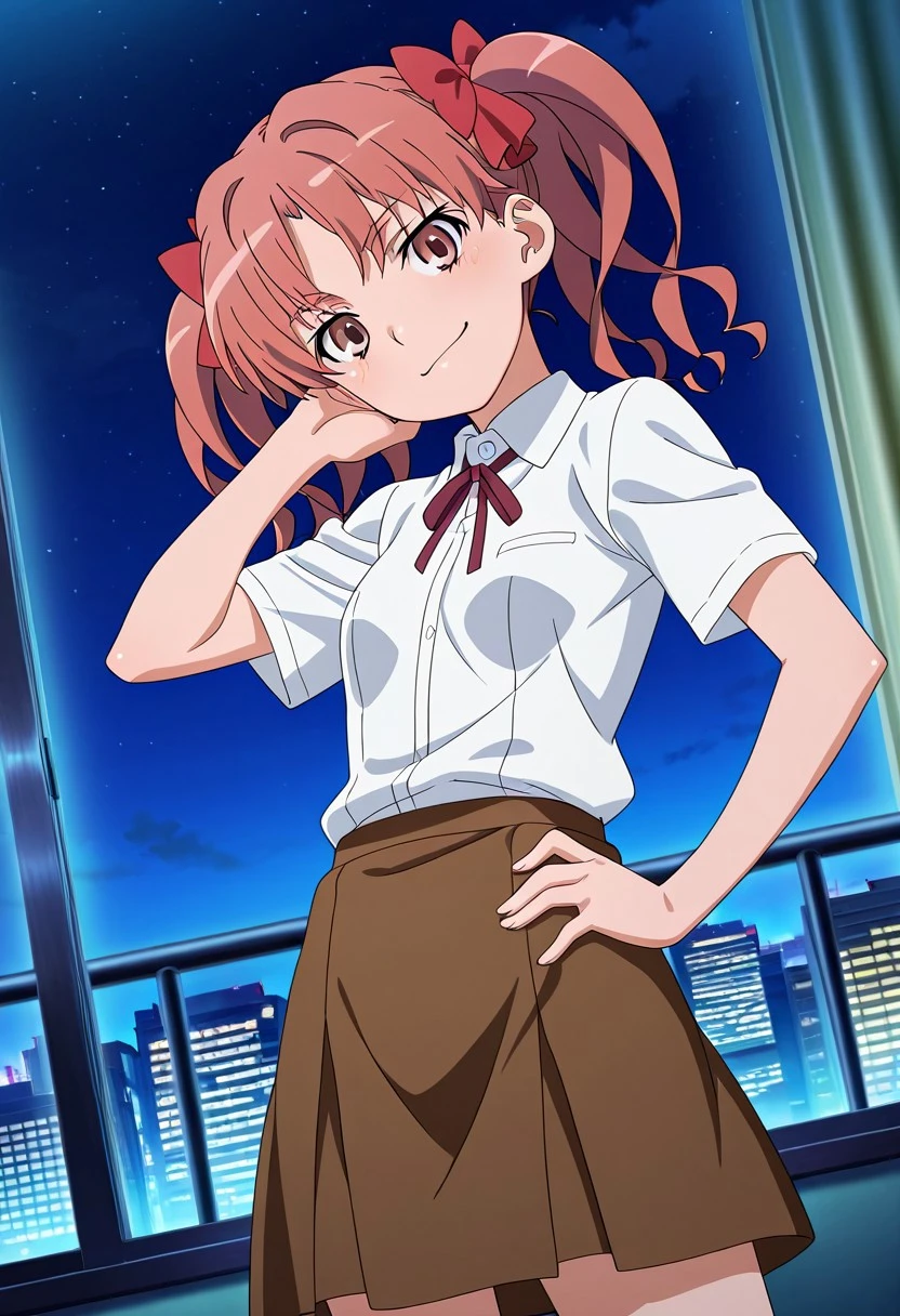 Kuroko,red hair, twintails, wavy twintails, short_hair, hair ribbon, red ribbon, brown_eyes, small breasts,
