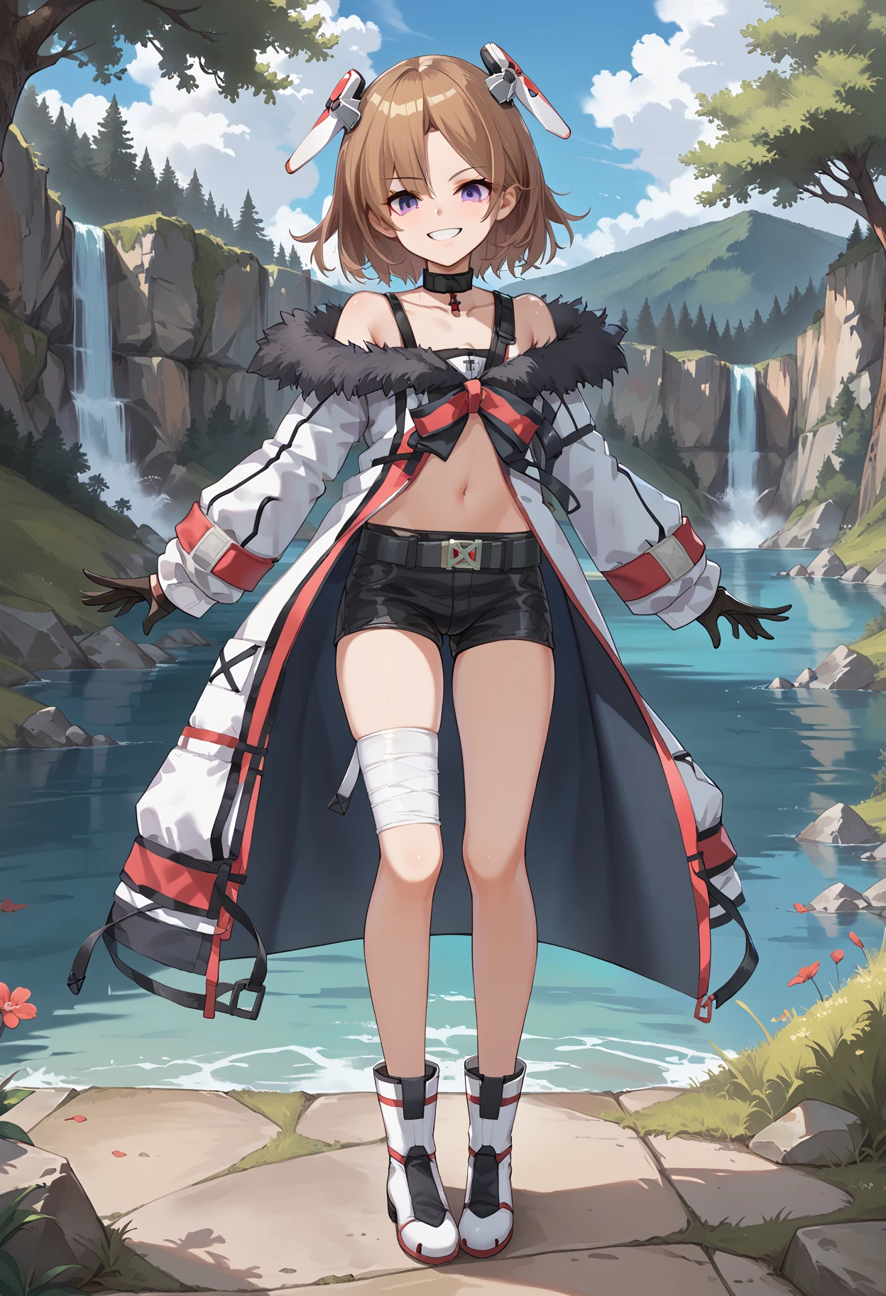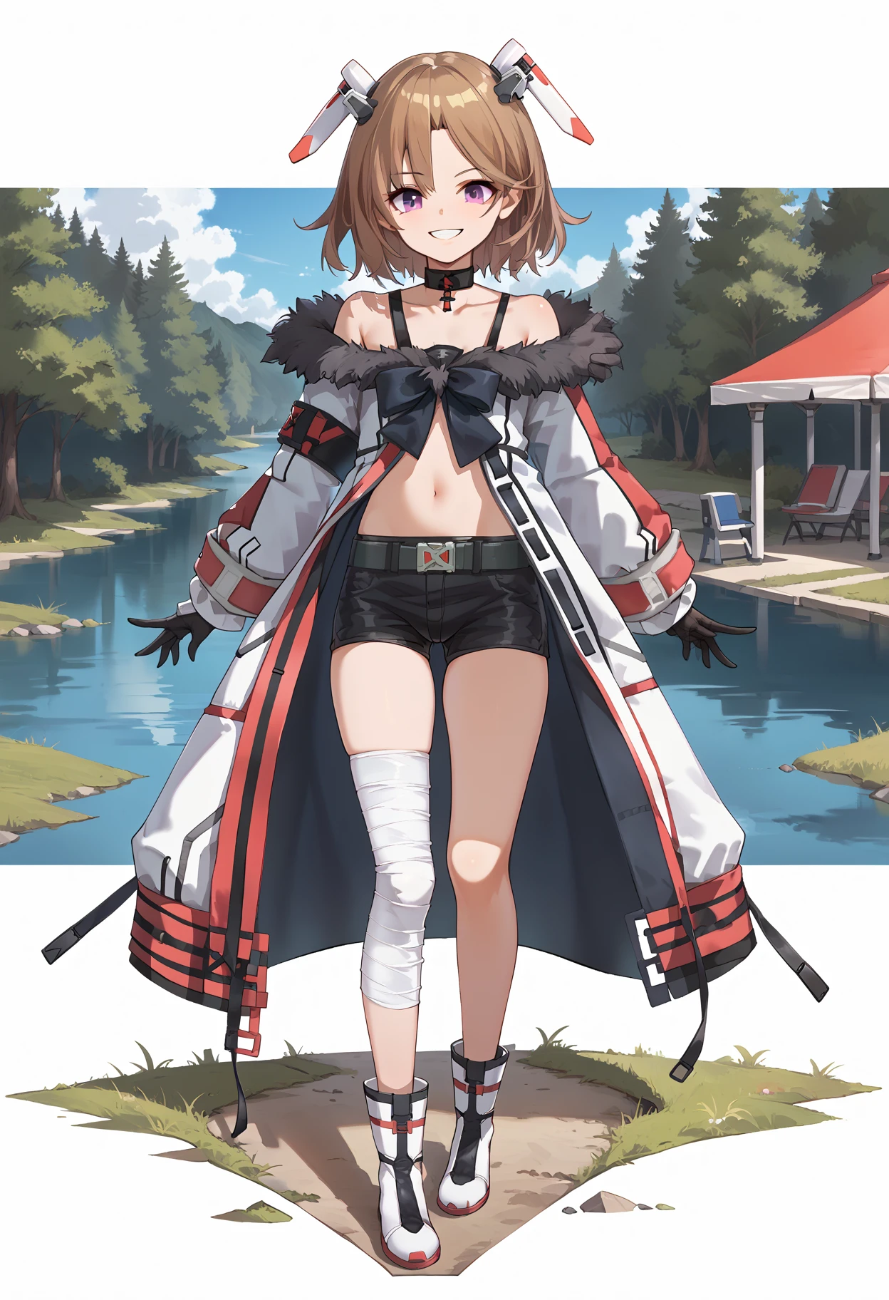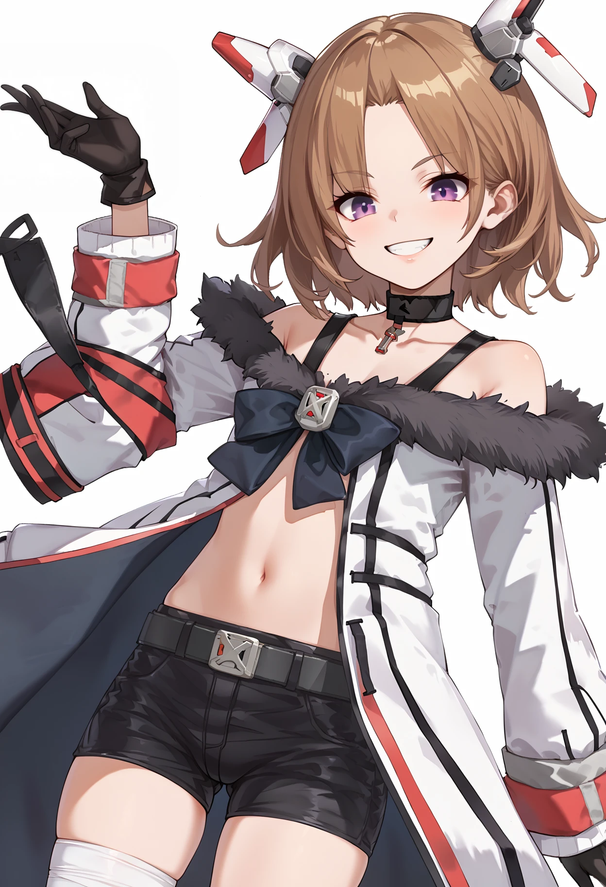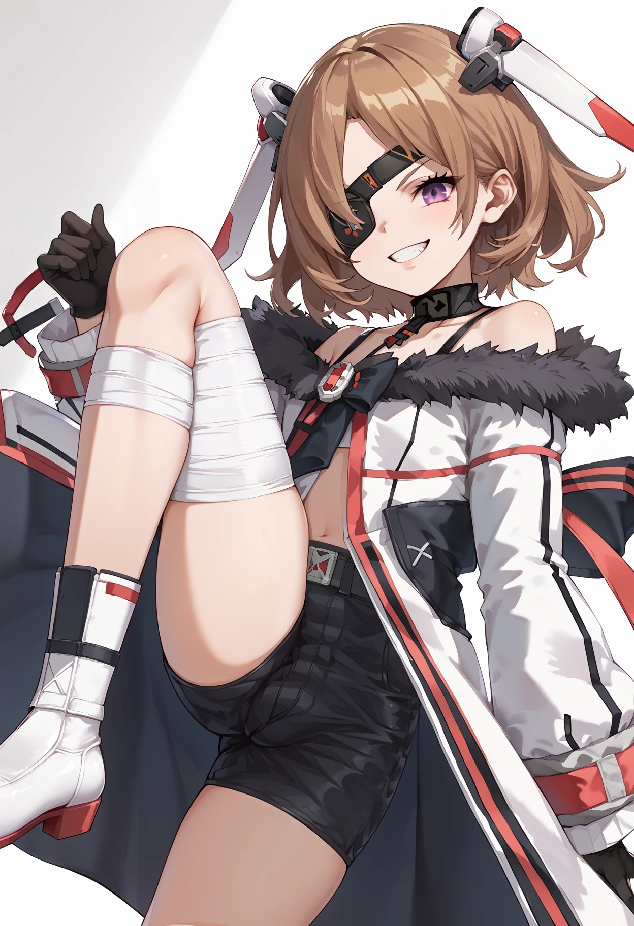 d_clothes,headgear,brown hair,purple eyes,black gloves,white open coat,fur trim,belt,midriff,short shorts,white footwear,bandaged leg,