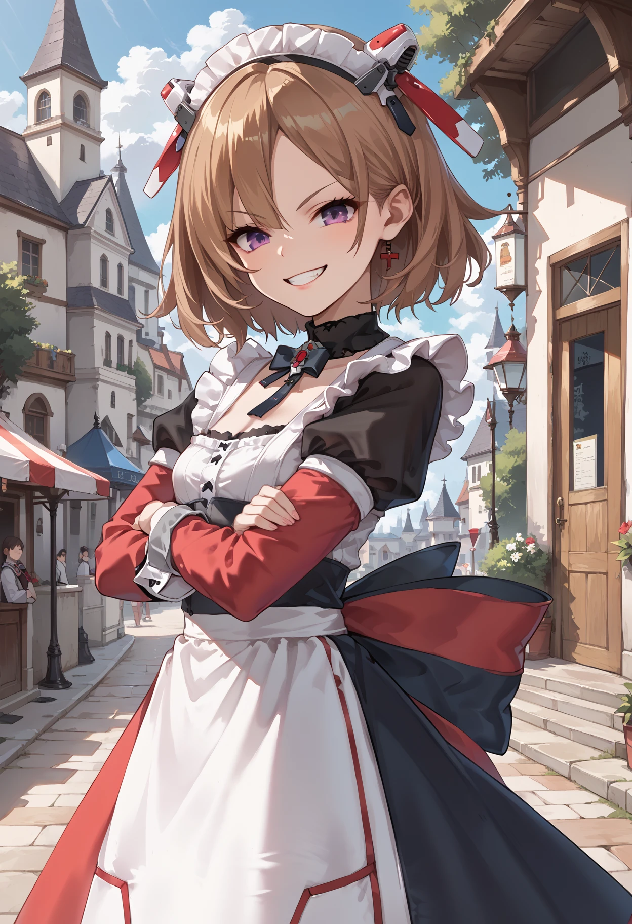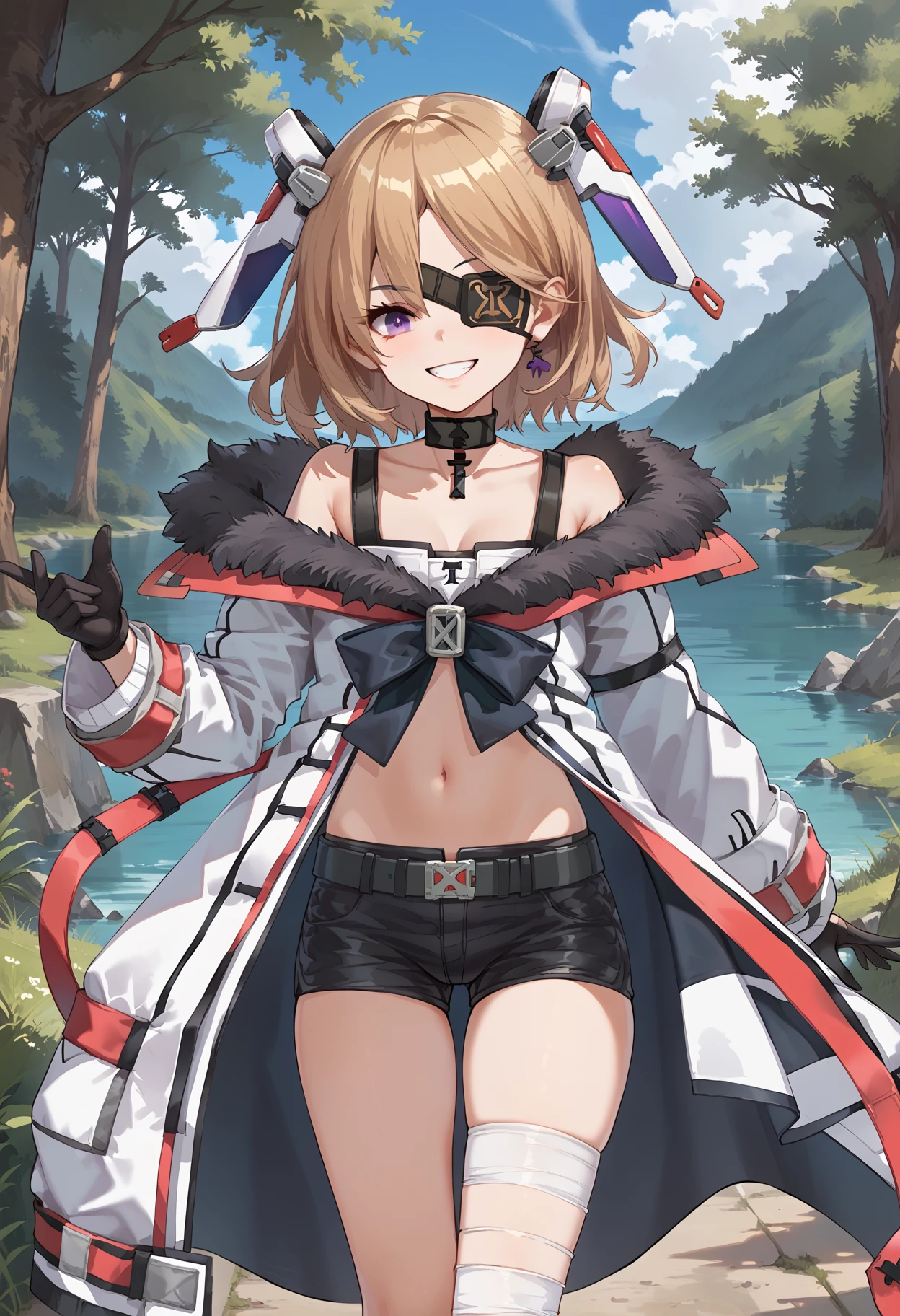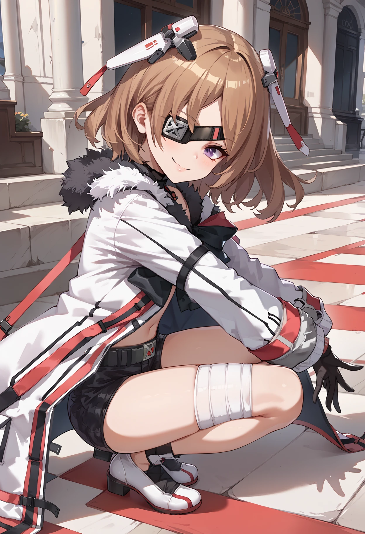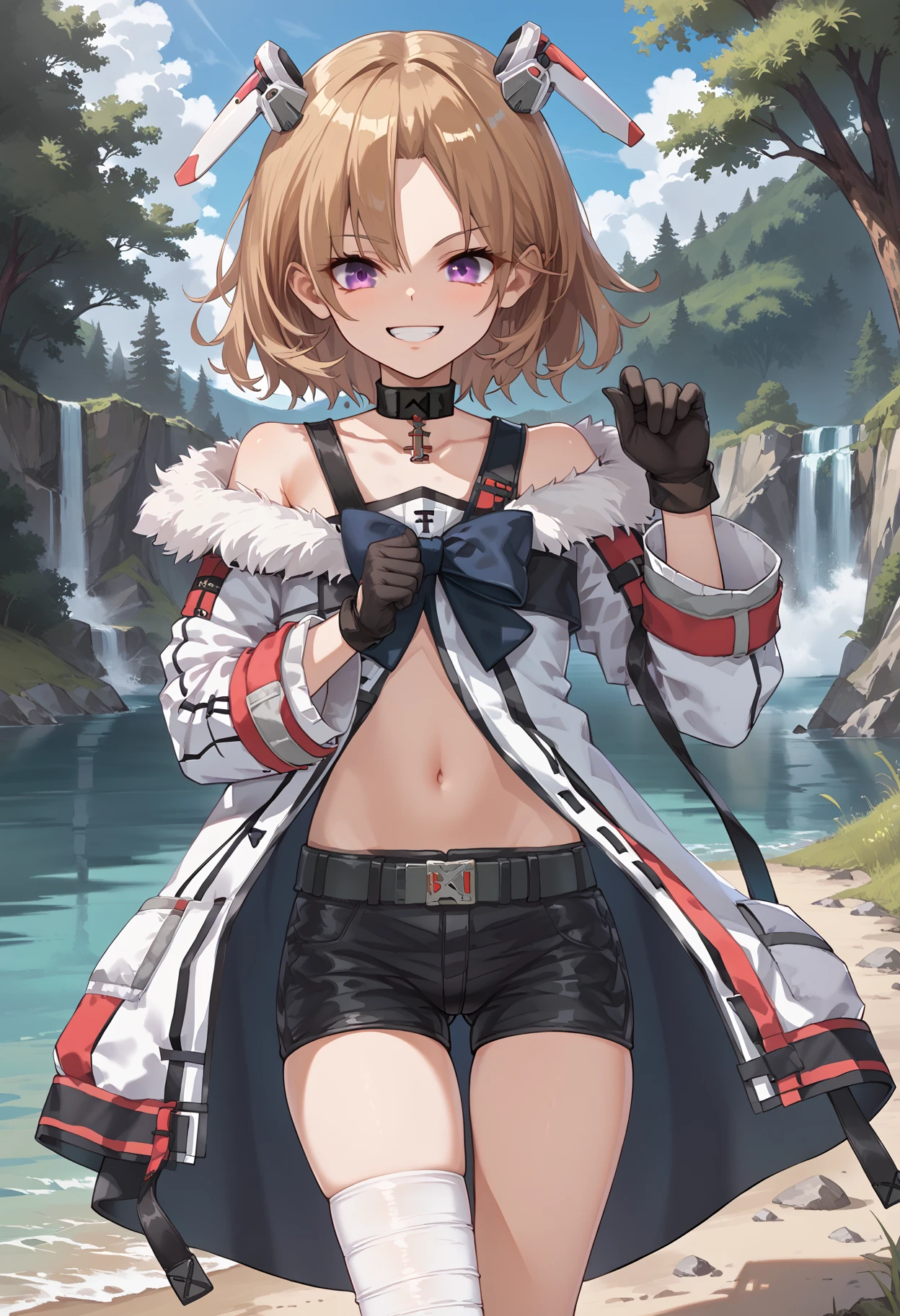 d_clothes,headgear,brown hair,purple eyes,black gloves,white open coat,fur trim,belt,midriff,short shorts,white footwear,bandaged leg,