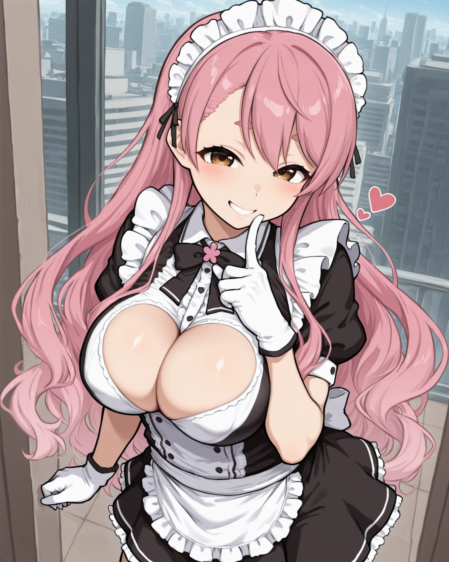 aizono manami, aizonomd, brown eyes, thick eyebrows, short eyebrows, pink hair, wavy hair, maid headdress, cleavage cutout, heart cutout, black bow, maid, frills, puffy short sleeves, waist apron, black skirt, white gloves, frilled socks, black mary janes,