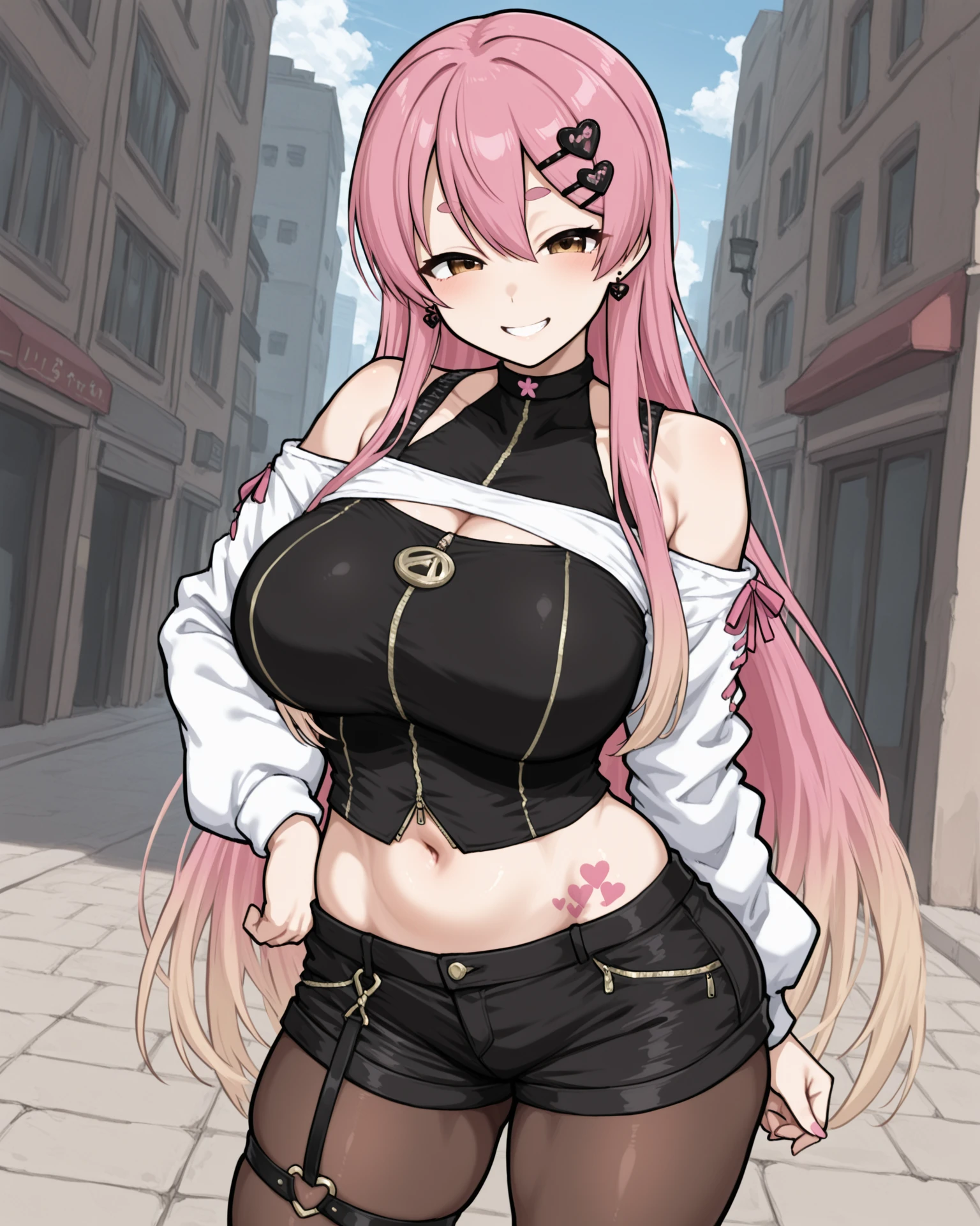 aizono manami, aizonoaf, brown eyes, thick eyebrows, short eyebrows, pink hair, straight hair, gradient hair, heart hair ornament, heart earrings, bare shoulders, halter shirt, black crop top, covered collarbone, zipper, shrug (clothing), long sleeves, white sleeves, pink ribbon, navel, hip tattoo, pink nails, black shorts, thigh strap, heart o-ring, black pantyhose, black boots,