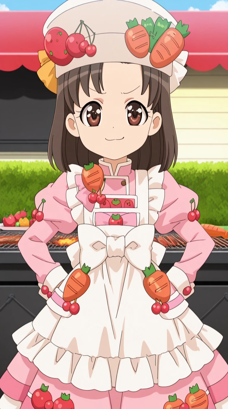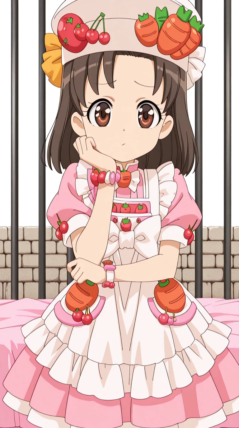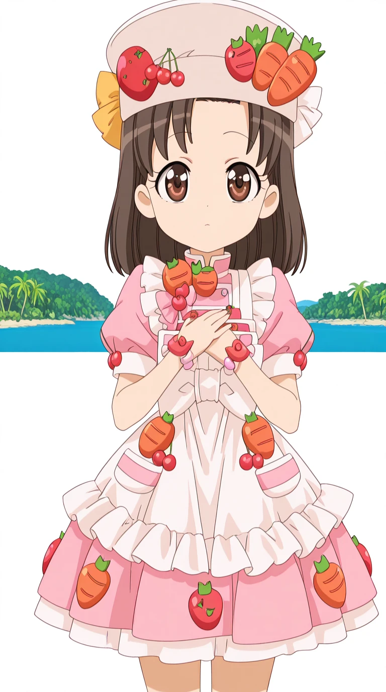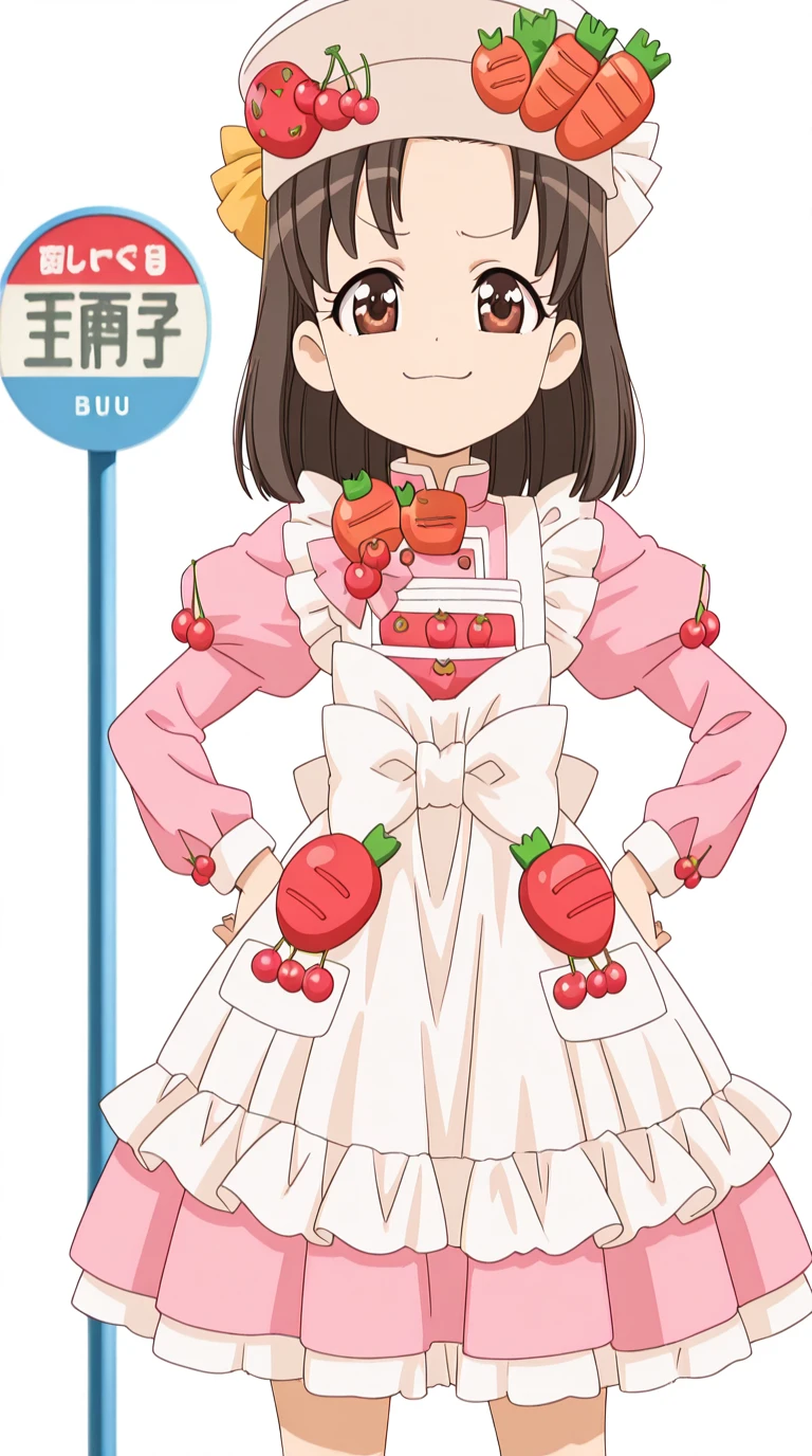 hat, food, fruit, strawberry, carrot, cherry, tomato, food-themed clothes, dress, hat, apron, bowtie, frills, juliet sleeves, white apron, pink shirt, skirt, pink skirt, short sleeves