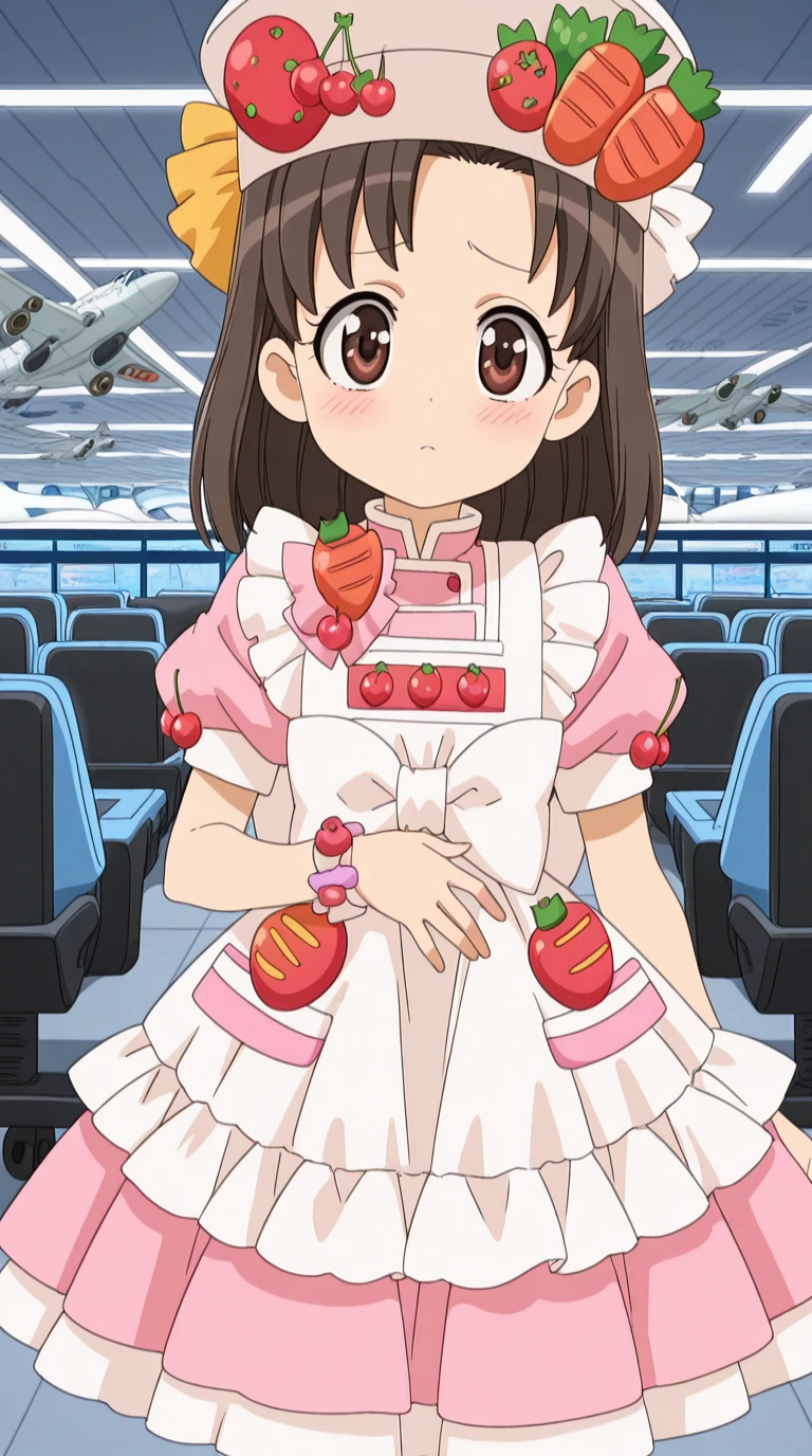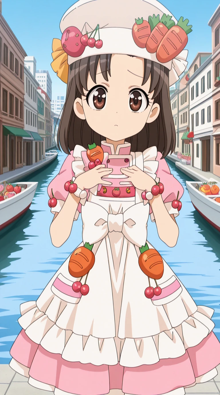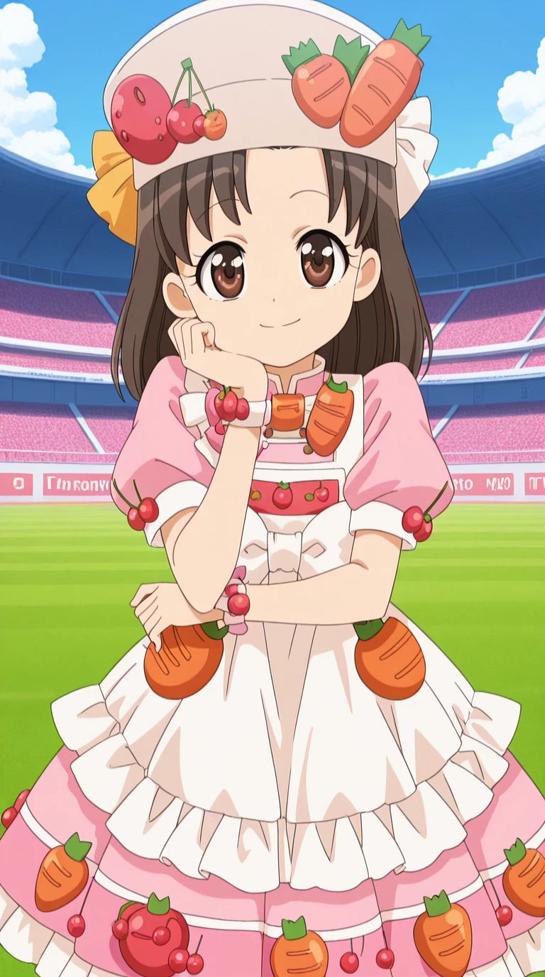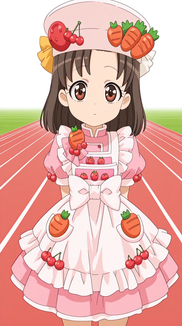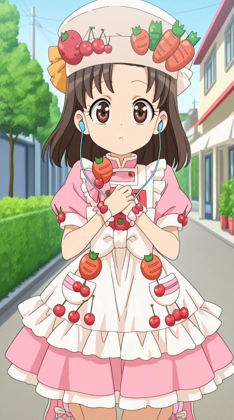 hat, food, fruit, strawberry, carrot, cherry, tomato, food-themed clothes, dress, hat, apron, bowtie, frills, juliet sleeves, white apron, pink shirt, skirt, pink skirt, short sleeves