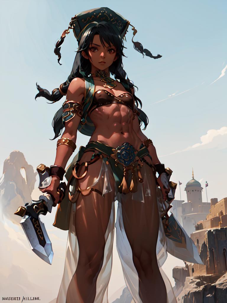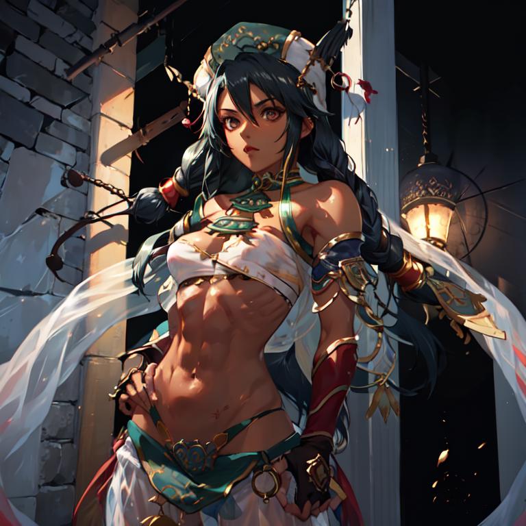 hat, arabian clothes, long sleeves, white shorts, jewelry, midriff