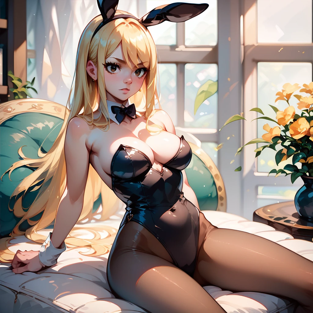 lucy heartfilia, blonde hair, brown eyes, hair between eyes, long hair, pink tattoo on hand,