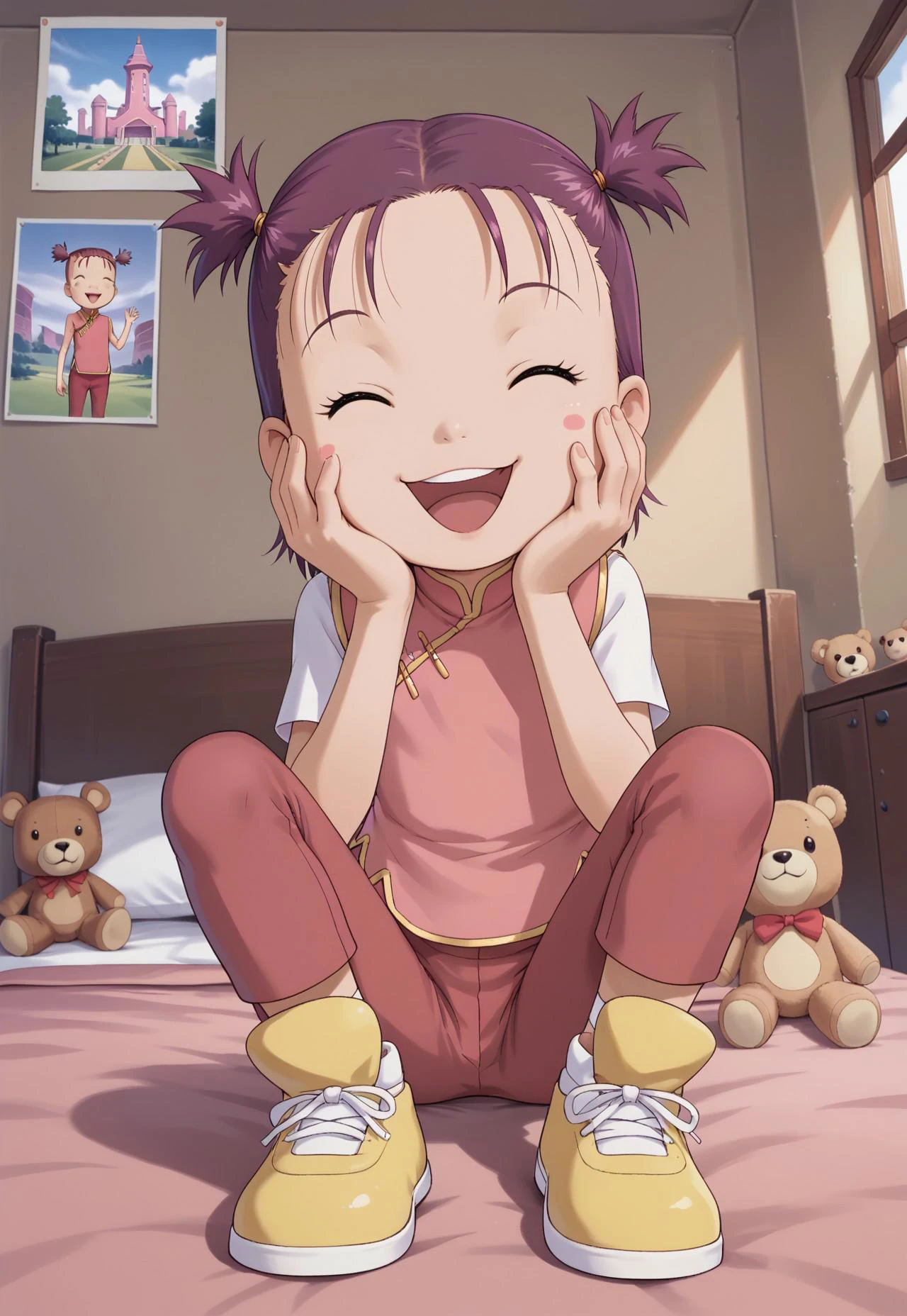 1girl, solo, purple hair, short hair, short twintails, purple eyes, blush stickers, short sleeves, chinese clothes, pants, shoes