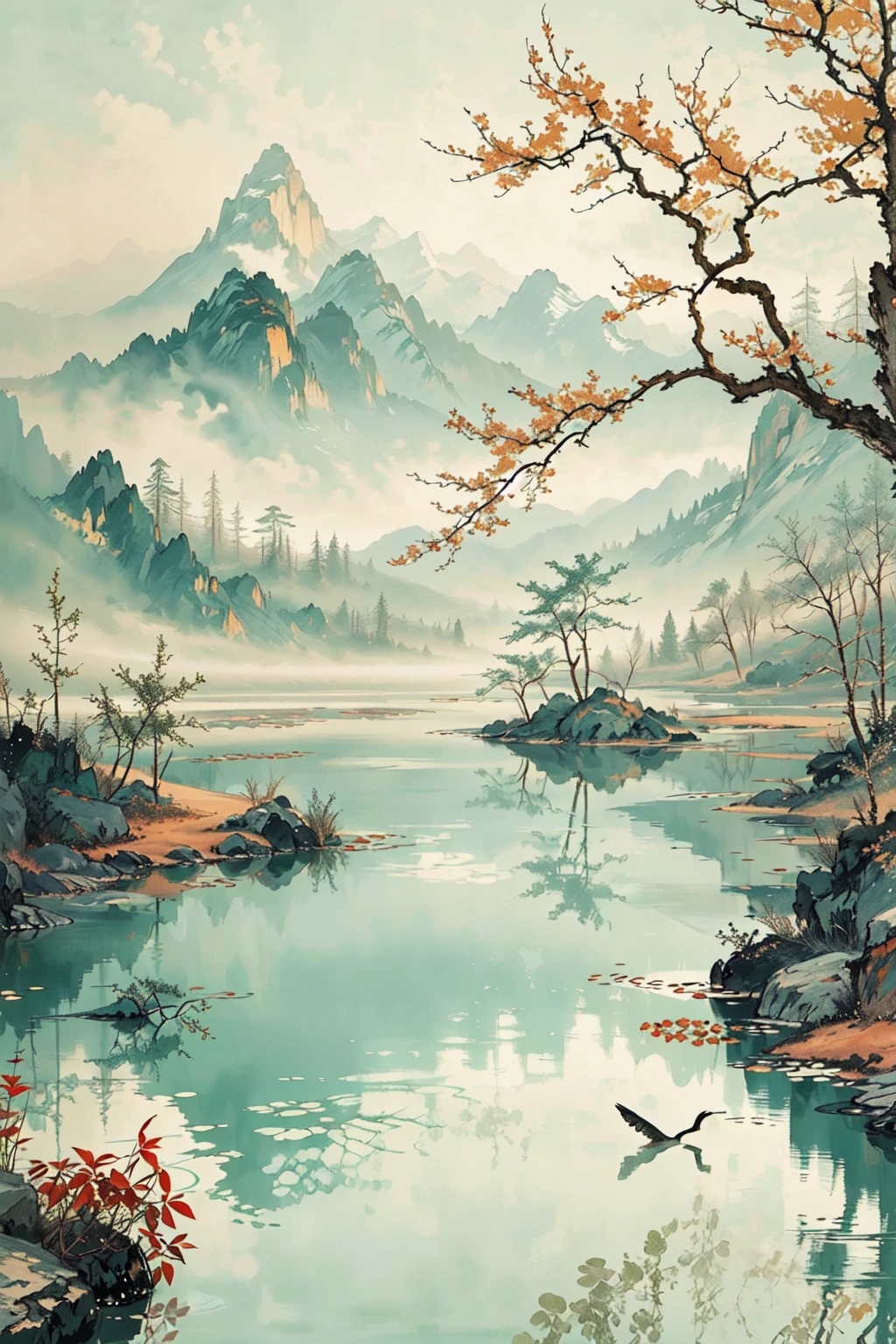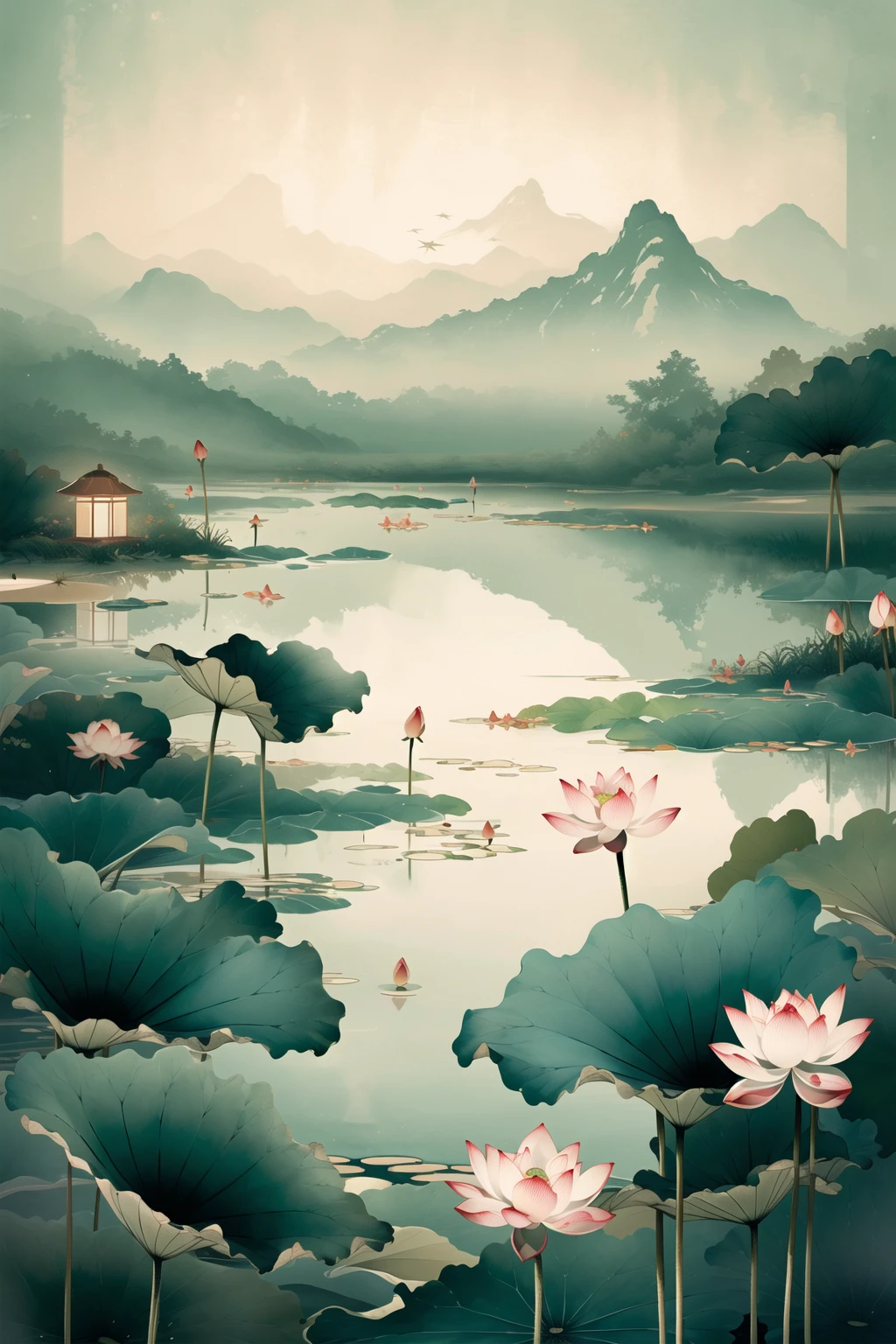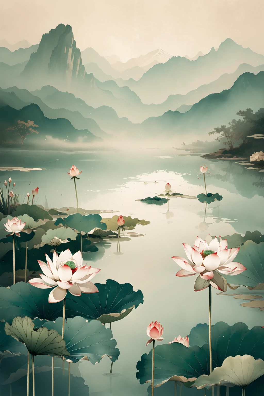 master piece, high quality, lotus, lotus leaf, mountains, lake, light green and light blue