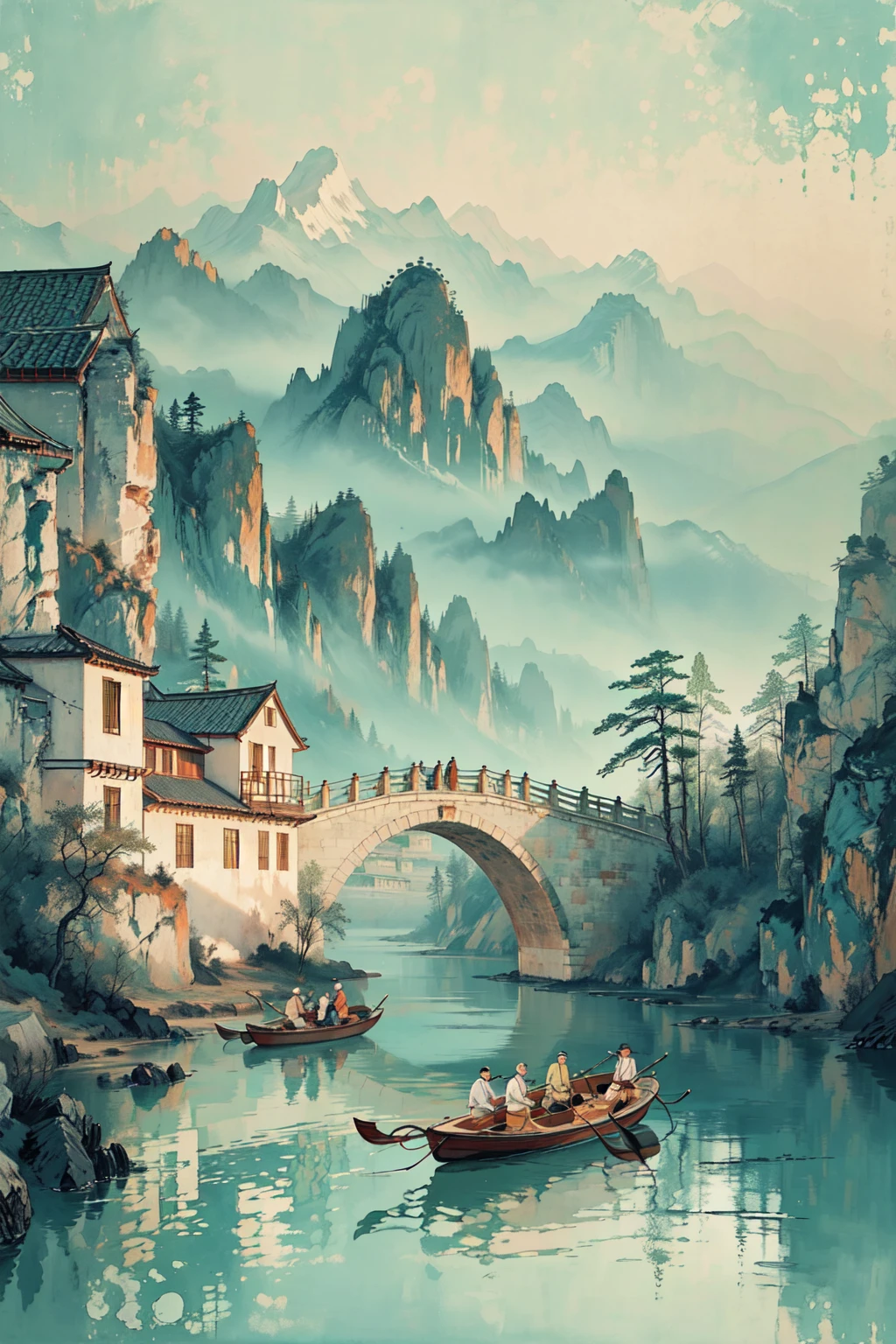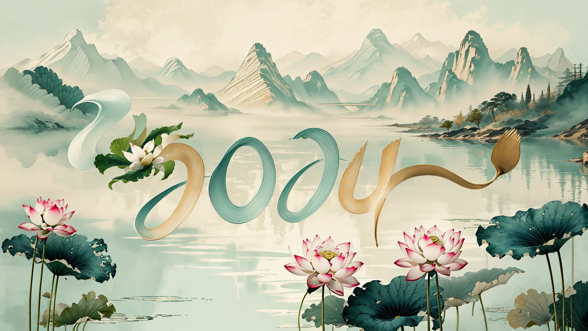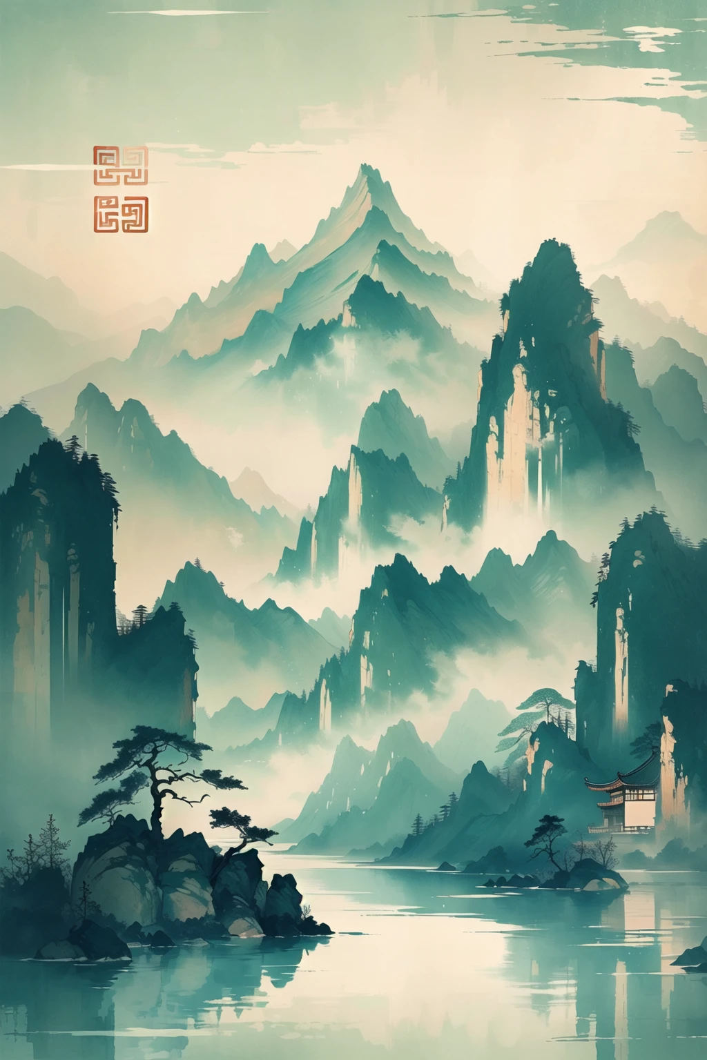 master piece, high quality, lotus, lotus leaf, mountains, lake, light green and light blue