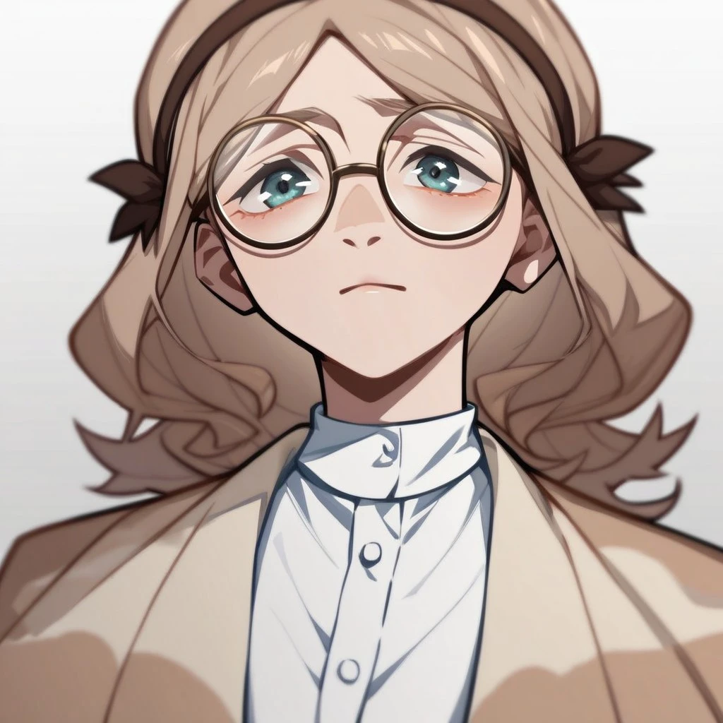 Louisa, 1girl ,glasses, light brown hair, round glasses, brown skirt, white shirt, hairband, long sleeves, brown coat,