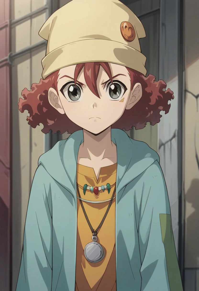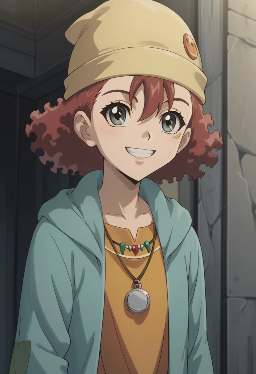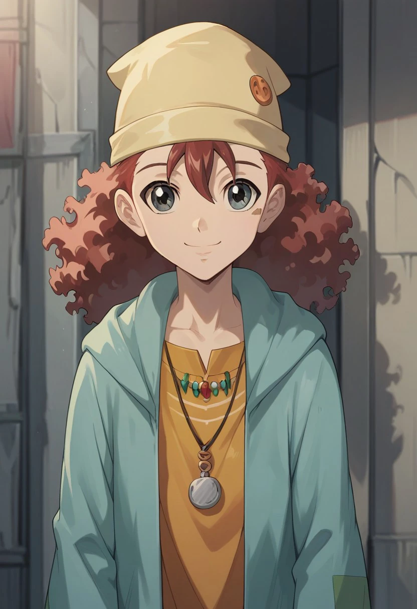 rallydawson, 1boy, male focus, solo, smile, hat, red hair, curly hair, long hair, necklace, jewelry, looking at viewer, long hair, grey eyes, hoodie, blue hoodie, open hoodie, shirt, orange shirt