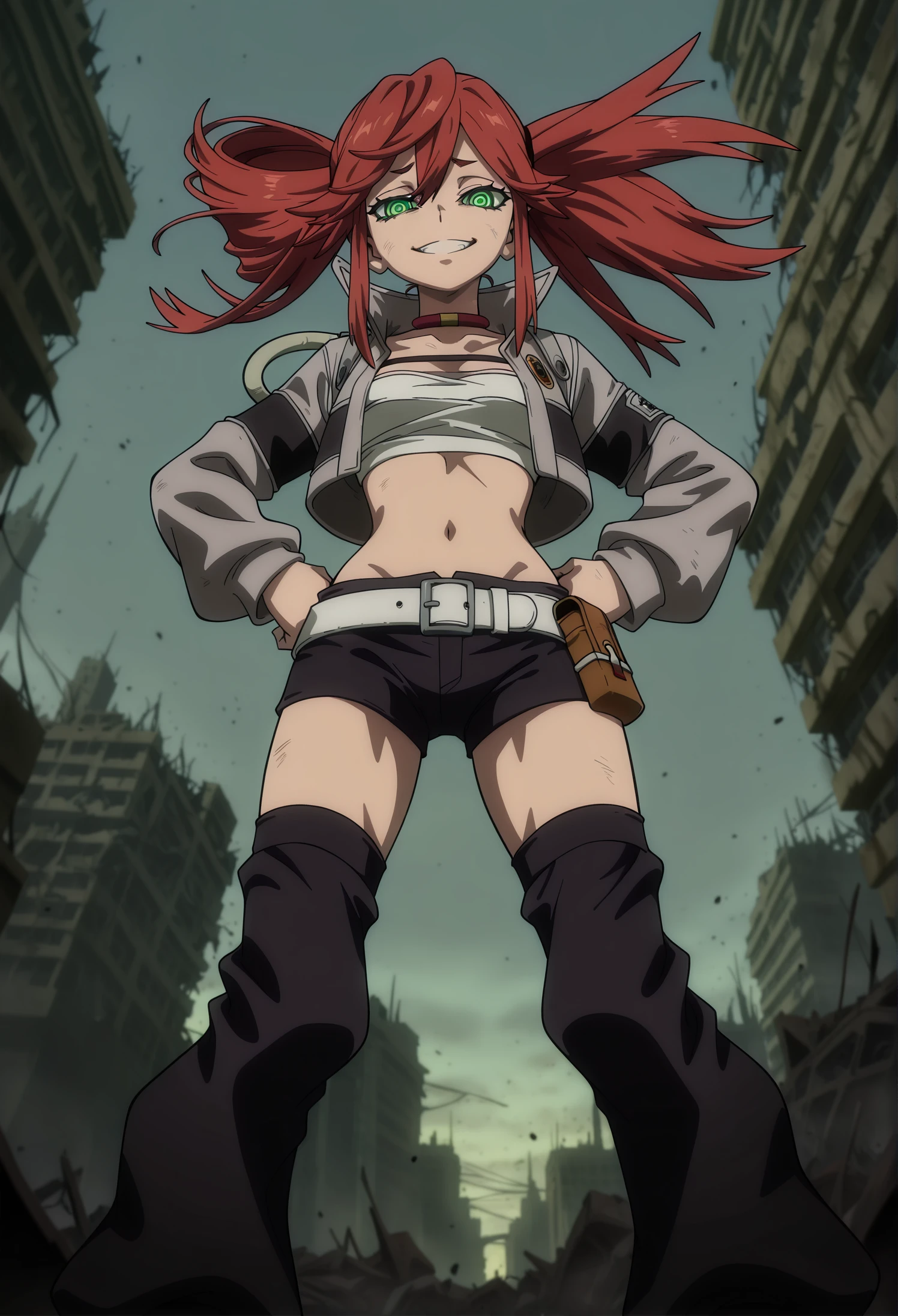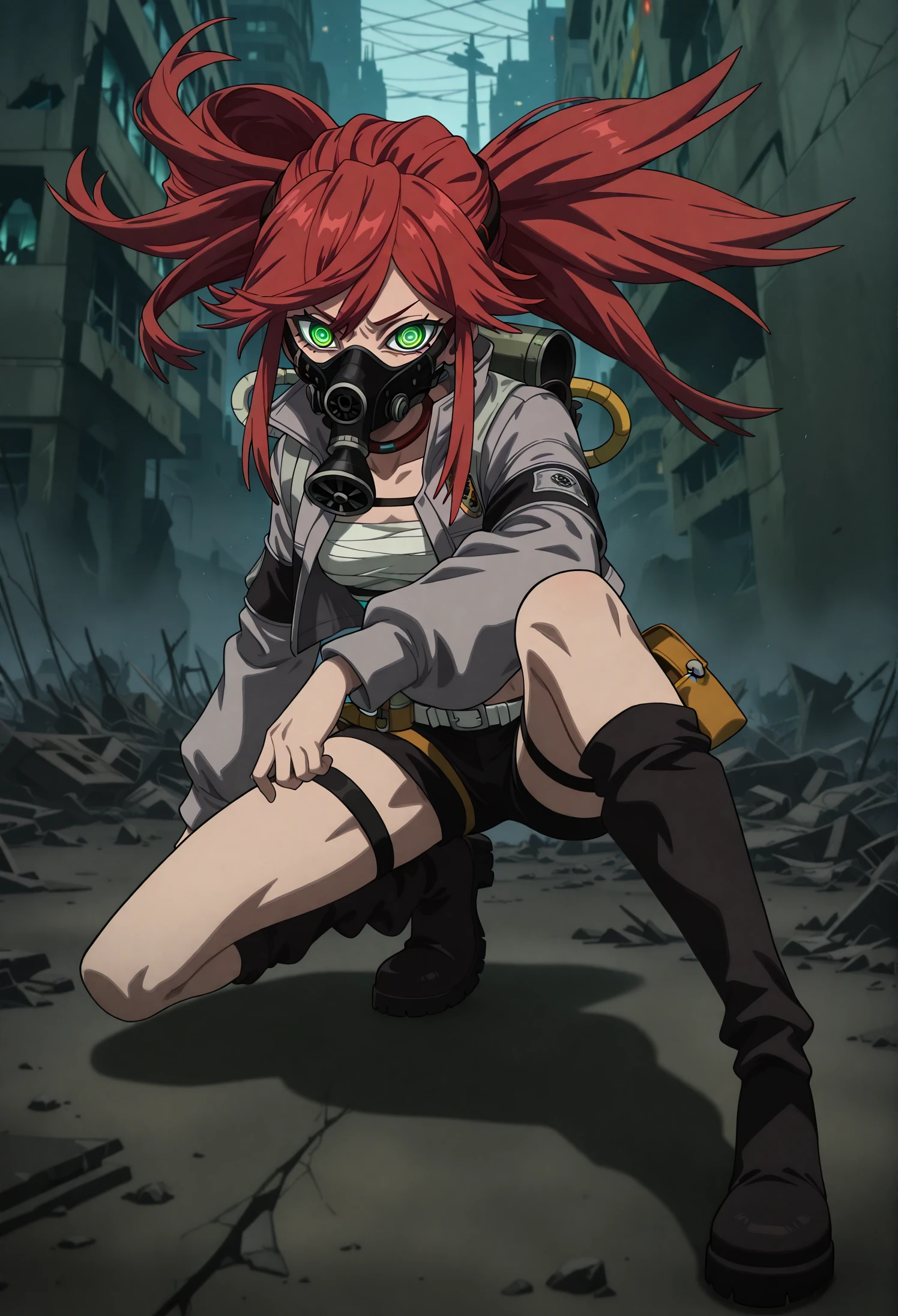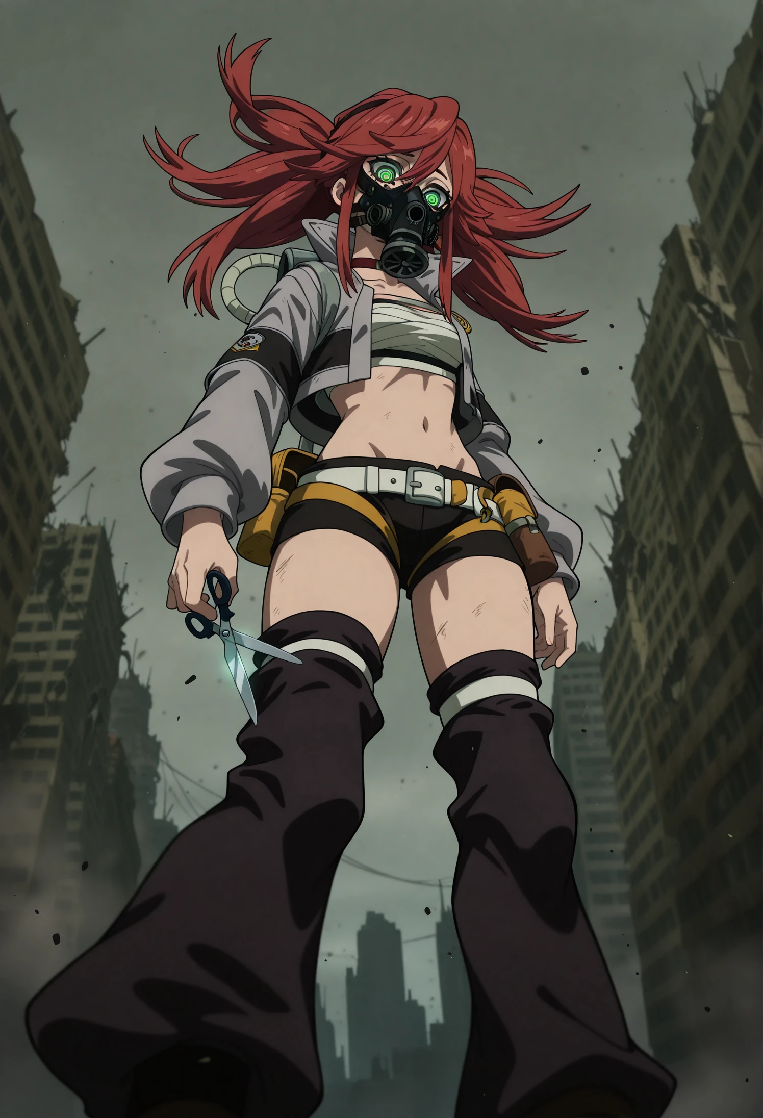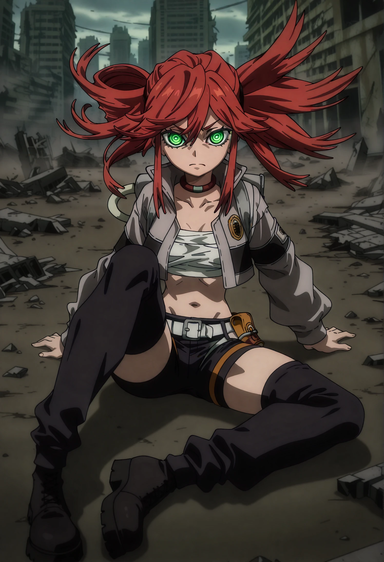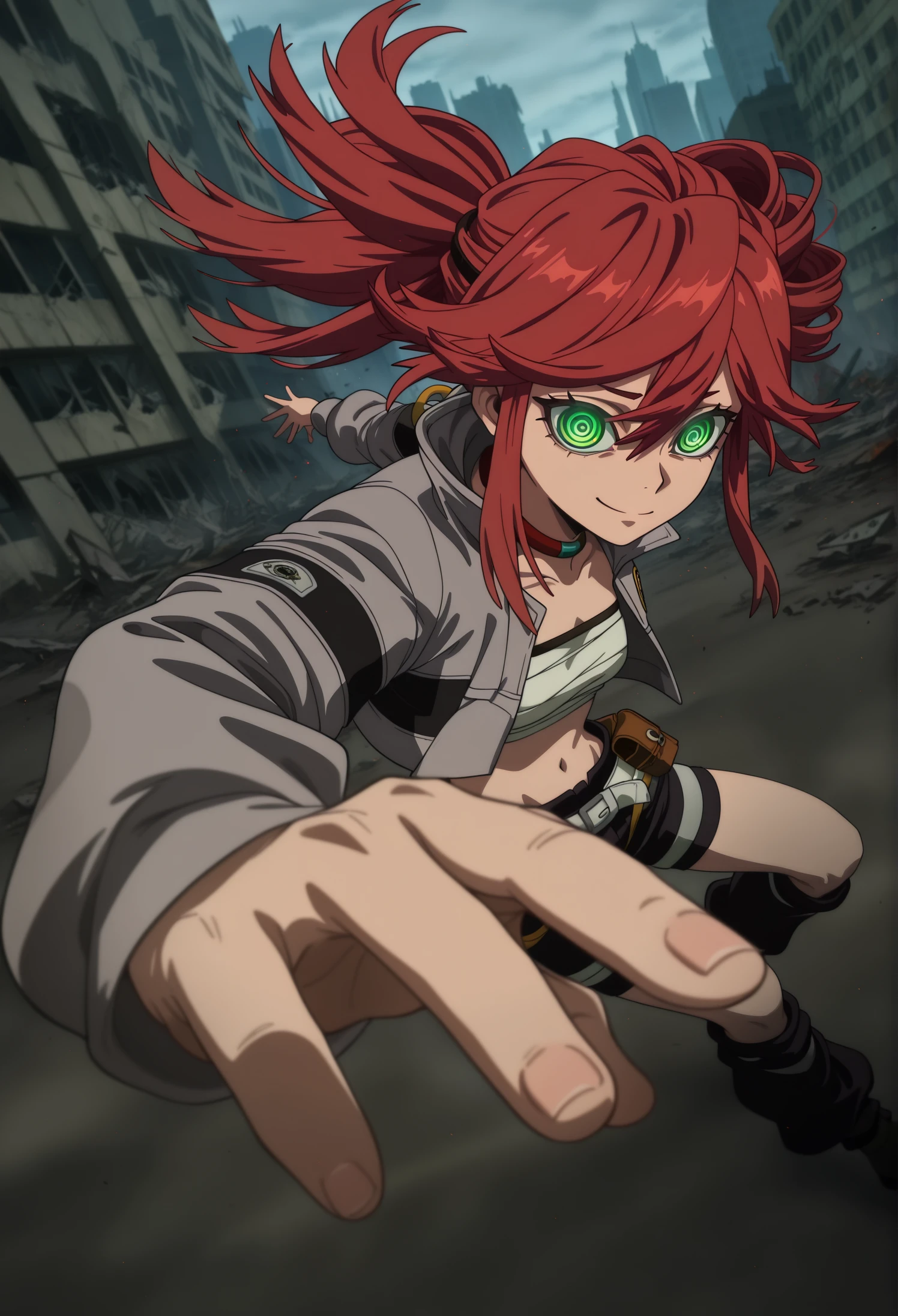 RiyouReaper, choker, thin, ringed eyes, green eyes, twintails, red hair, long hair
