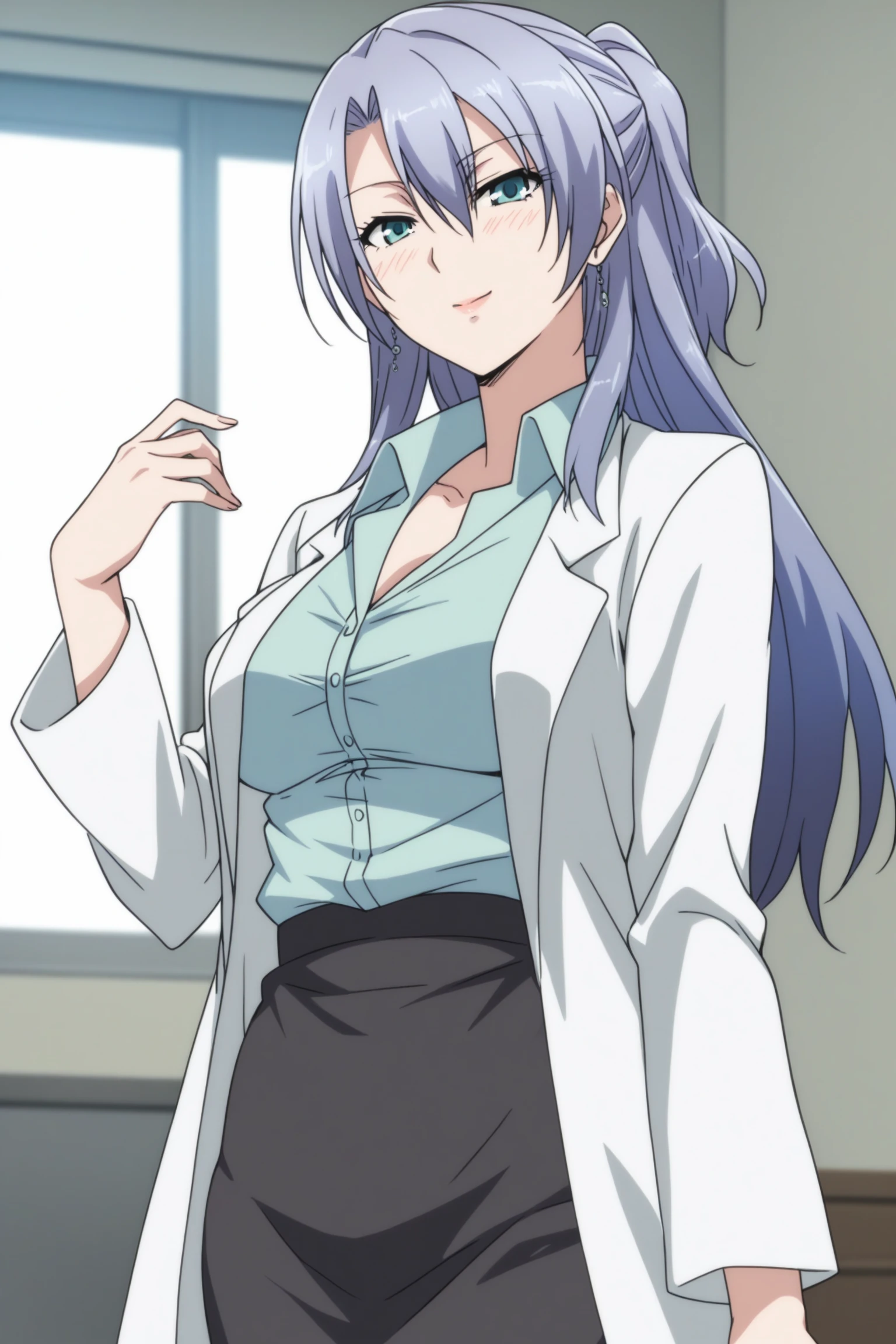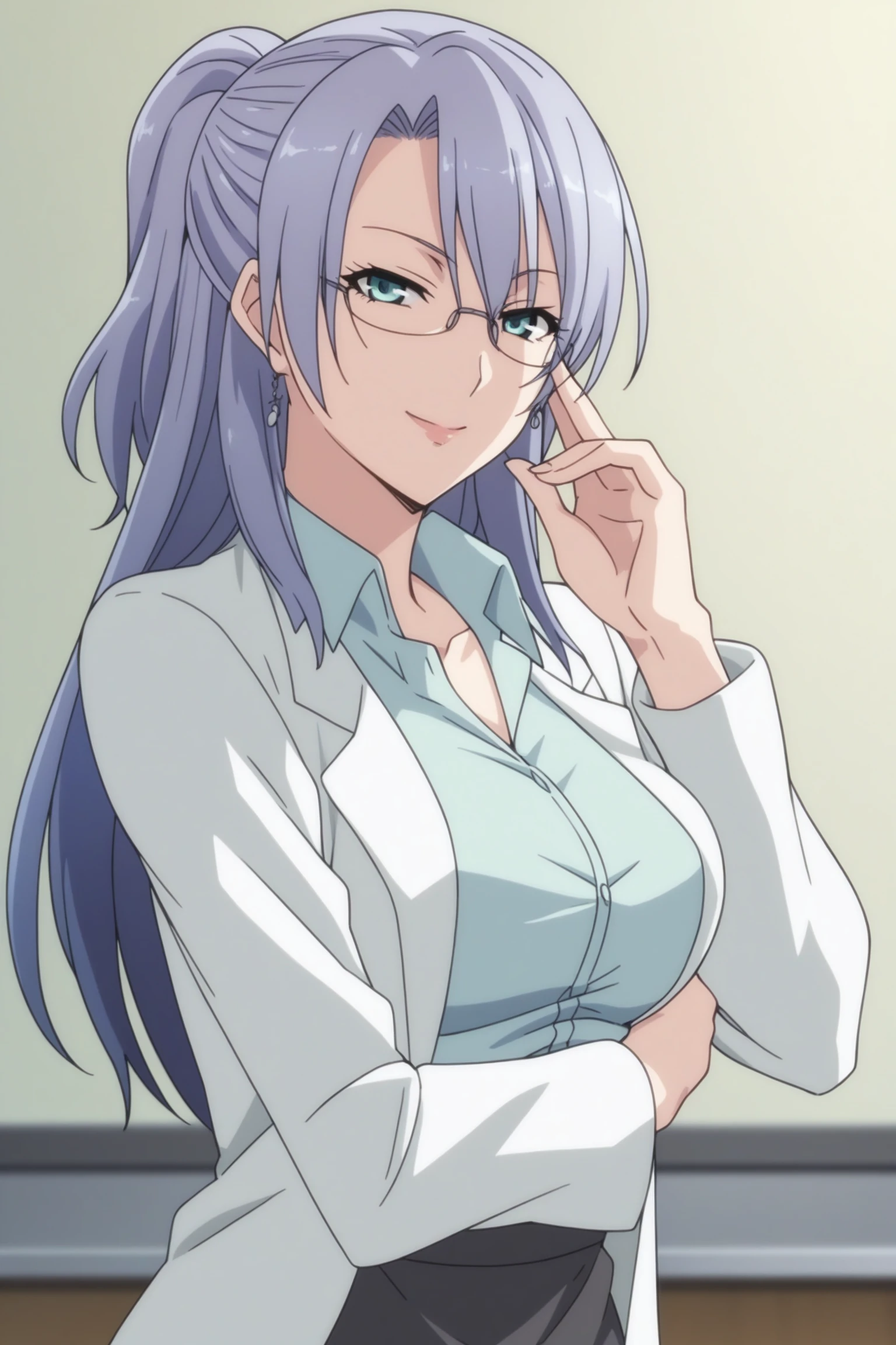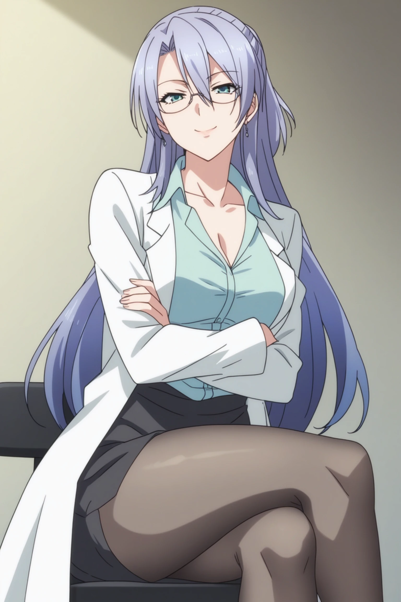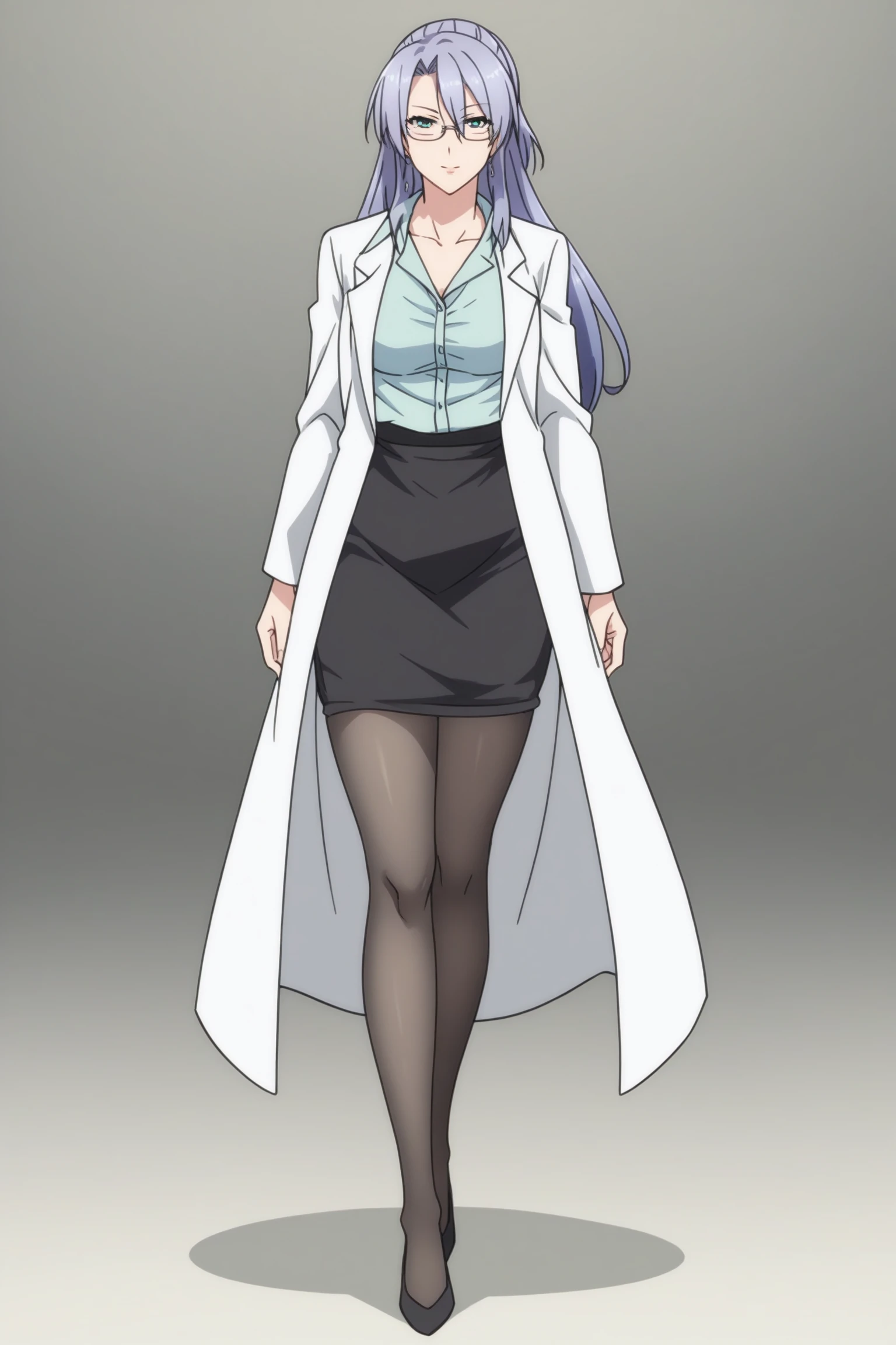himuro ayame, long hair, purple hair, short ponytail, green eyes, lab coat, green shirt, collared shirt, black skirt, pencil skirt, black pantyhose, black highheels