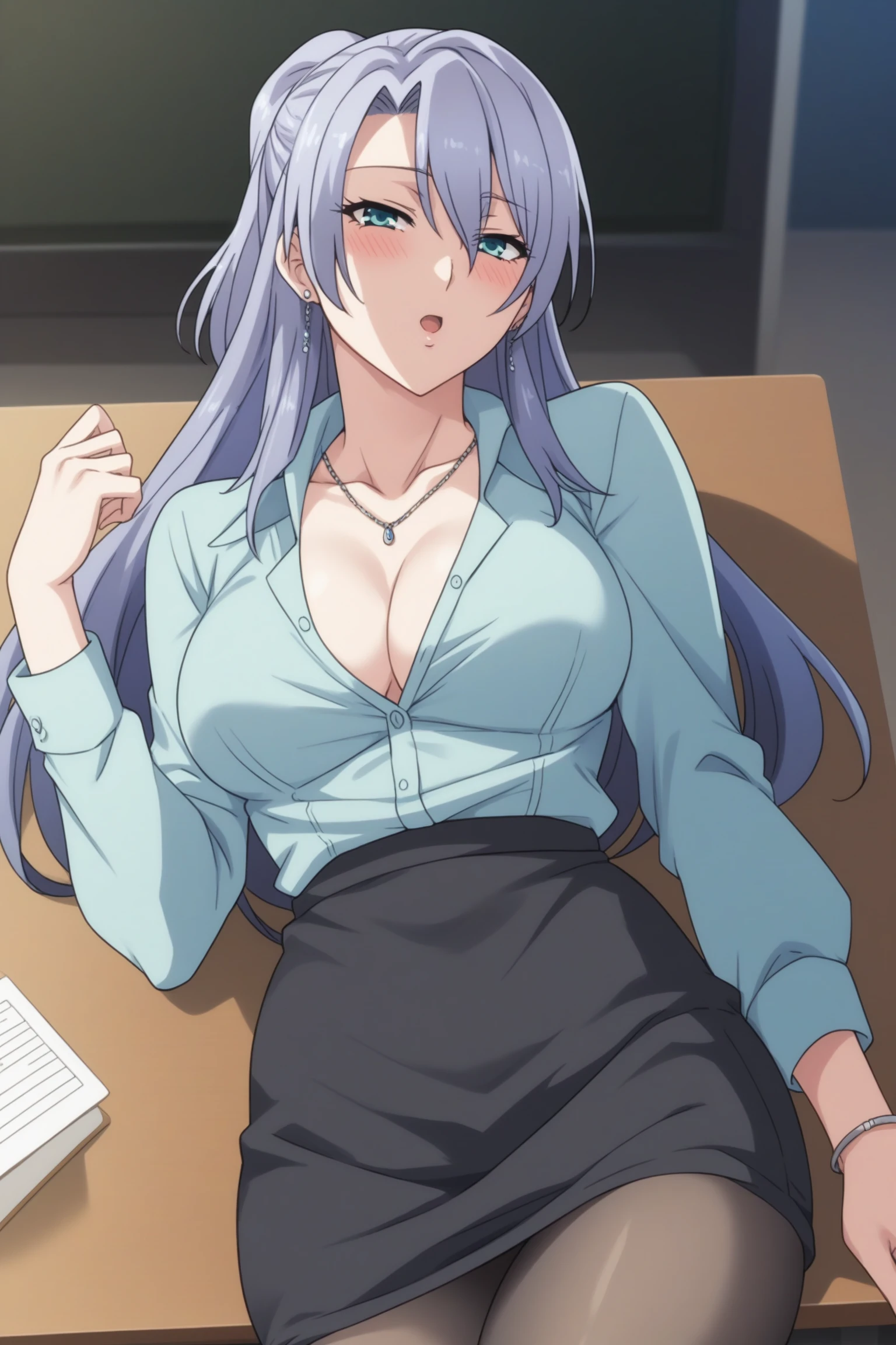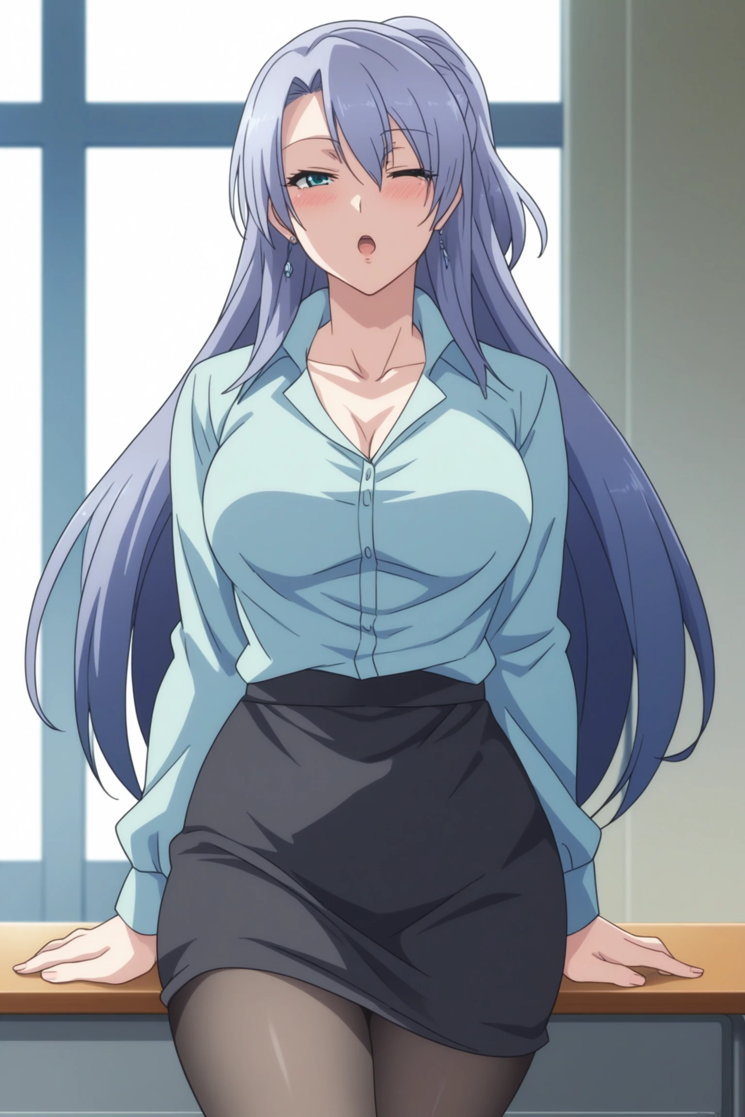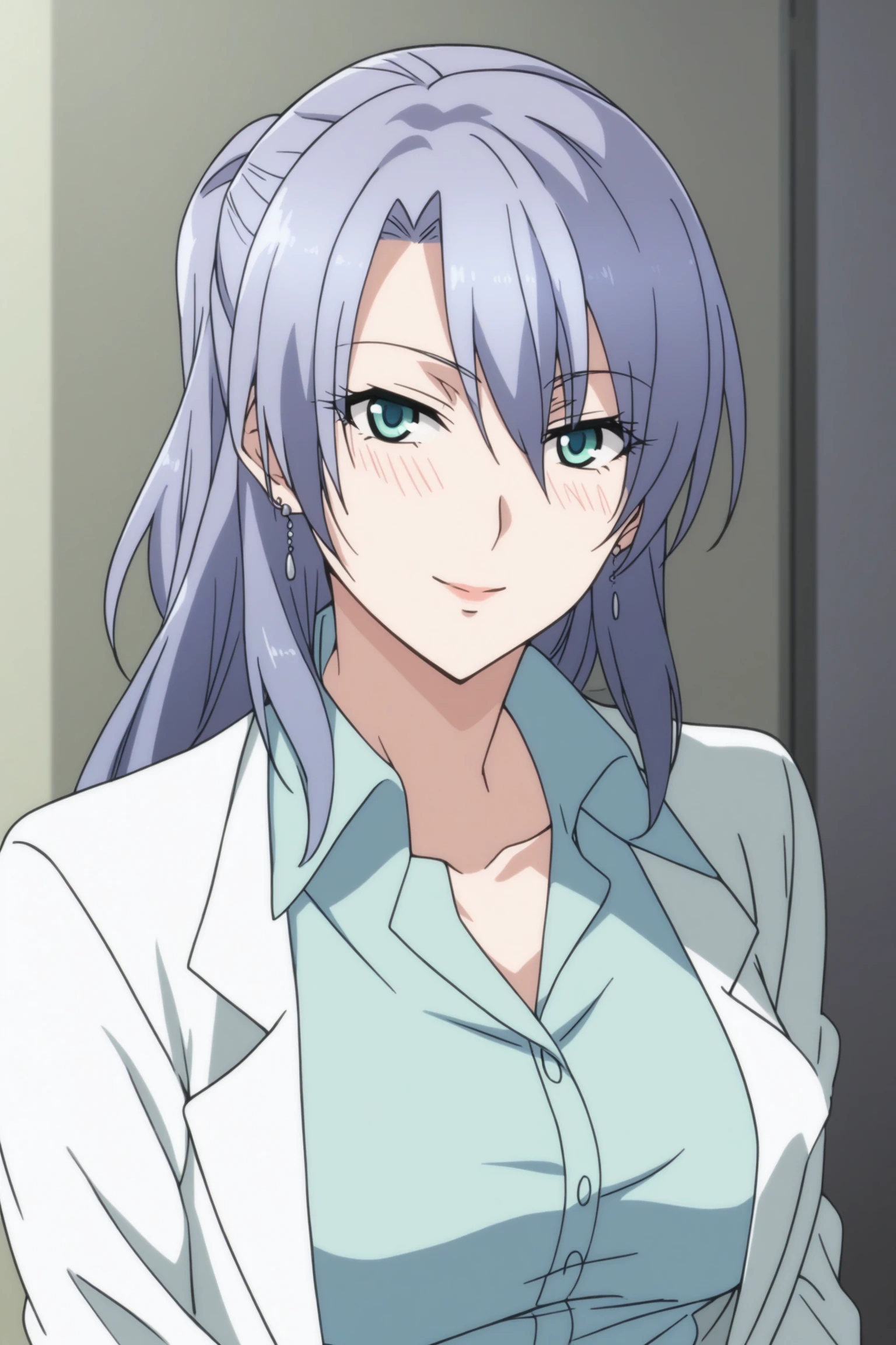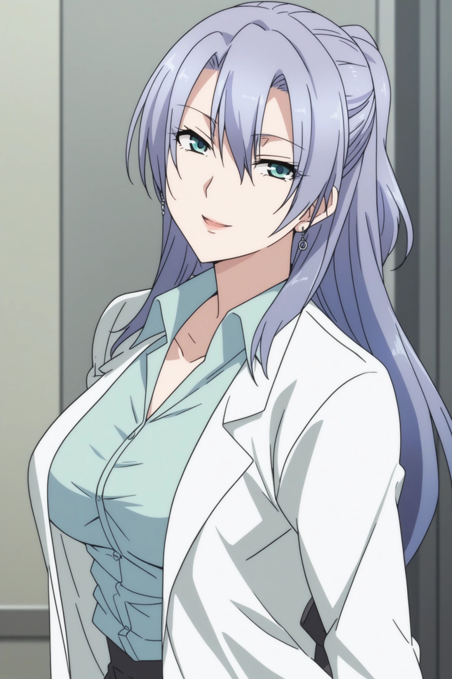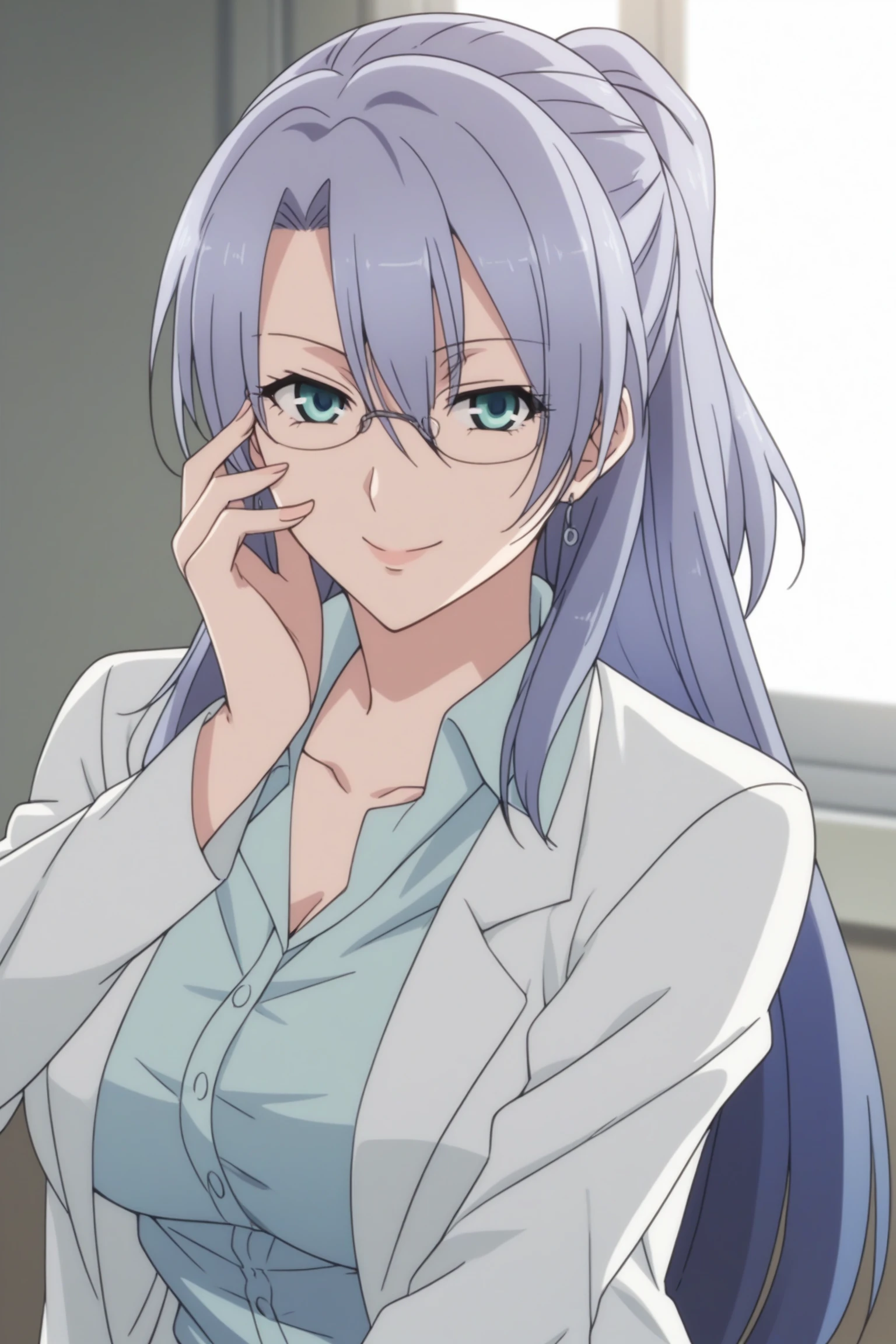 himuro ayame, long hair, purple hair, short ponytail, green eyes, lab coat, green shirt, collared shirt, black skirt, pencil skirt, black pantyhose, black highheels