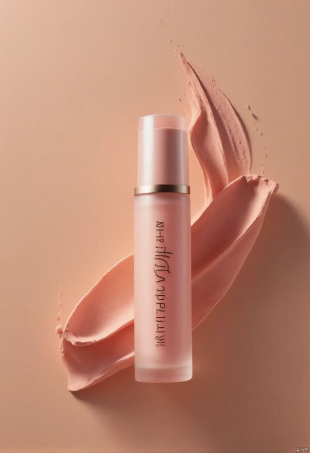 -Recommendation: Product rendering, Captured from a high-angle, eye-level perspective, a light pink bottle of lipstick is adorned with the brand name “RICHARDIN” in black cursive letters. The lipstick is placed on a light brown wooden surface
