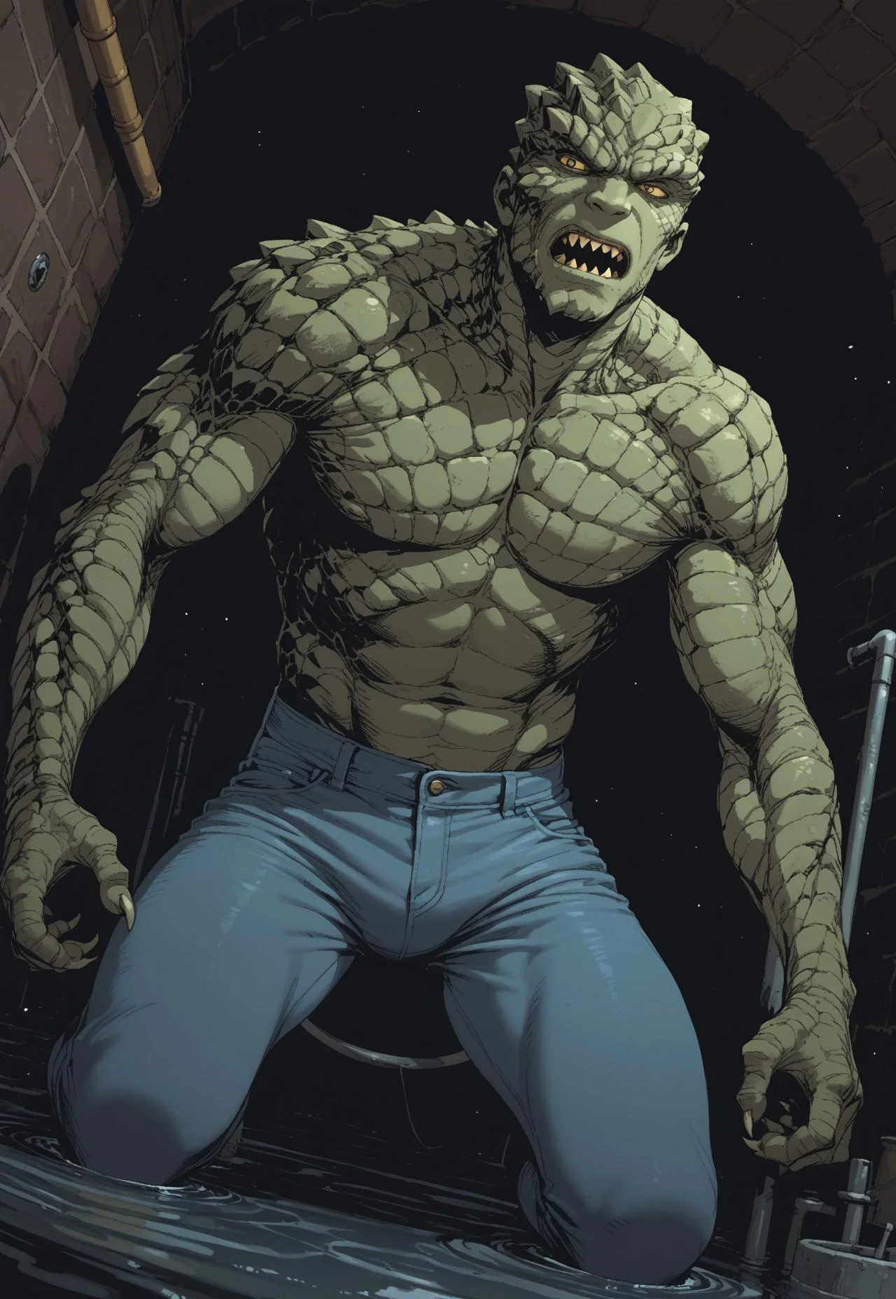 1boy, solo, green skin, scales, yellow sclera, green eyes, sharp teeth, topless male, claws, blue jeans