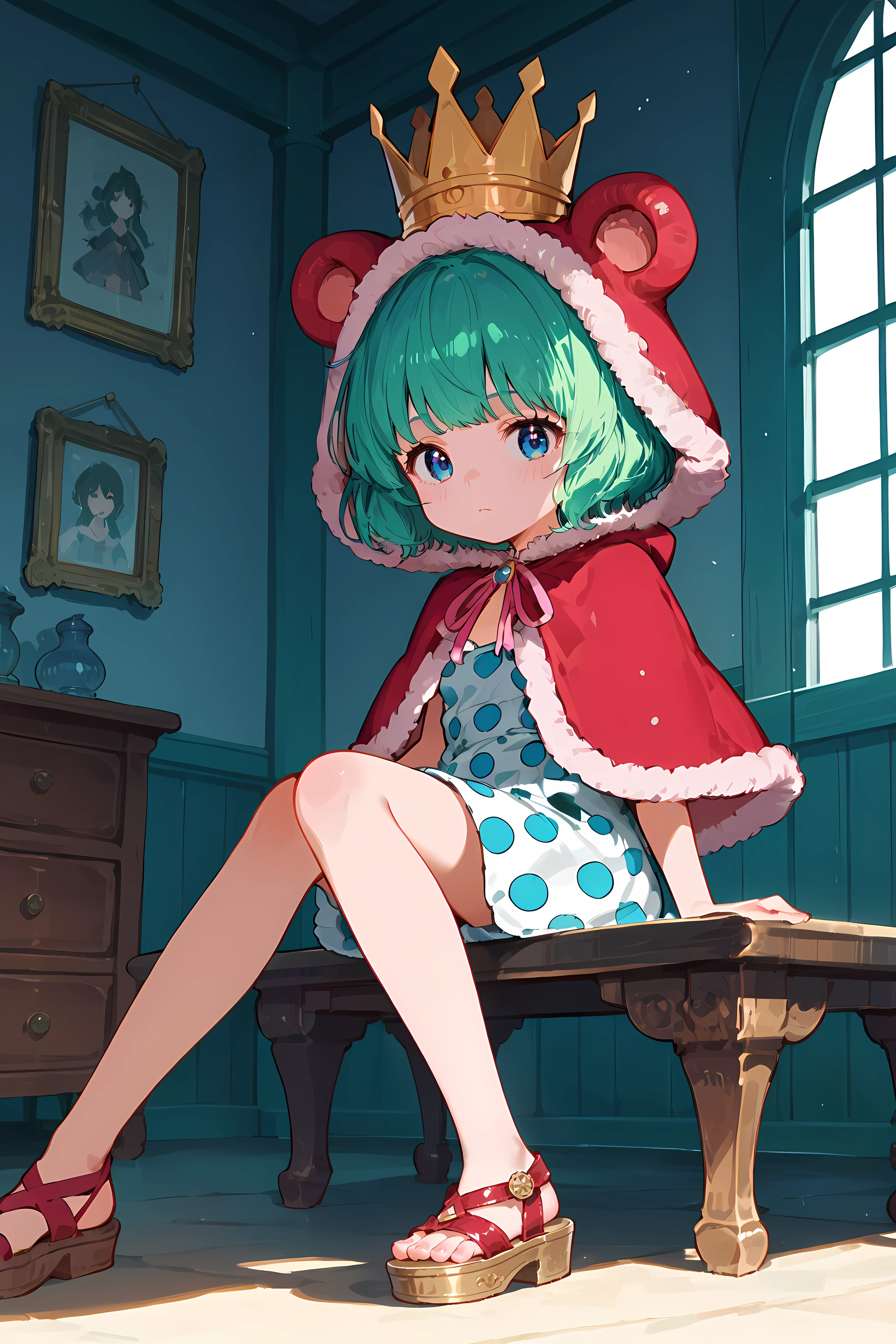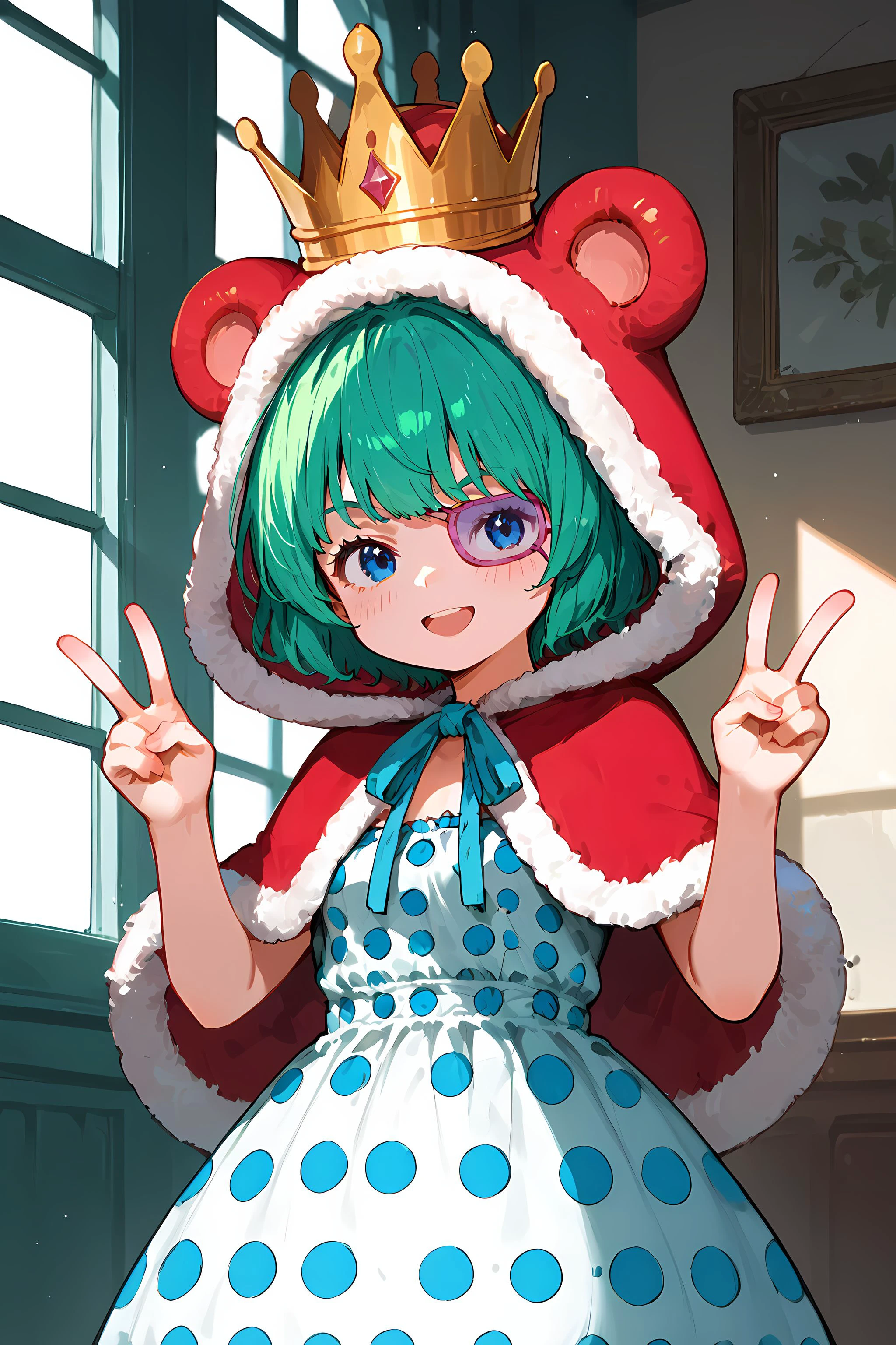 crown,animal ears,fur trimmed capelet,ribbon,eyepatch,hood,red ribbon,polka dot dress,sandals