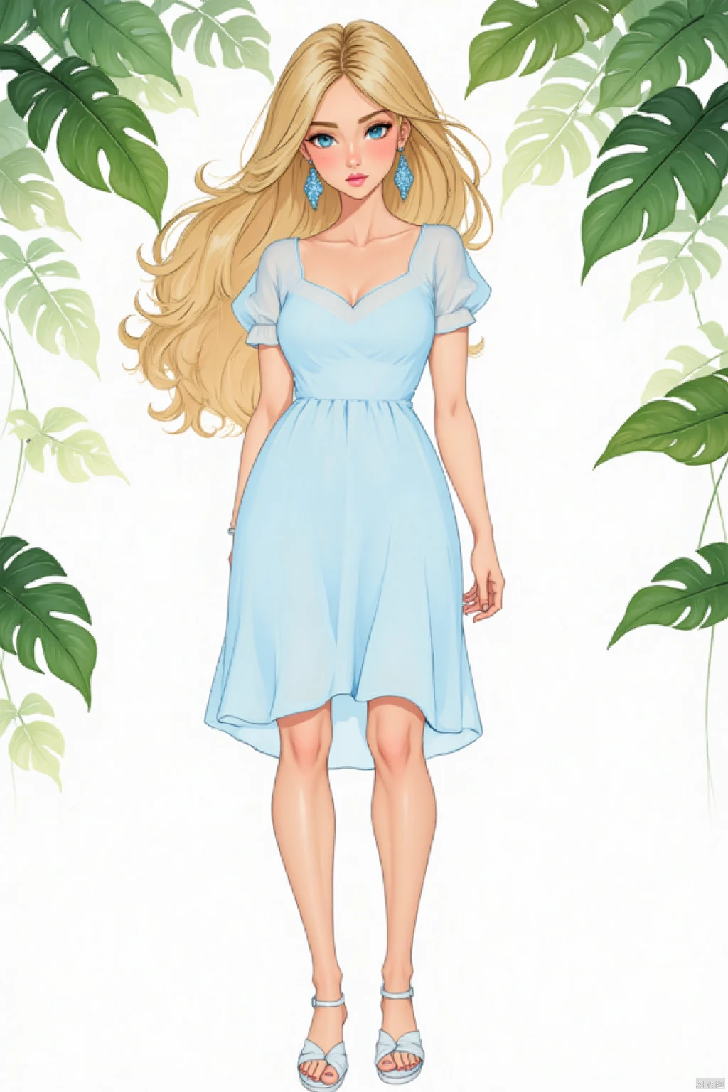 -Words of Recommendation: Minimalist illustrations, An animated image of a blonde woman in a light blue dress. The woman is standing in front of a white backdrop with green leaves on it. The woman is standing in front of a white backdrop with green leaves on it. Her blonde hair is blowing in the wind and she is wearing a pair of blue earrings. Her eyes are blue and her lips are pink. Her blonde hair is blowing in the wind and she is wearing a pair of blue earrings. Her eyes are blue and her lips are pink.
