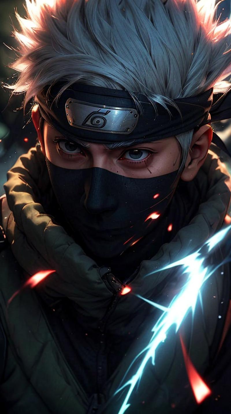 Prompt words: kakaxi, 1 boy, white hair, mask, headband, comics, anime, lightning, dramatic, green jacket, superhero, special powers, Naruto, Kakashi, headband, loose clothing, one eye, ninja, battle, leader, wisdomDescription