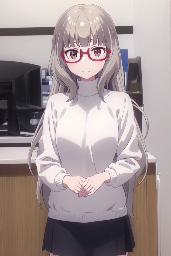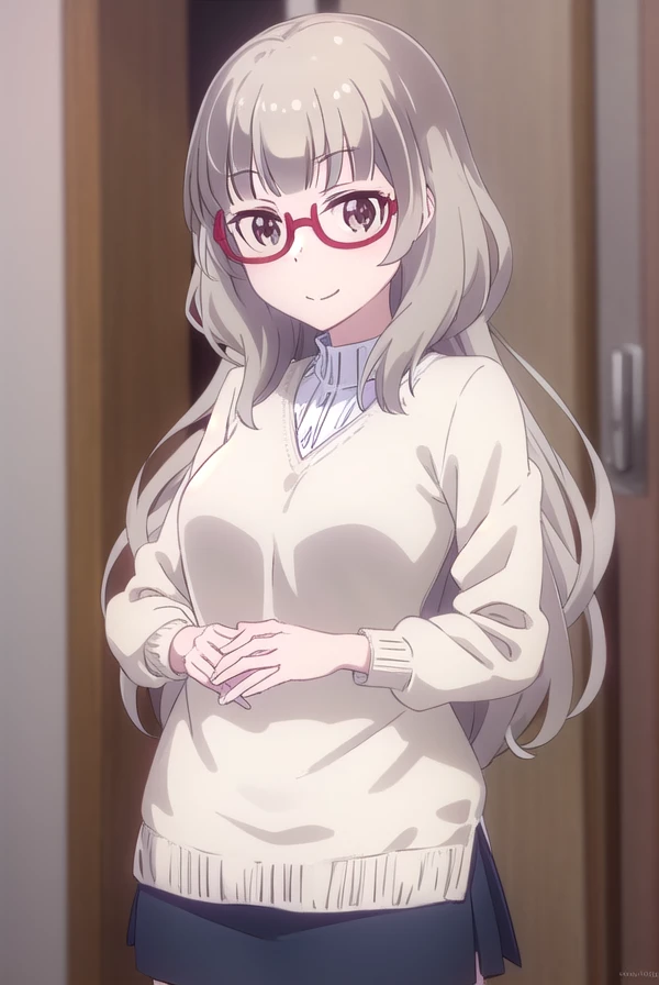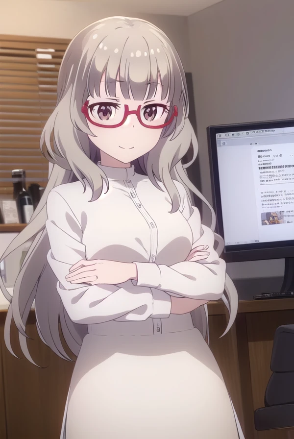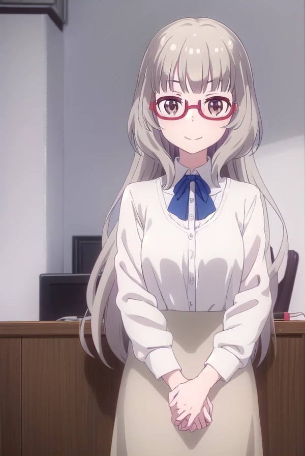 shizuku hazuki, long hair, bangs, (brown eyes:1.5), grey hair, glasses, semi-rimless eyewear, red-framed eyewear, under-rim eyewear,