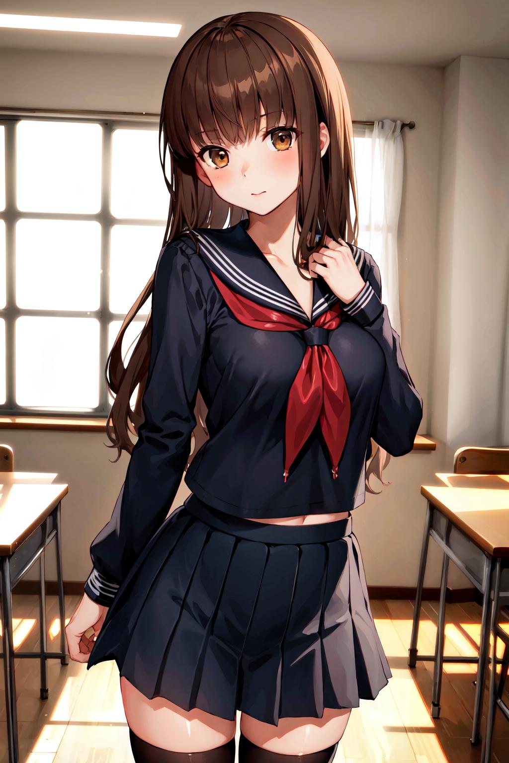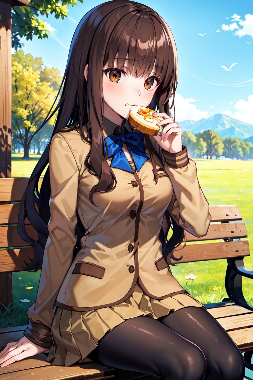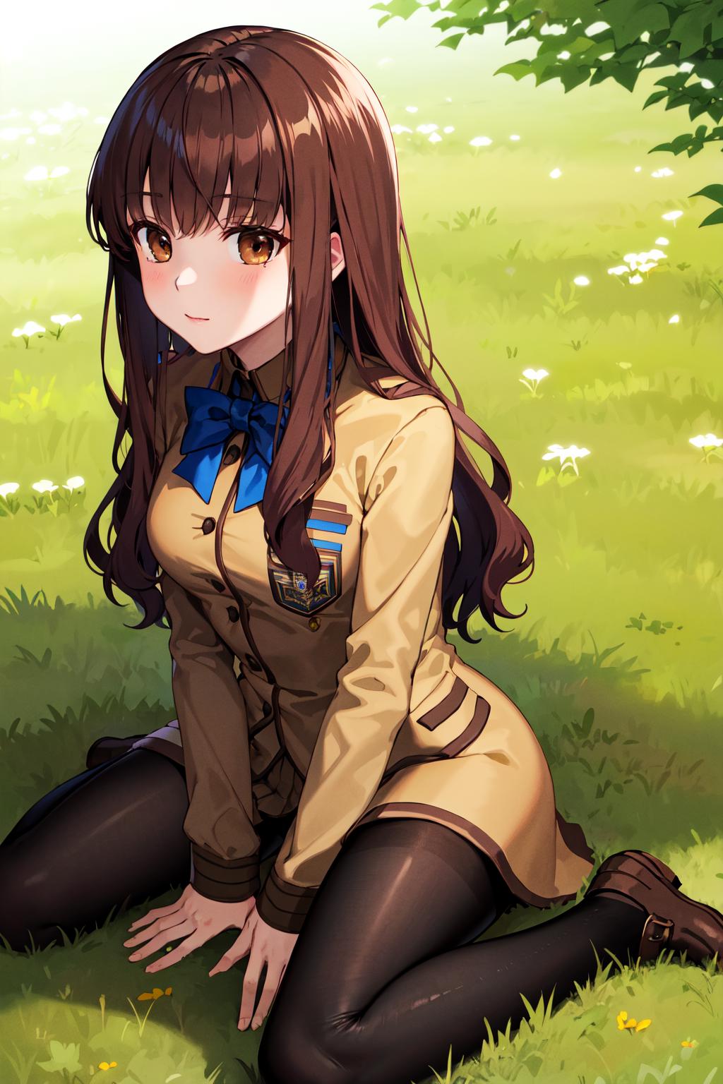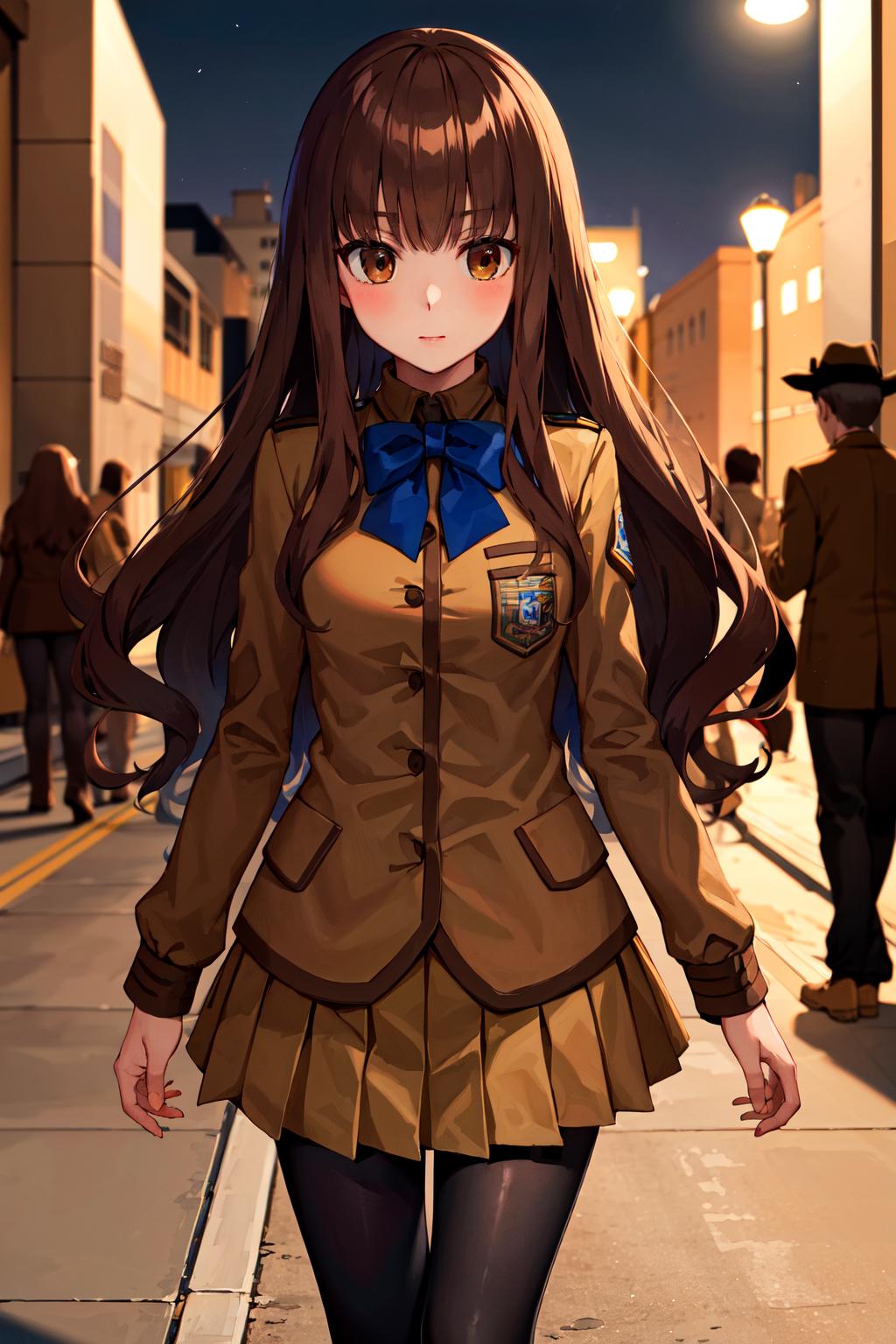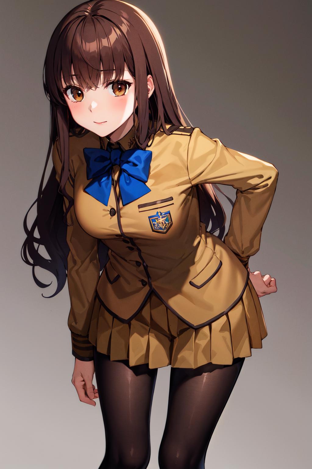 outfit1hmkh1, blue bowtie, blue bow, brown skirt, brown jacket, black pantyhose, school uniform