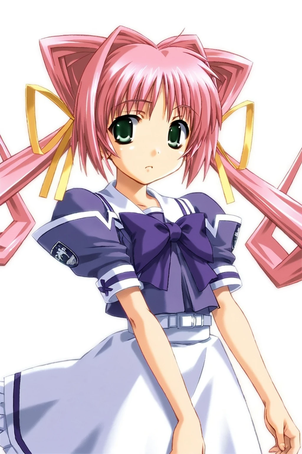 pink hair,green eyes,long hair,twintails,ribbon,hair ribbon,hair intakes,