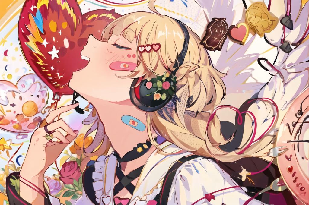 recommended prompt: Ai Kotoba, open mouth, hair ornament, closed eyes, flower, heart, food, wings, star (symbol), tattoo, profile, fruit, rose, headphones, ring, bandaid, fork, heart hair ornament, bandaid on face, balloon, bandaid on cheek, heart balloon