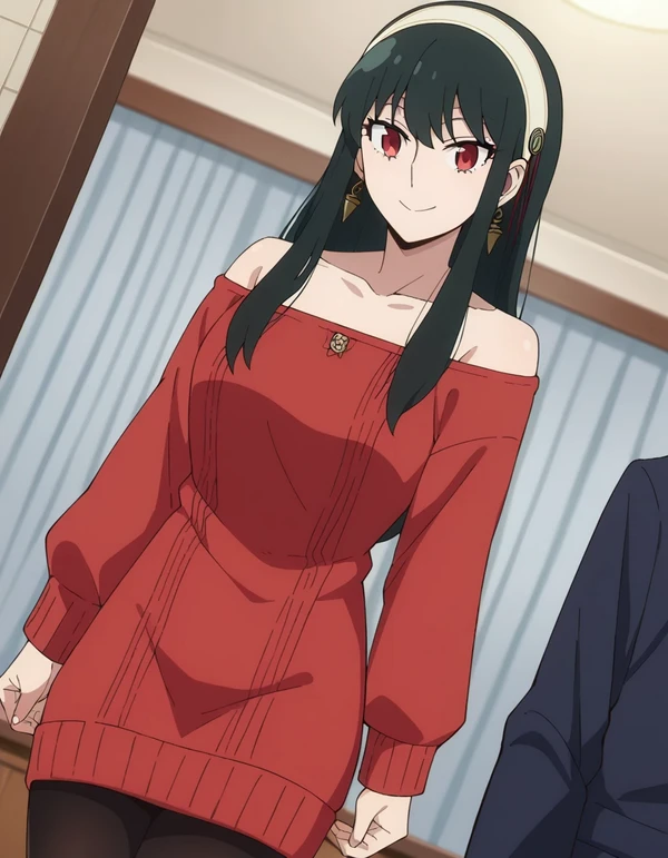 Creator: https://civitai.com/user/nochekaiser881 Lora Original: https://civitai.com/models/342830?modelVersionId=451533 Appearance: yor briar, black hair, red eyes, earrings, white hairband, hairband, long hair, sidelocks, Outfit: bare shoulders, collarbone, dress, long sleeves, off shoulder, off-shoulder dress, off-shoulder sweater, pantyhose, red sweater, sweater, sweater dress, thighs, skirt, shirt, long sleeves, white shirt, earrings, collared shirt, vest, green skirt, pencil skirt, office lady, green vest, coat, trench coat, dress, cleavage, bare shoulders, jewelry, collarbone, sleeveless, black dress, halterneck, headband, white headband,