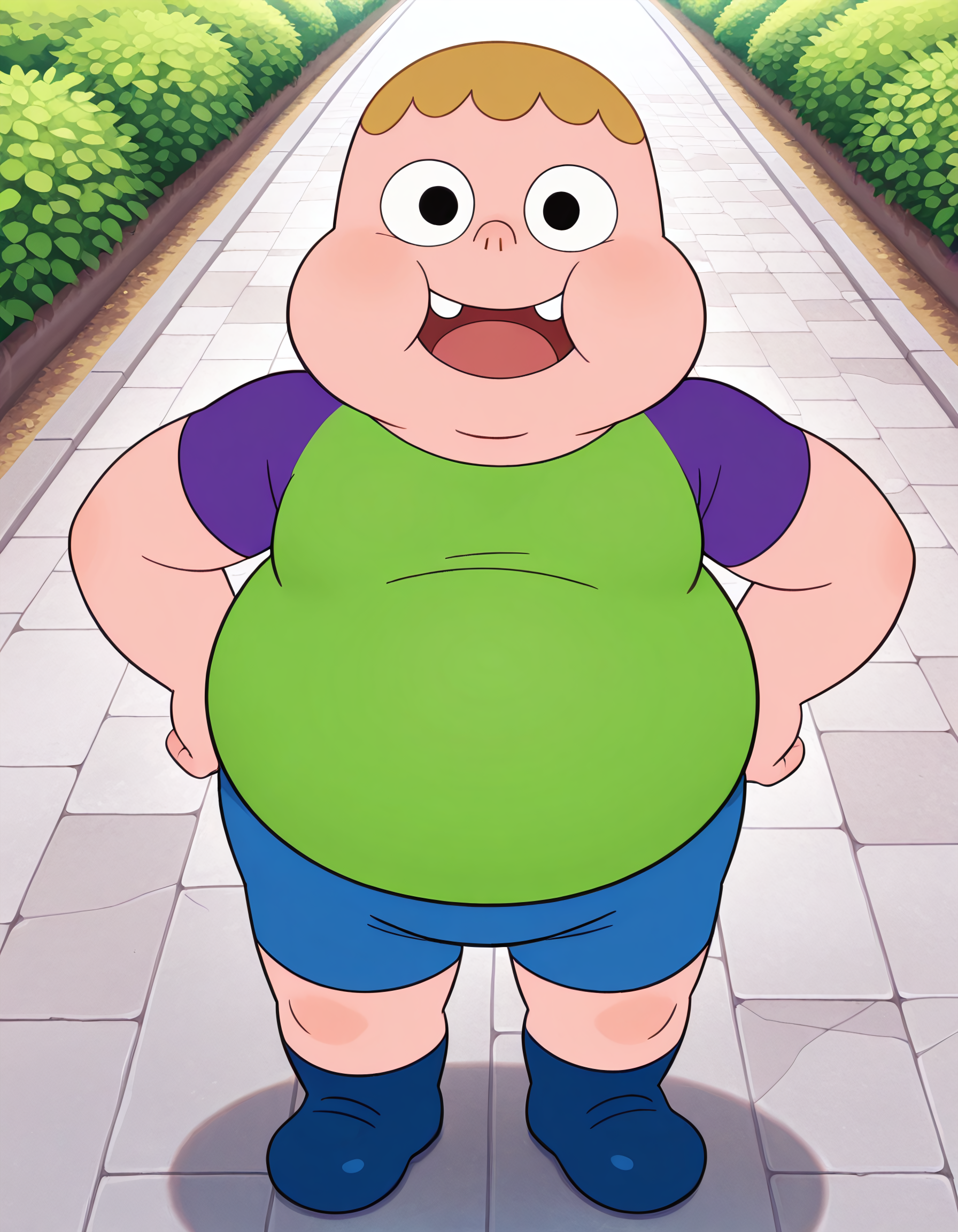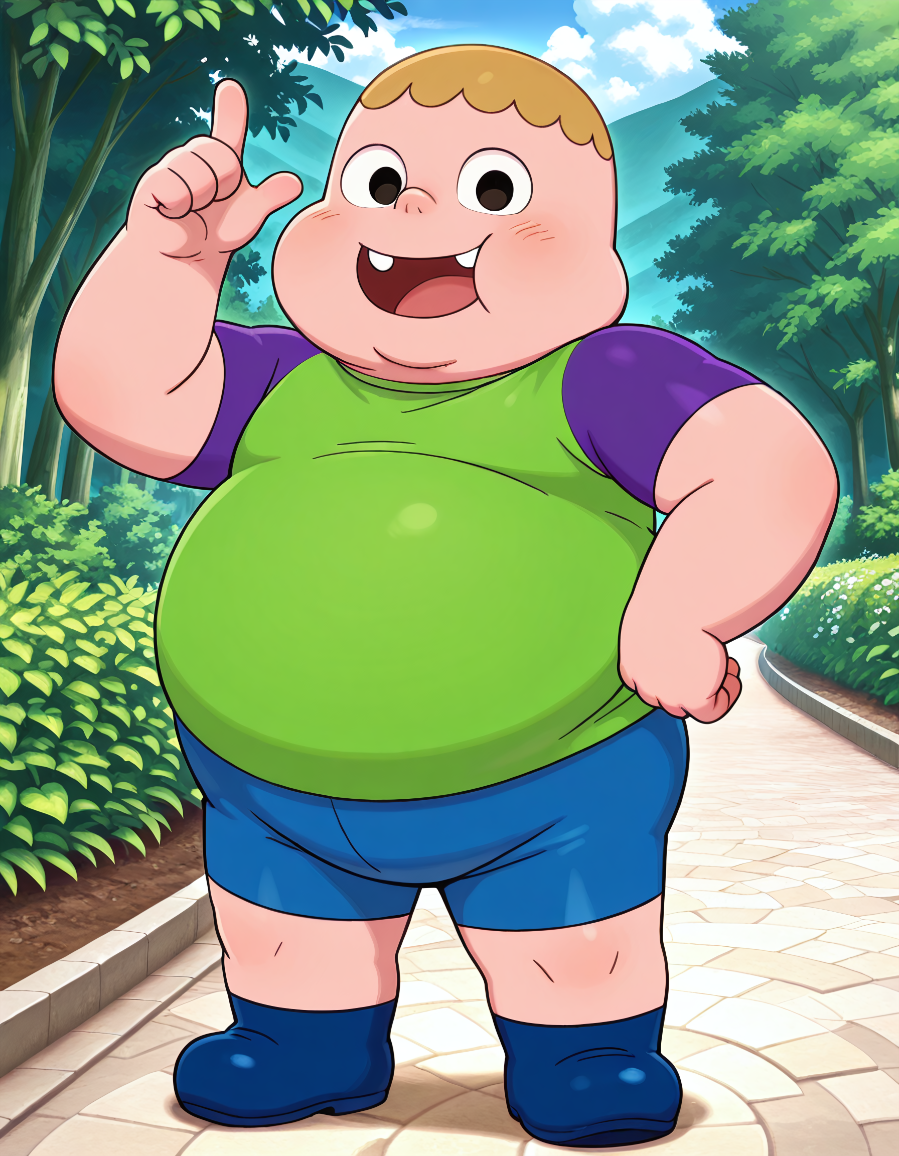 Clarence, 1boy, male focus, plump, fat, chubby, obese, earless, no ears, two teeth, young, short, blonde hair