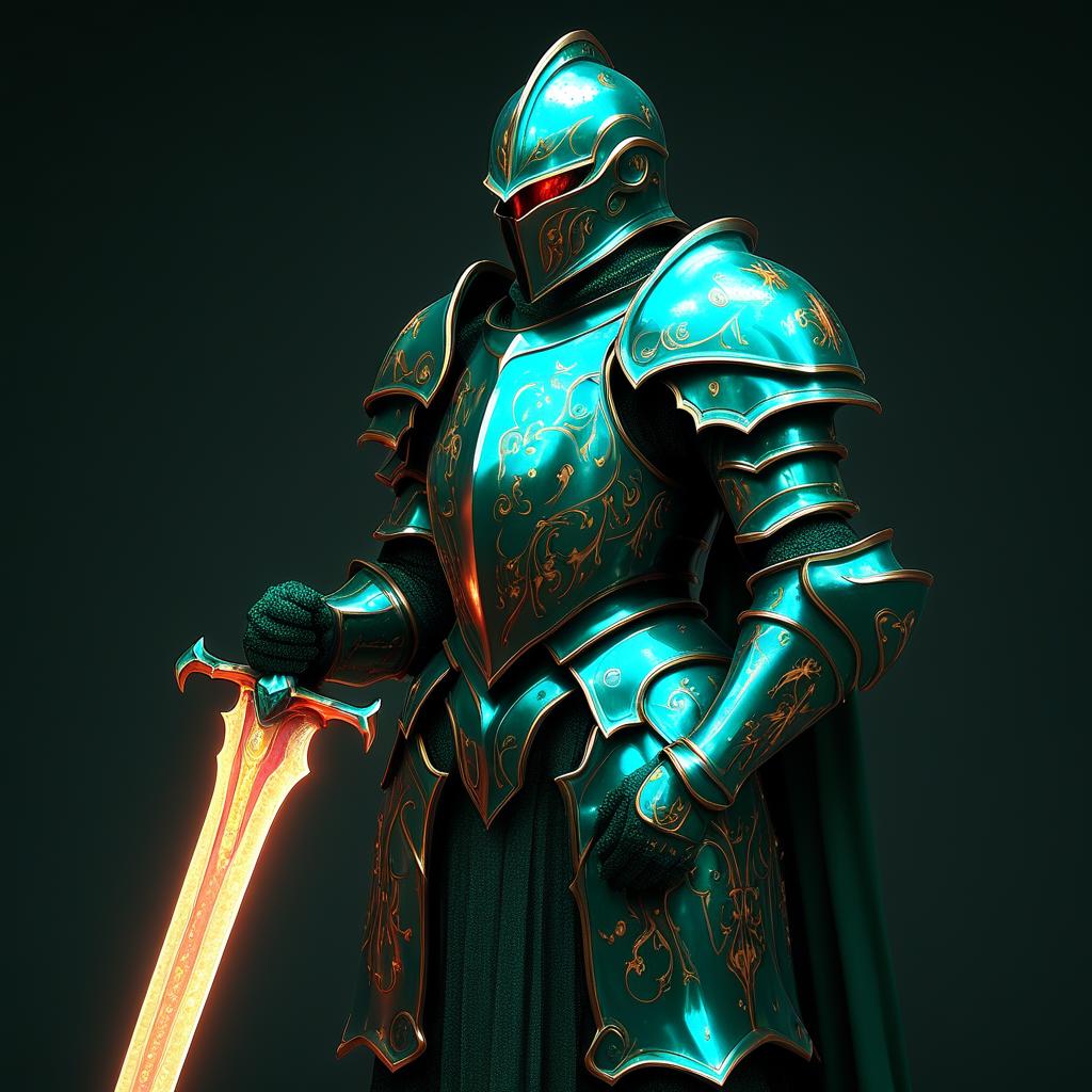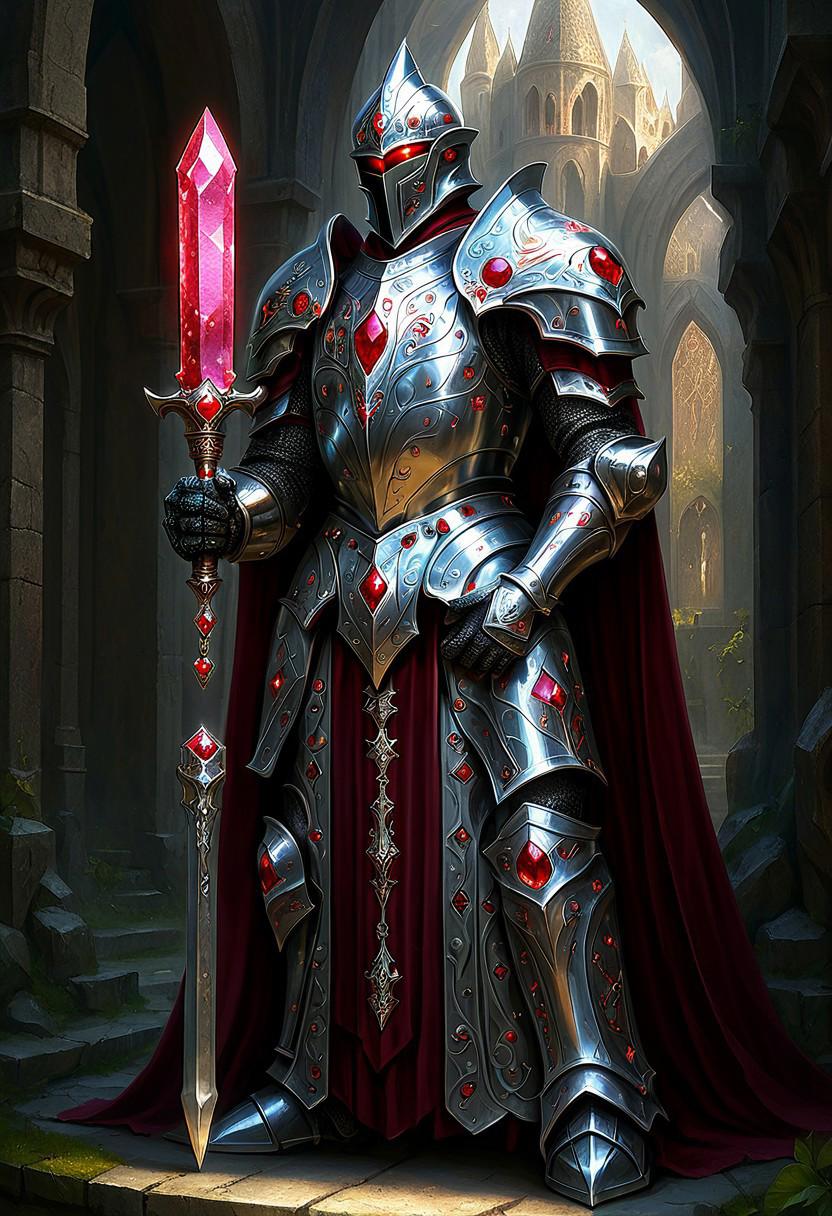 a knight in polished silver armor, adorned with glowing gemstones, infusedglow, cinematic lighting, fantasy art a crystal scepter glowing with magical energy, embedded in ancient stone, infusedglow, ultra-detailed a treasure hoard of gold coins, relics, and magical gemstones, infusedglow, intricate highlights