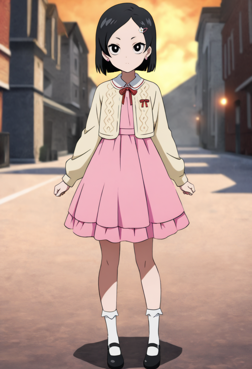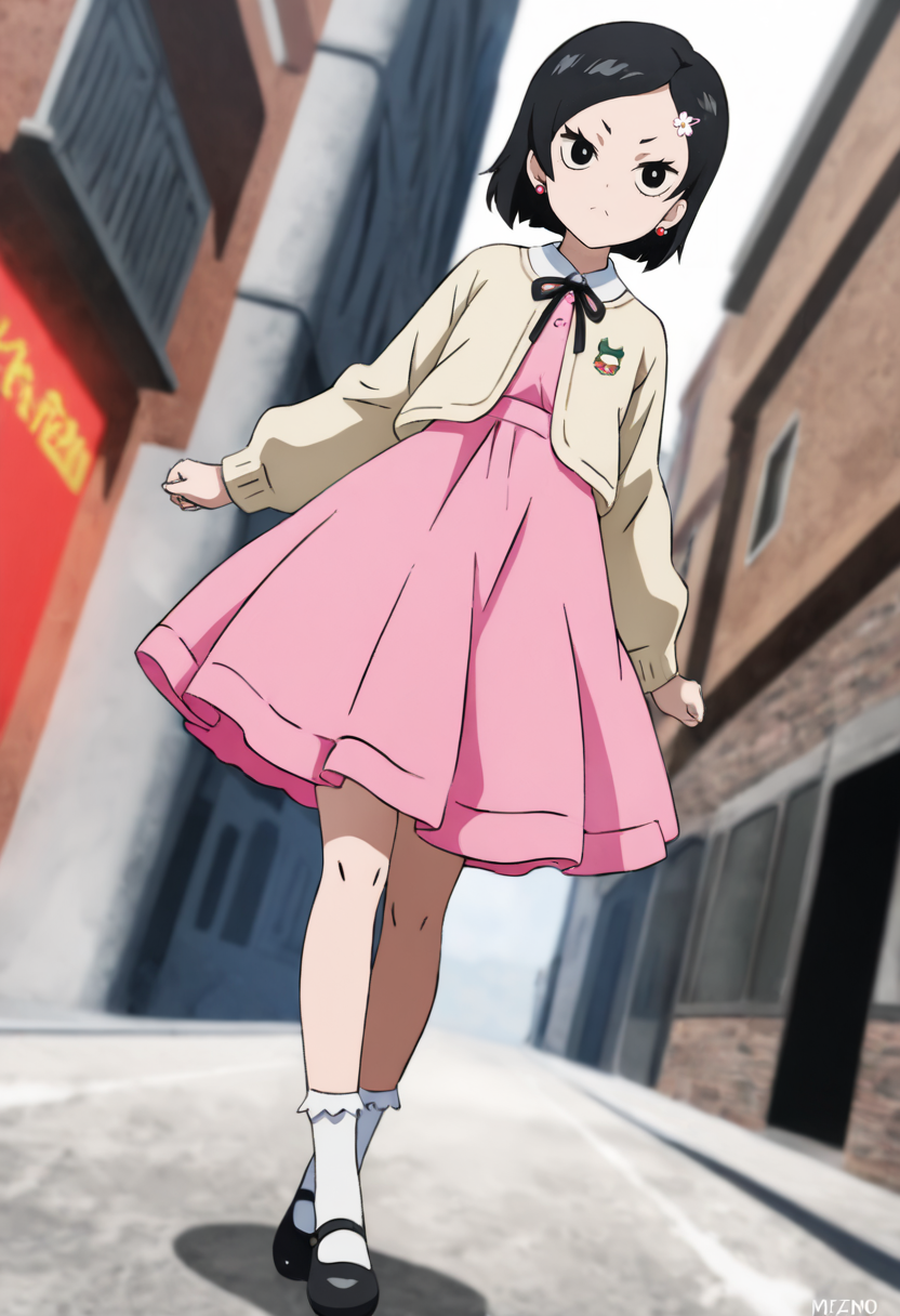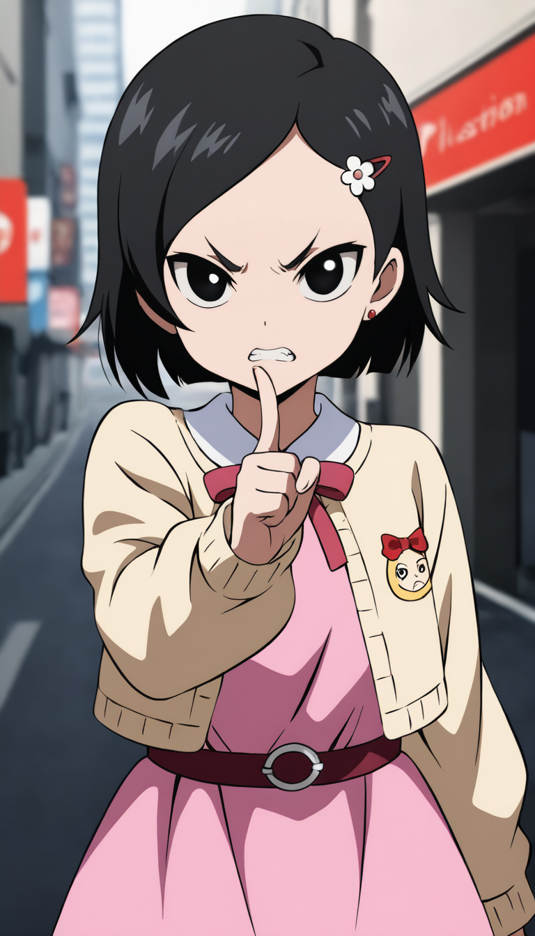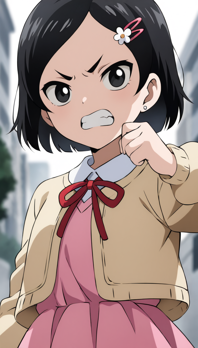 opmzenko, 1girl, black hair, short hair, black eyes, hair ornament, hairclip,